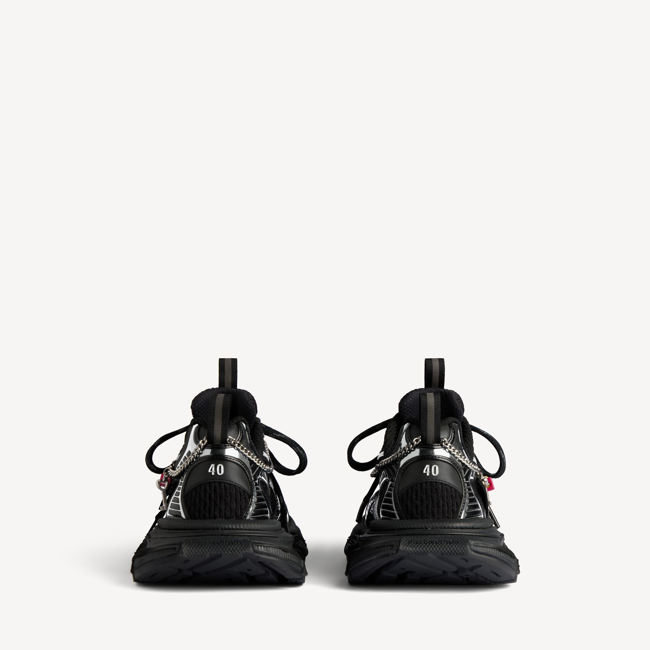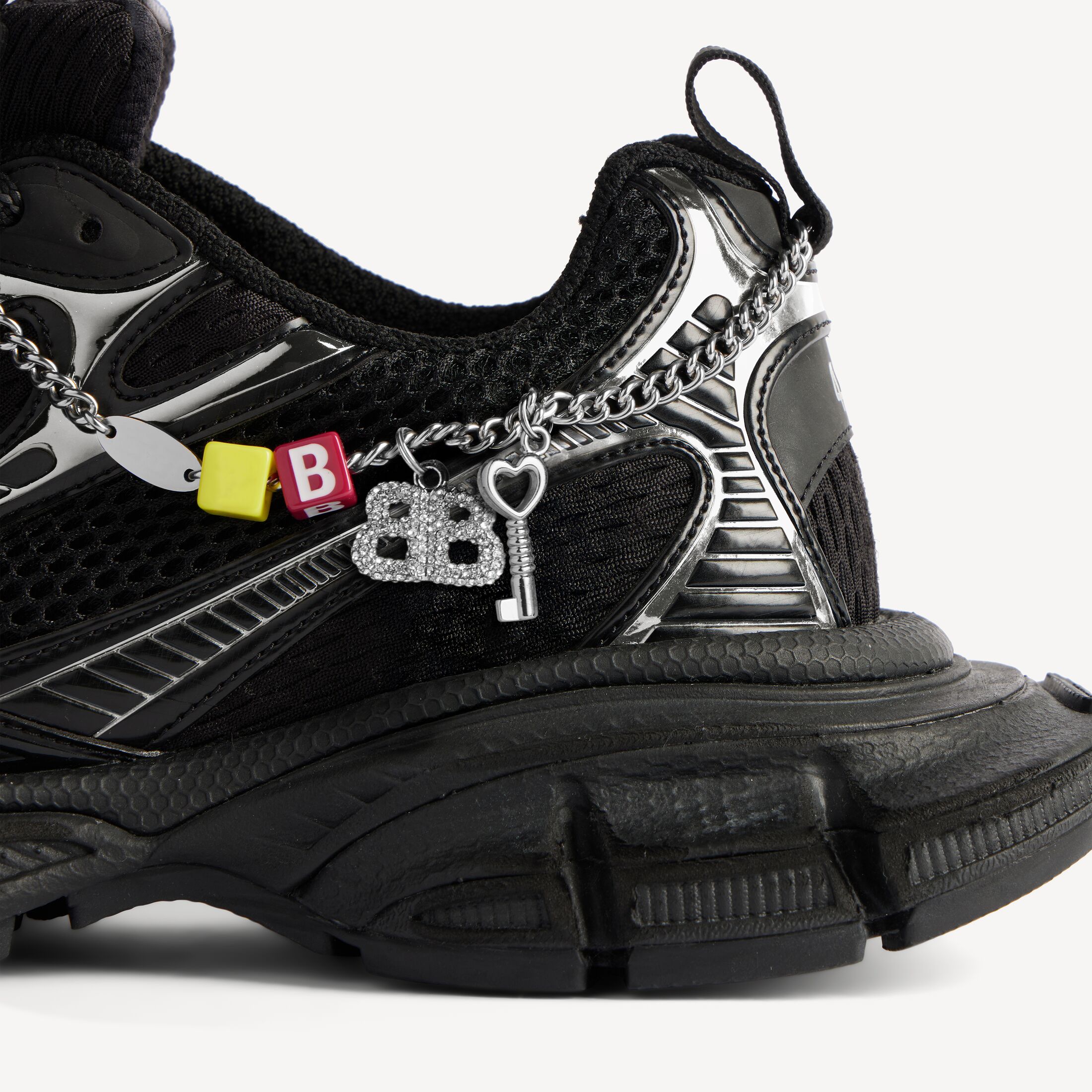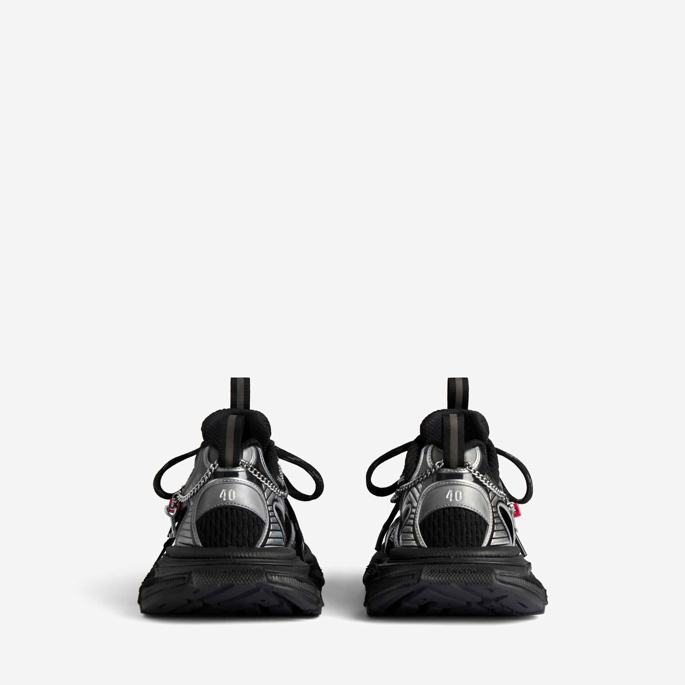 • 鞋面点缀做旧银色饰链和挂饰