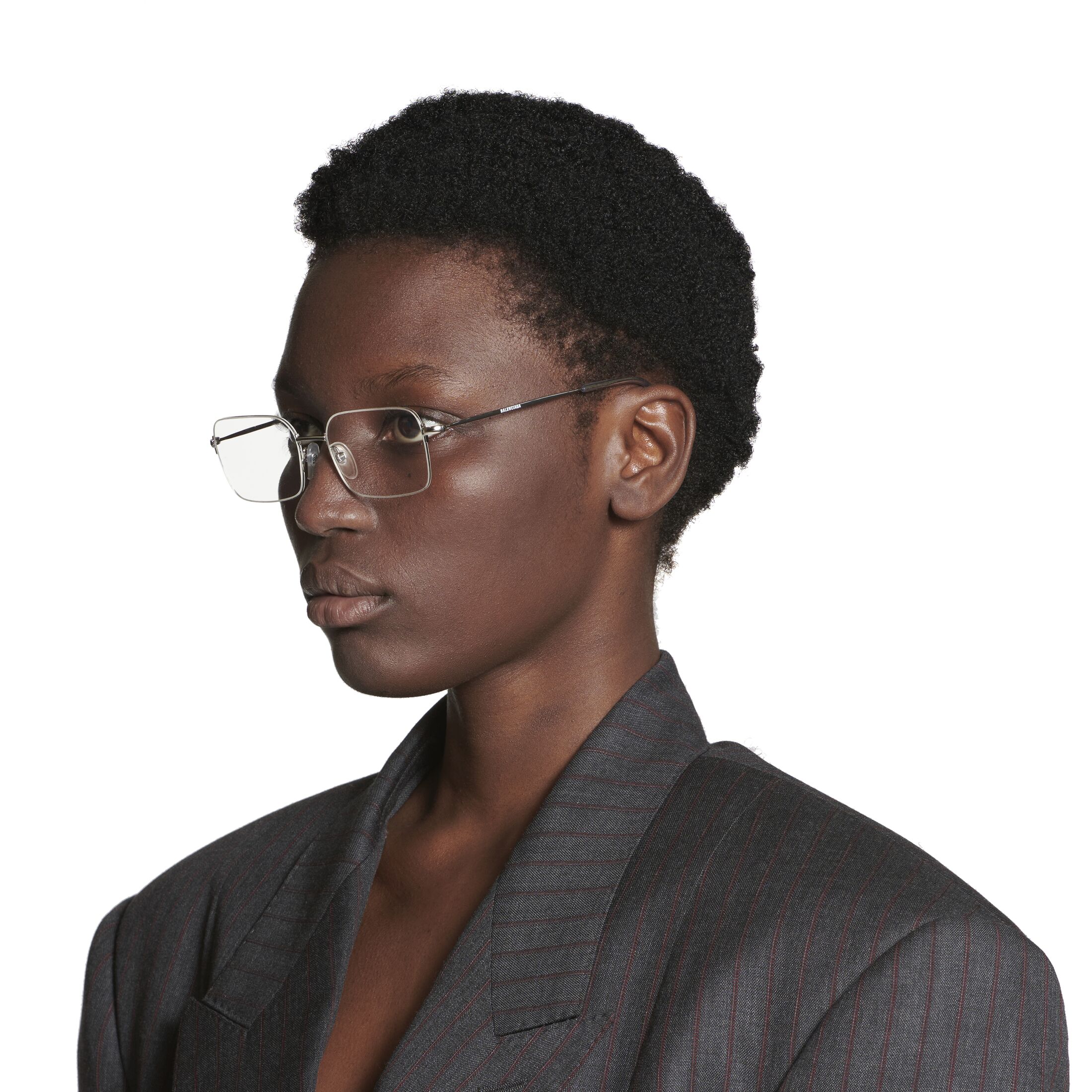 Invisible Rectangle银色金属太阳镜,搭配透明镜片,亮相于Balenciaga 2023冬季系列多款造型中。此商品支持花呗分期• 镜腿长度:14.9厘米