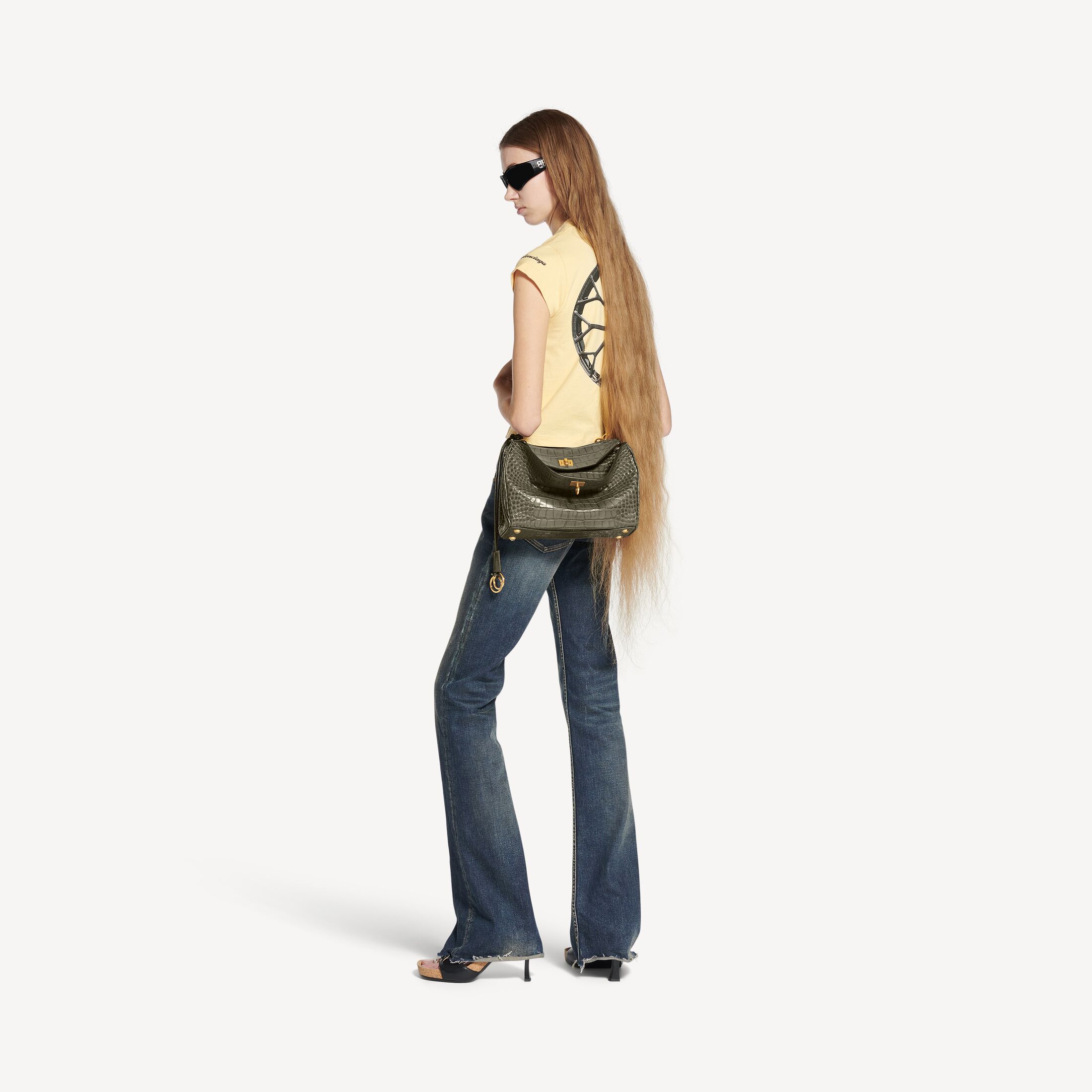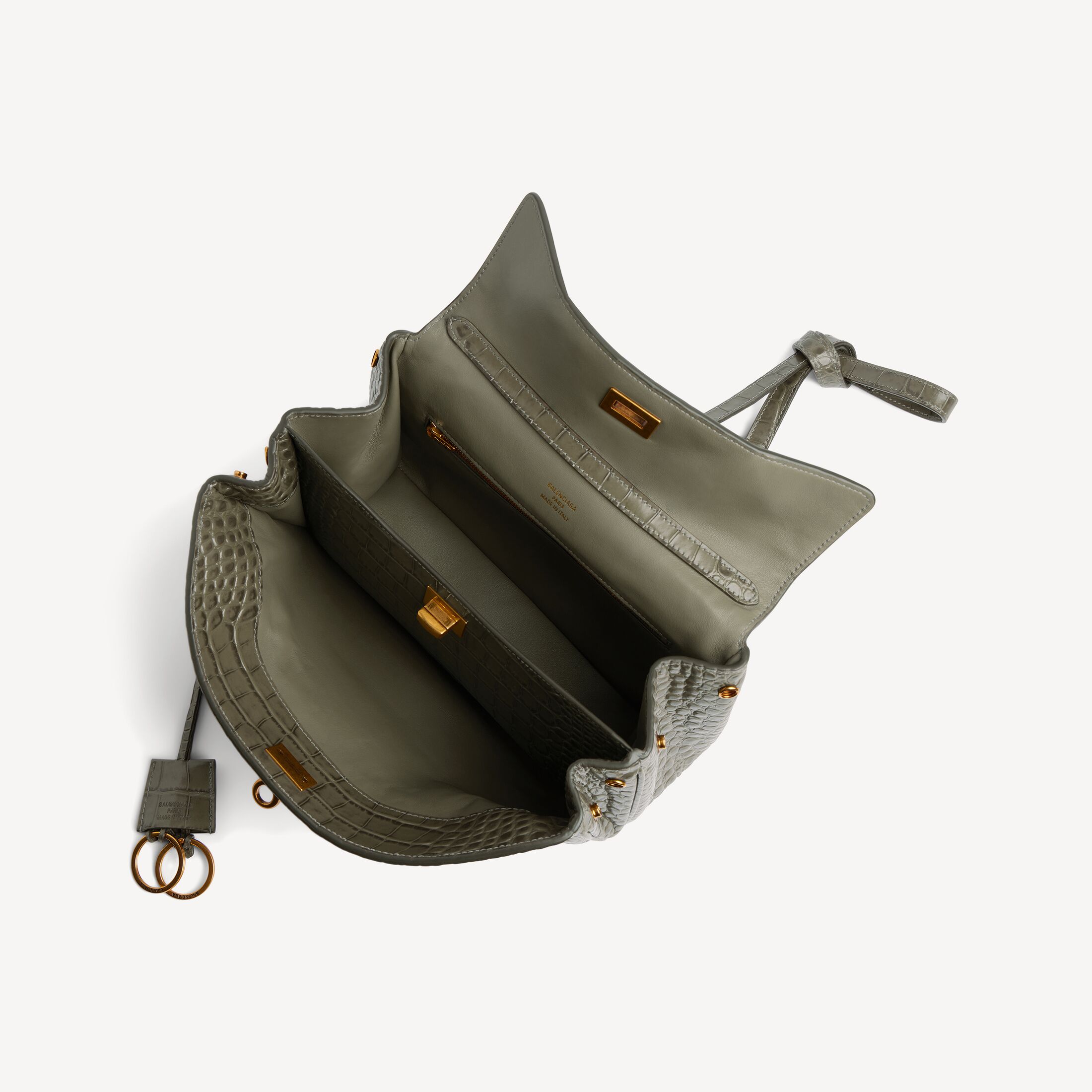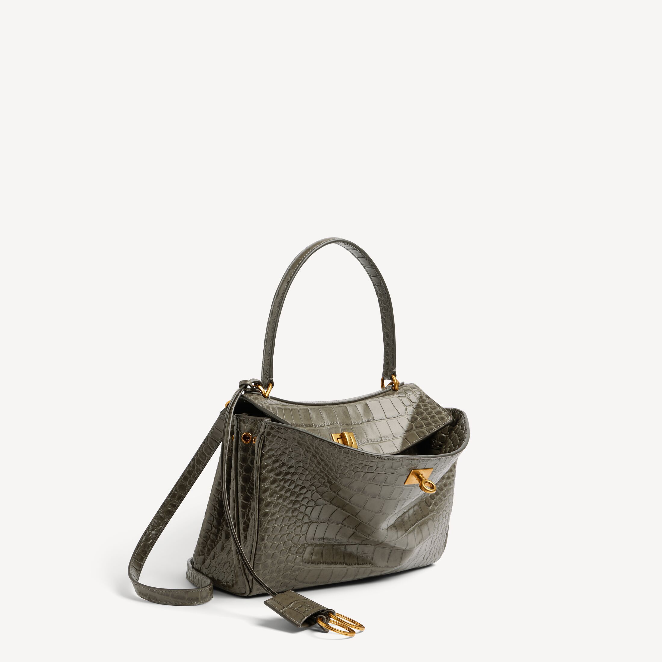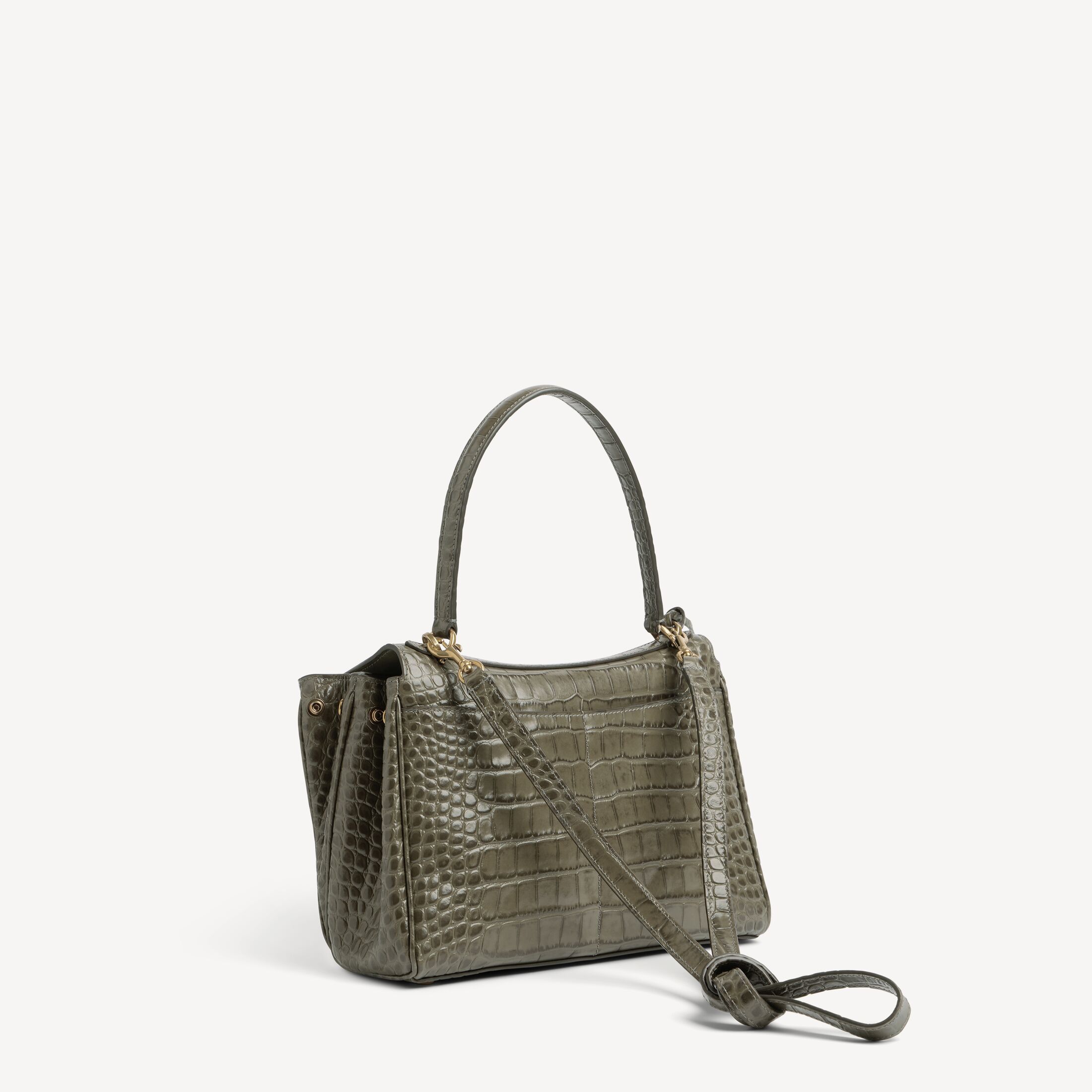 Rodeo军绿色鳄鱼纹压纹牛皮革小号手提包,饰以做旧金色金属配件此商品支持花呗分期• 鳄鱼纹压纹牛皮革