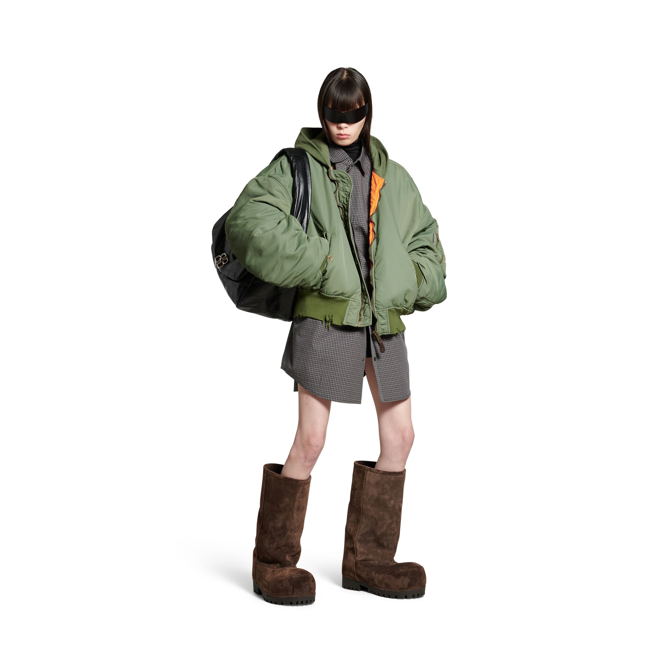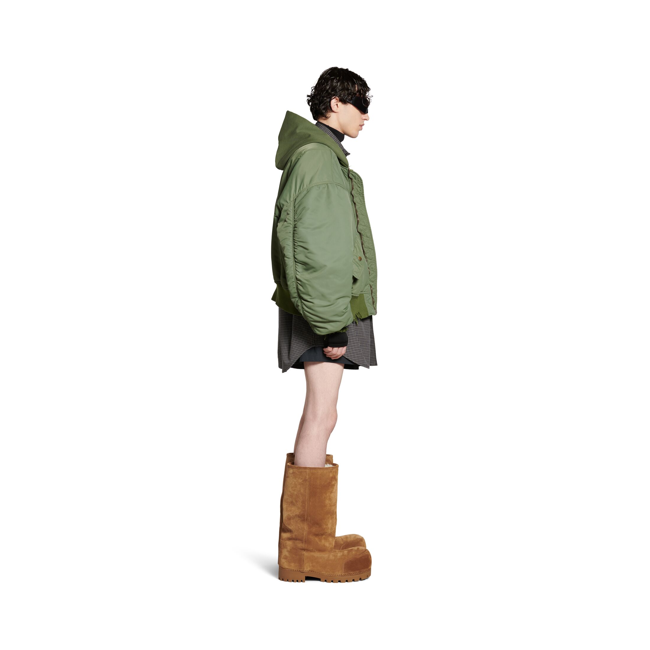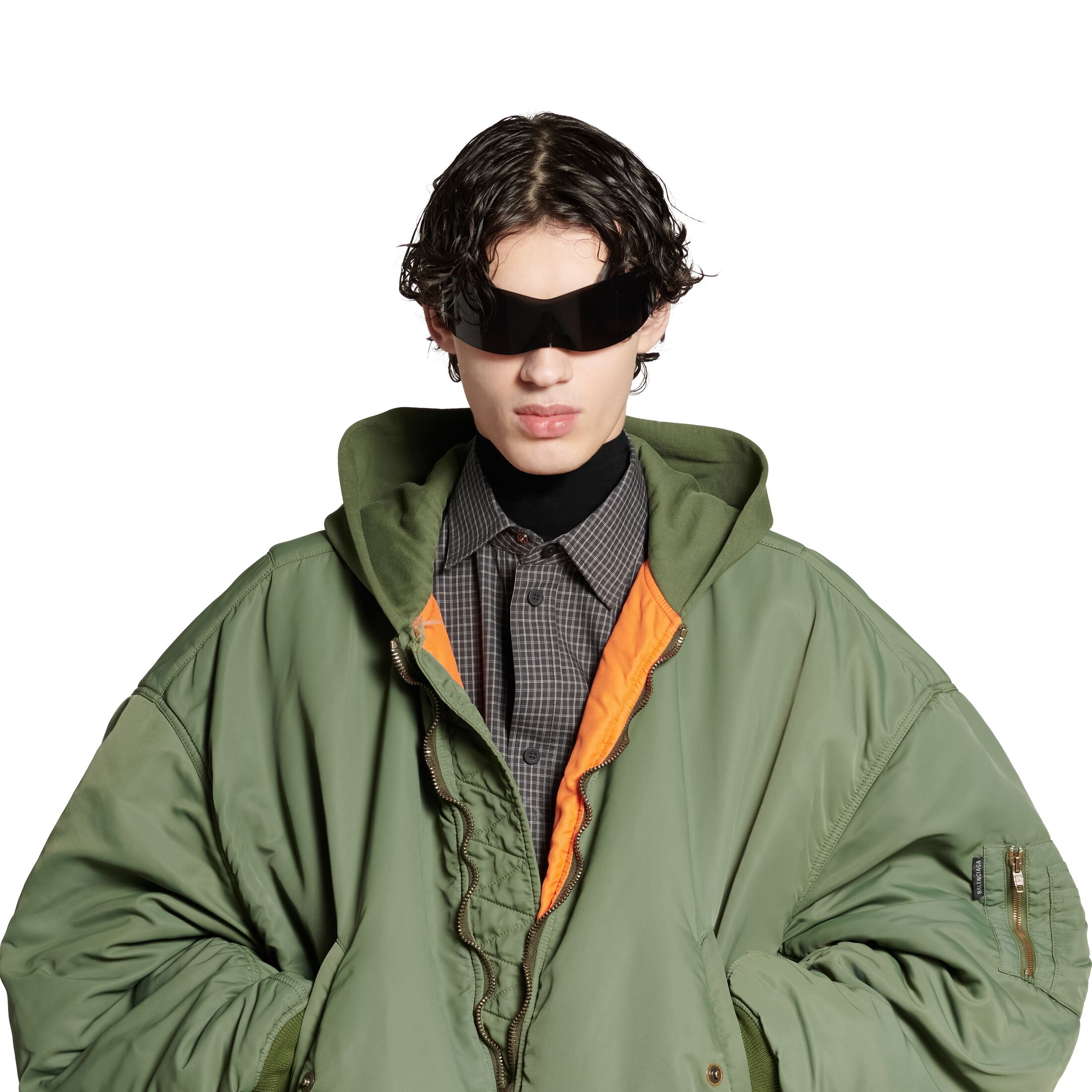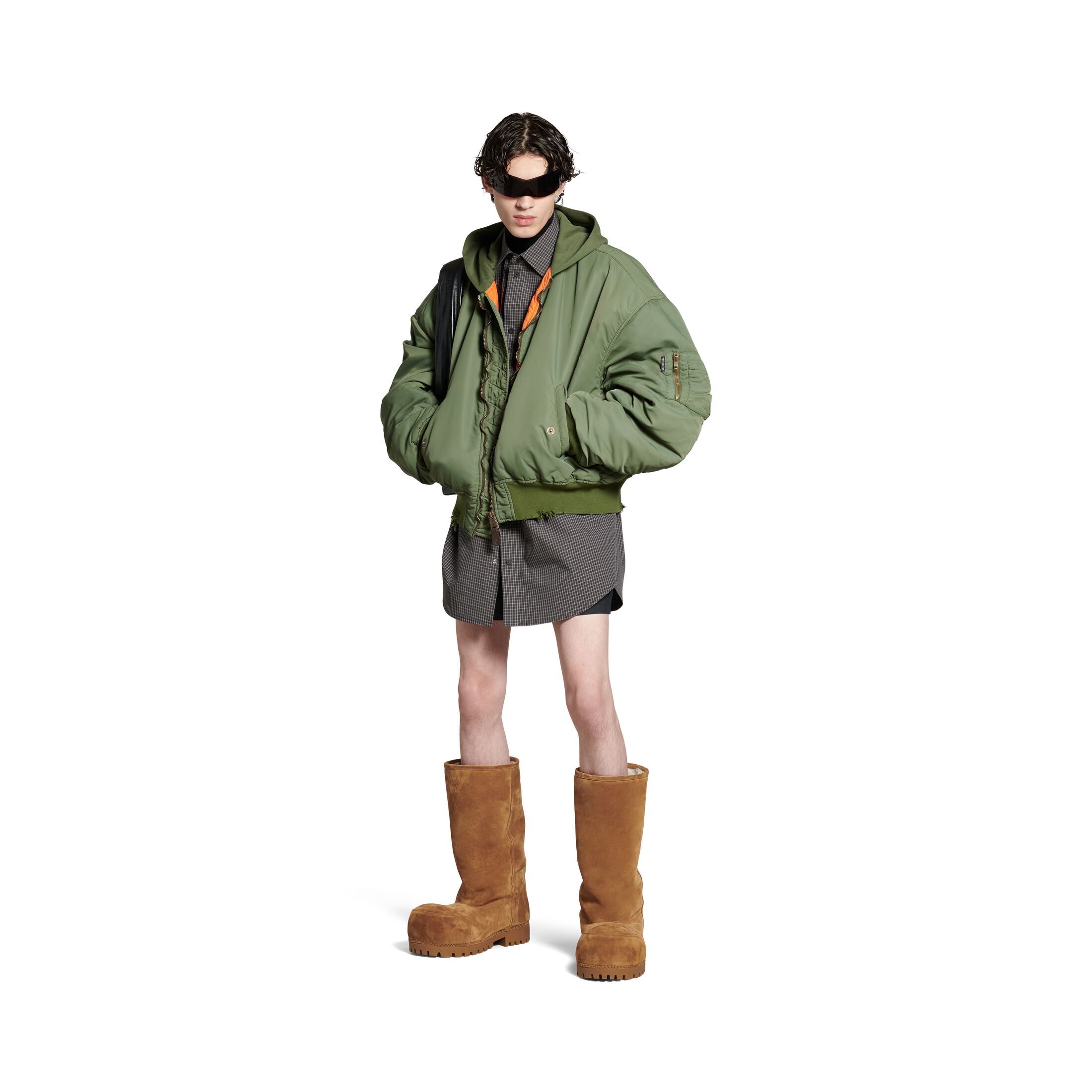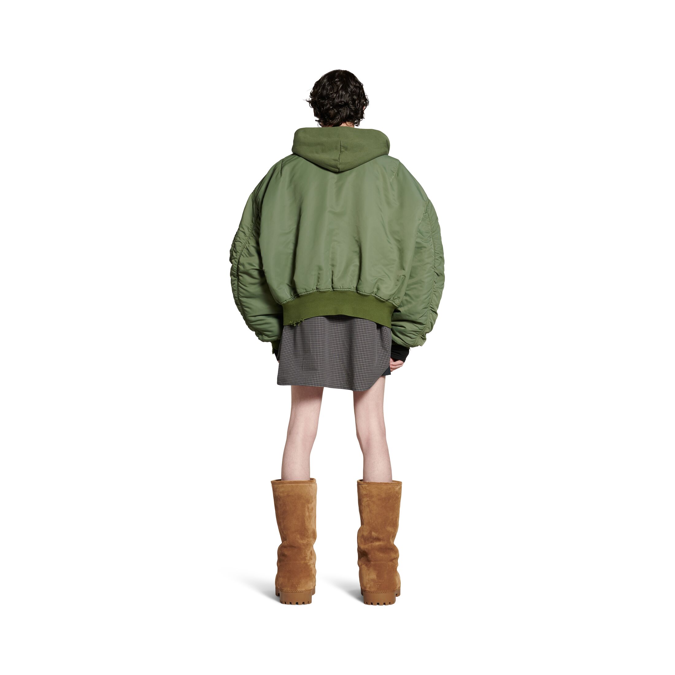深绿色植物染色尼龙飞行员夹克,亮相于Balenciaga 2024秋季系列Look 28。此商品支持花呗分期尺码 (法国)