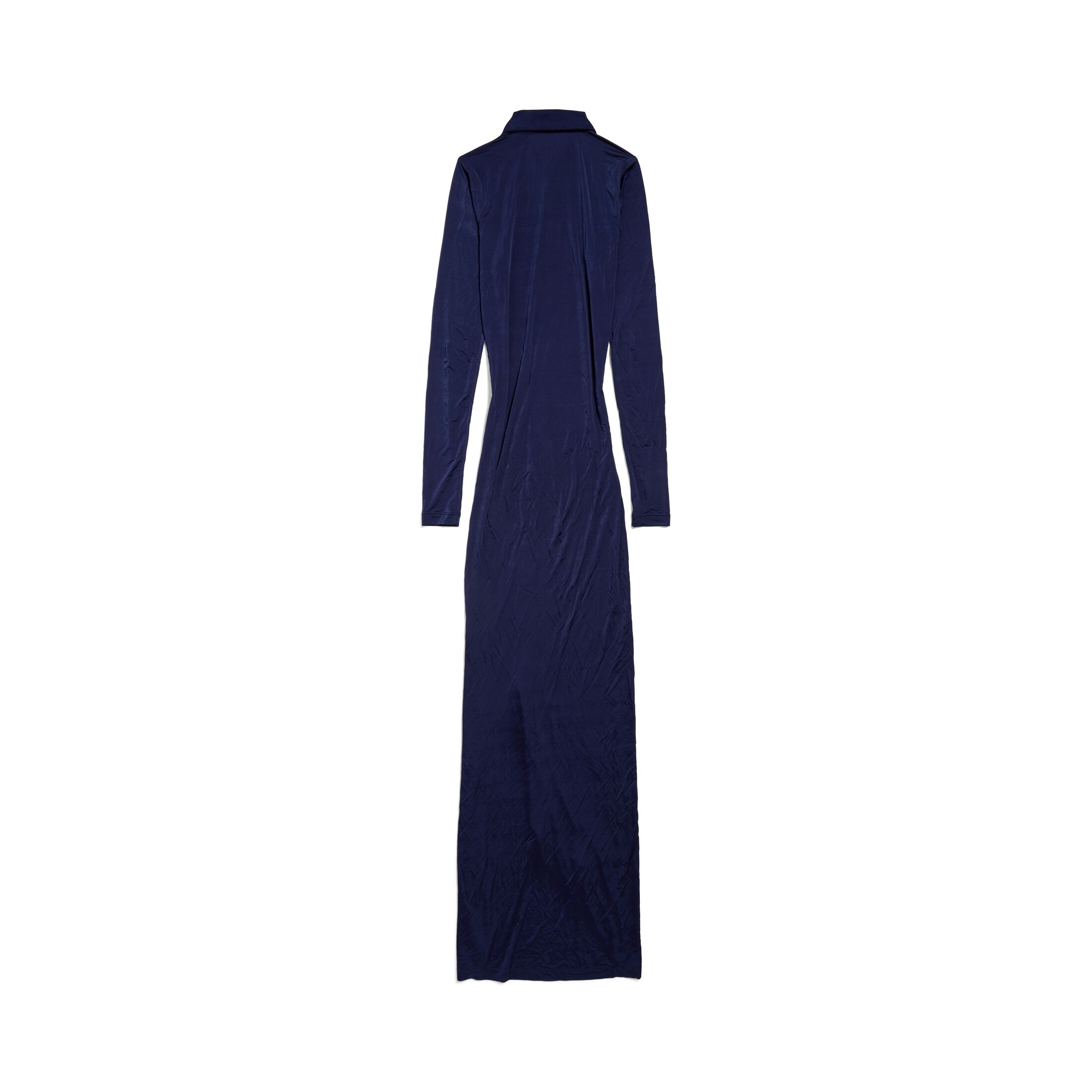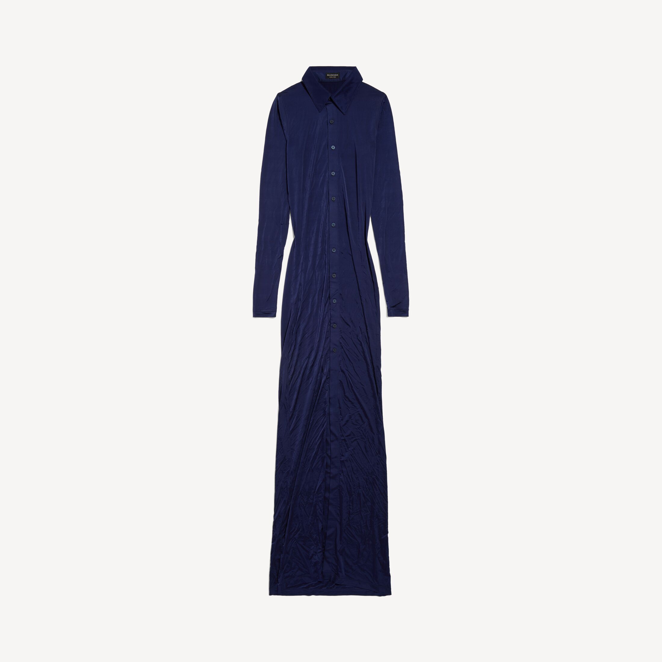 海军蓝垂坠平纹针织弹力超长连衣裙,亮相于Balenciaga 2025春季系列Look 46。此商品支持花呗分期