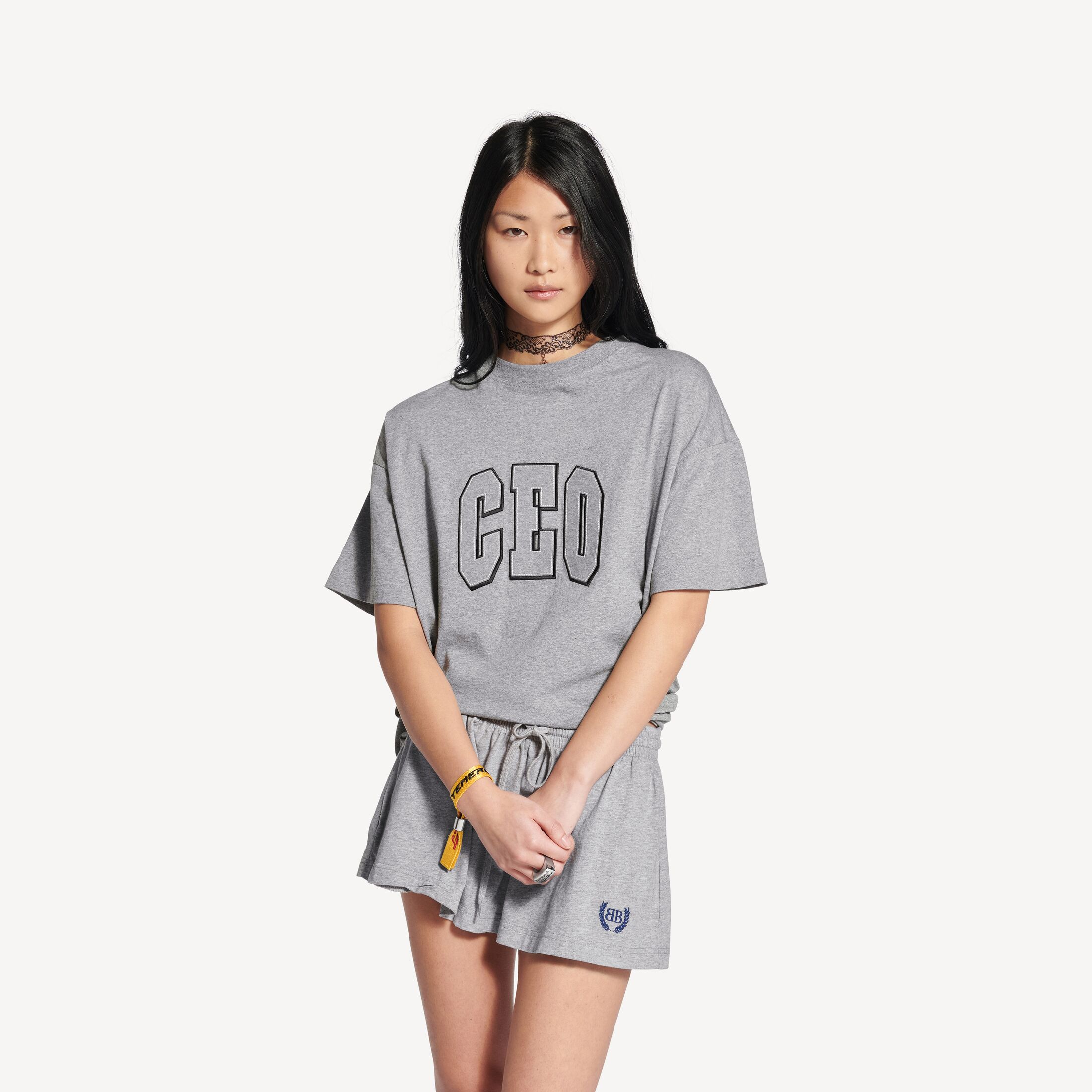 CEO Team Logo Boxy男女同款杂灰色平纹针织T恤,亮相于2025秋季系列Look 52。此商品支持花呗分期尺码 (法国)