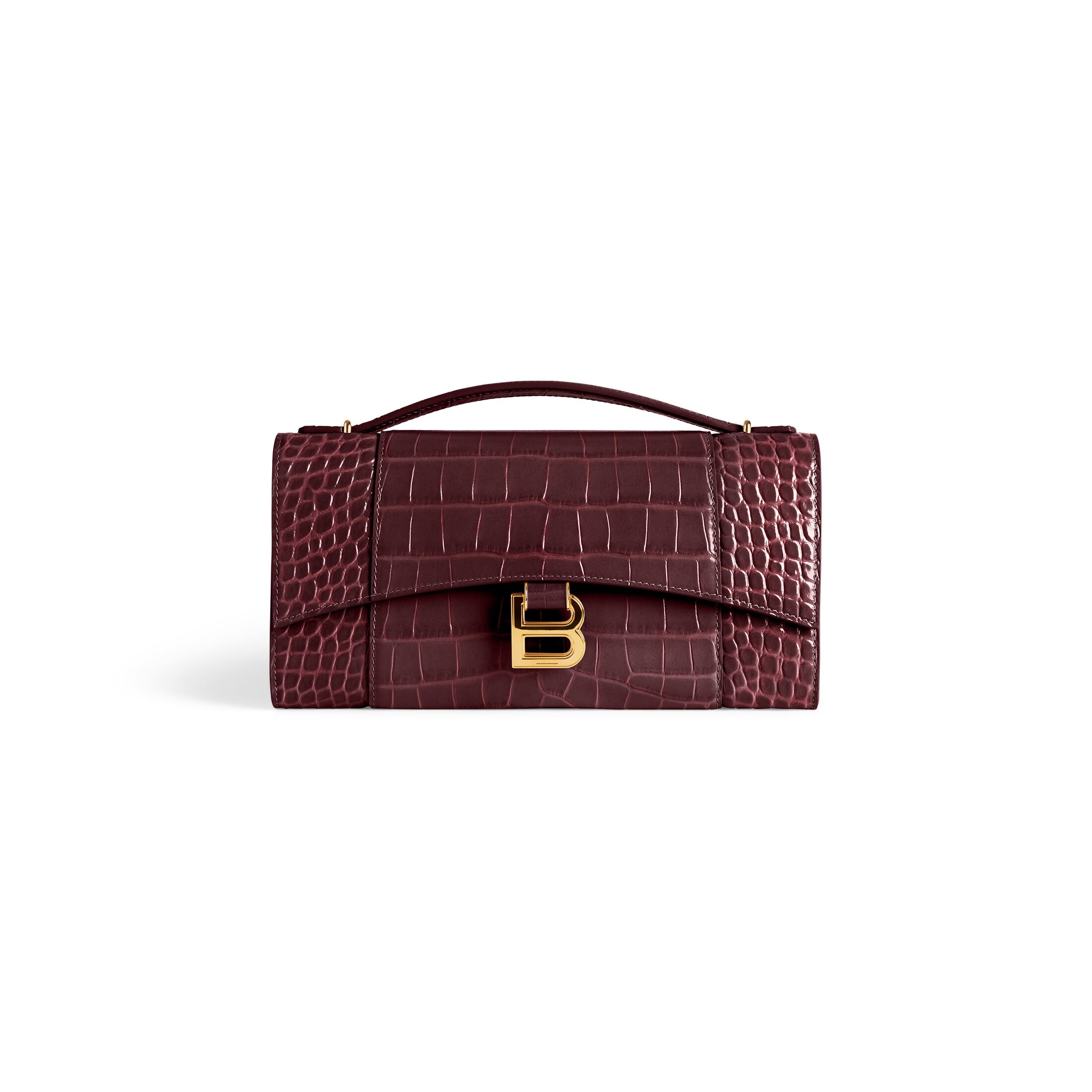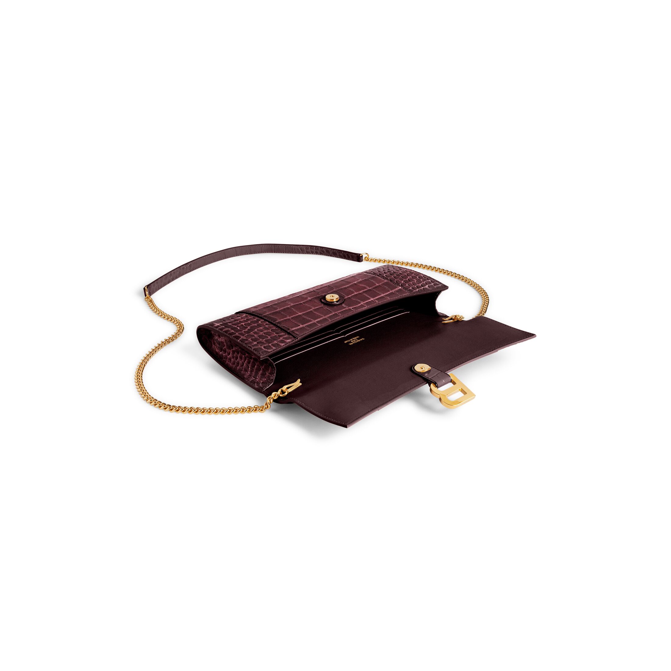 Hourglass深酒红色柔软鳄鱼纹压纹牛皮革饰链手拿包,饰以闪亮金色金属配件 此商品支持花呗分期• 尺寸:长25.9 x 高17 x 宽4.3厘米
