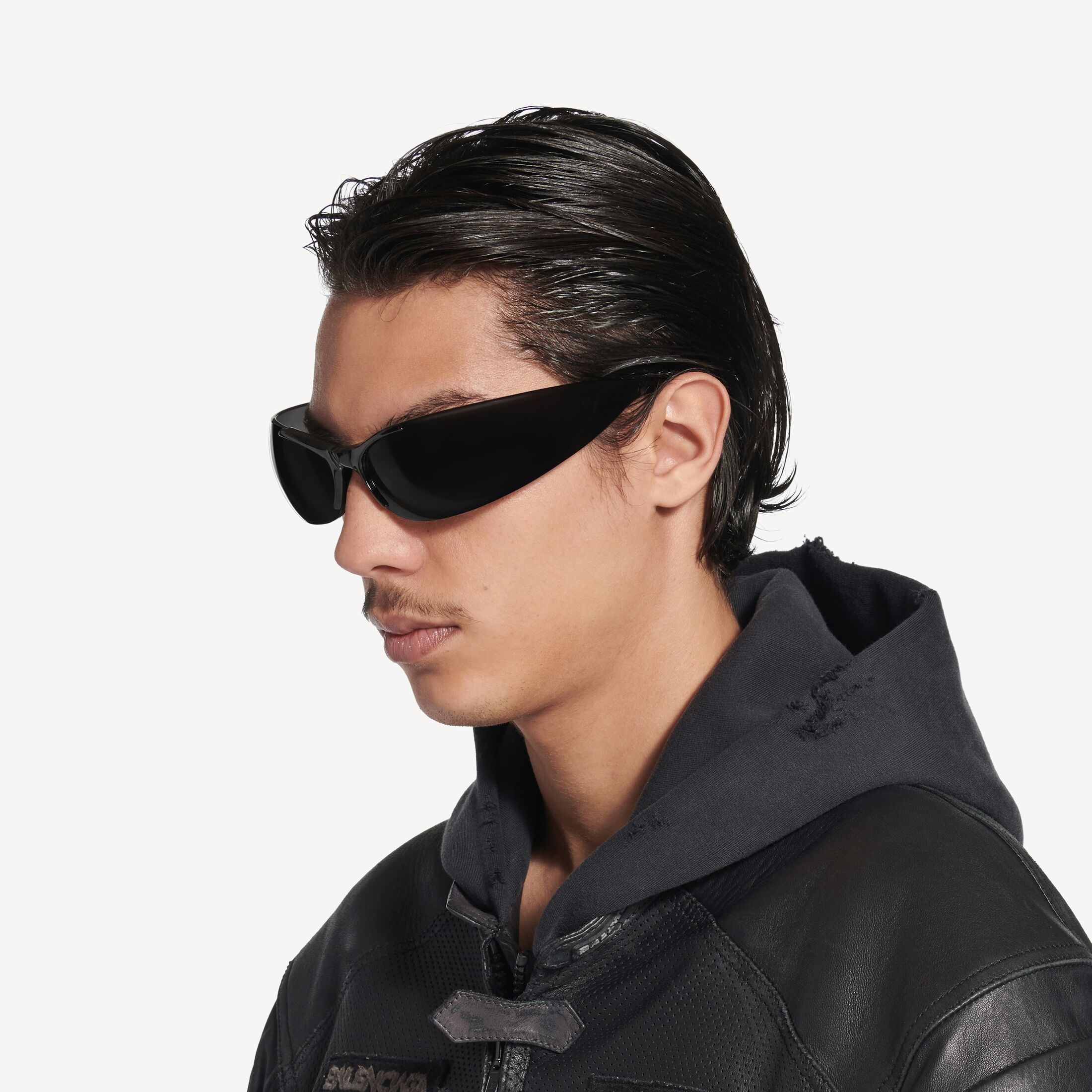 Afterhour Oval黑色生物基注塑尼龙太阳镜,搭配灰色镜片,亮相于Balenciaga 2025秋季系列多款造型中。 此商品支持花呗分期