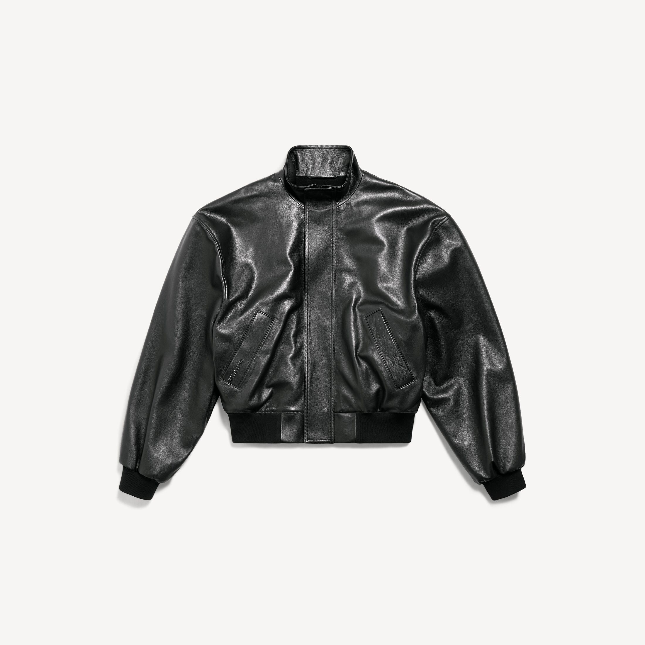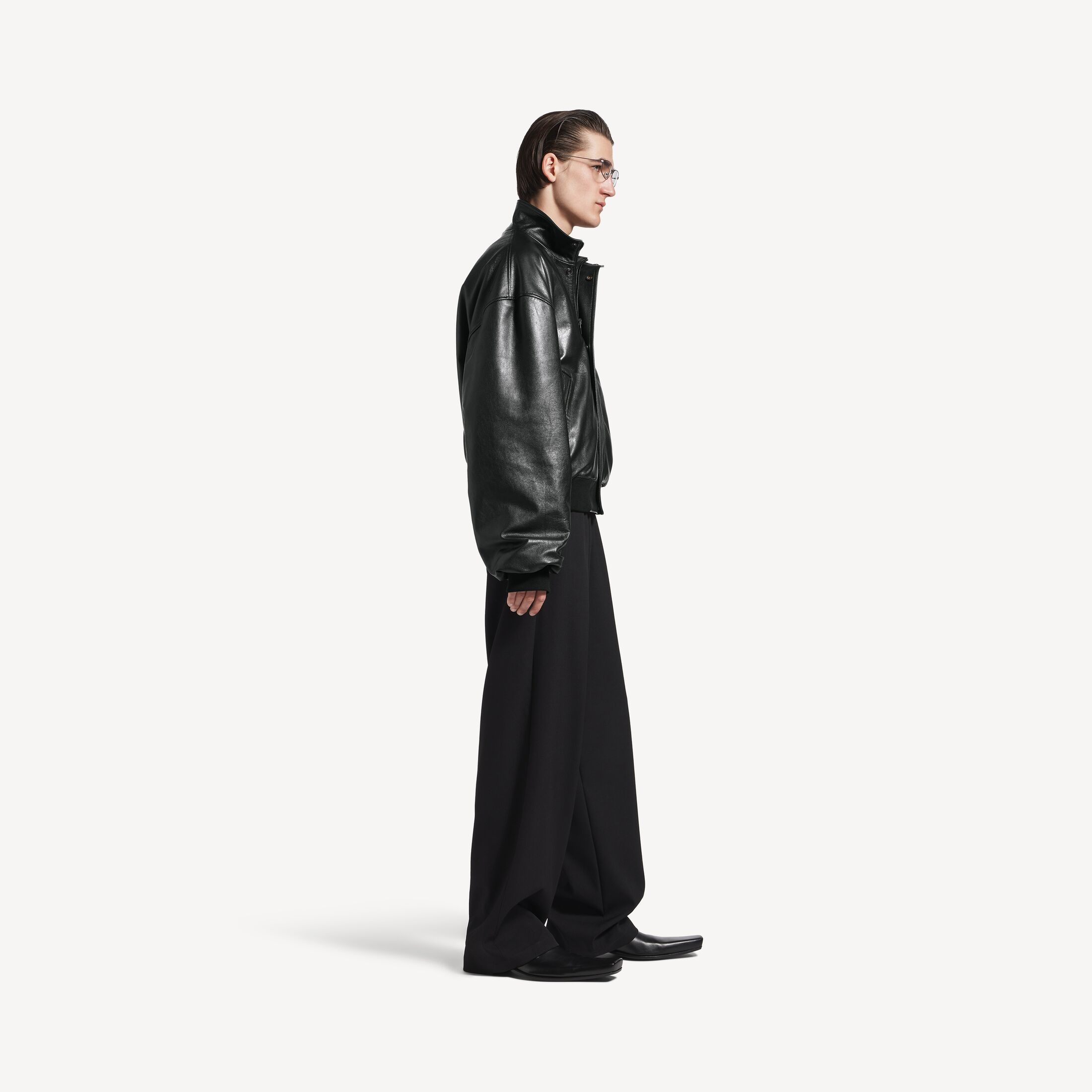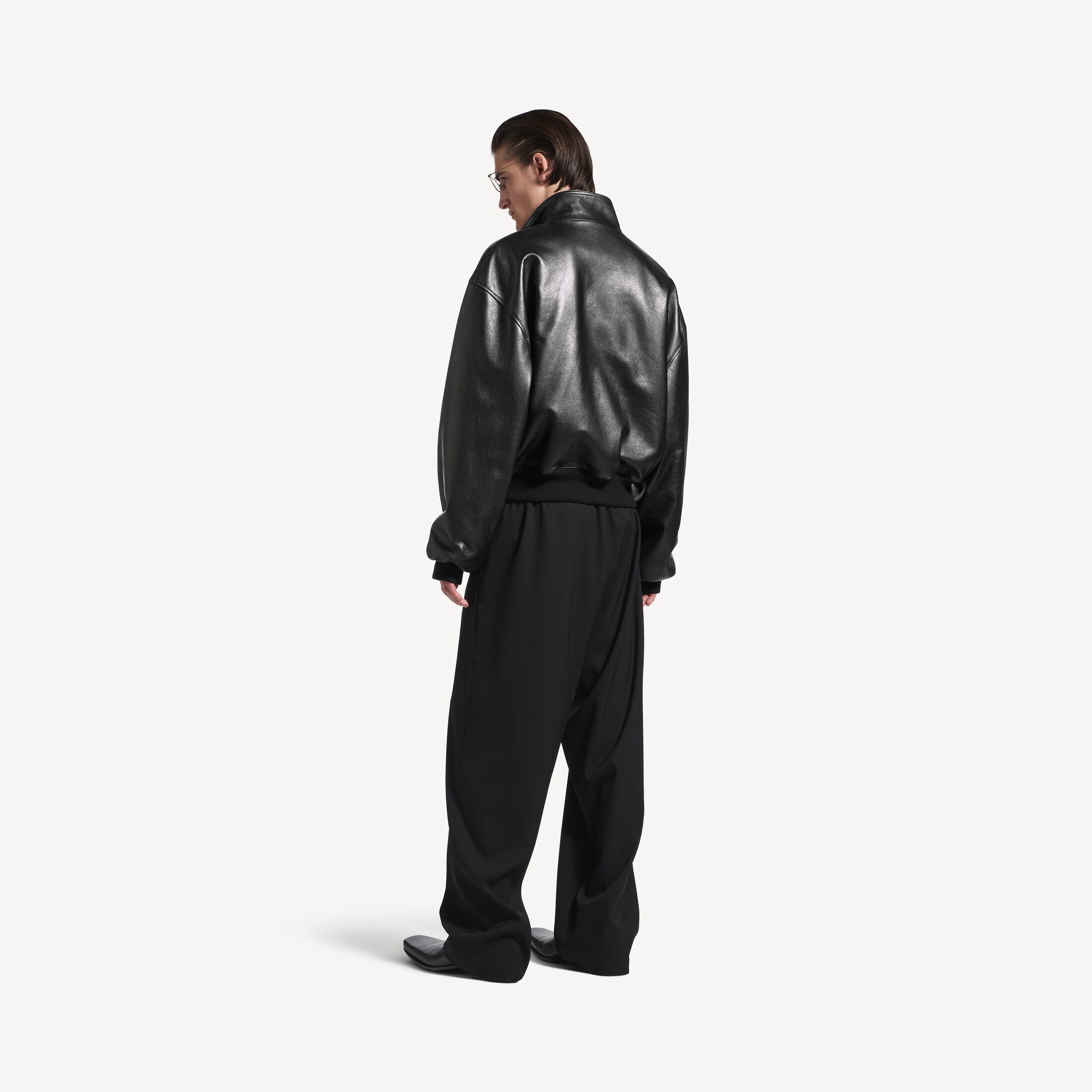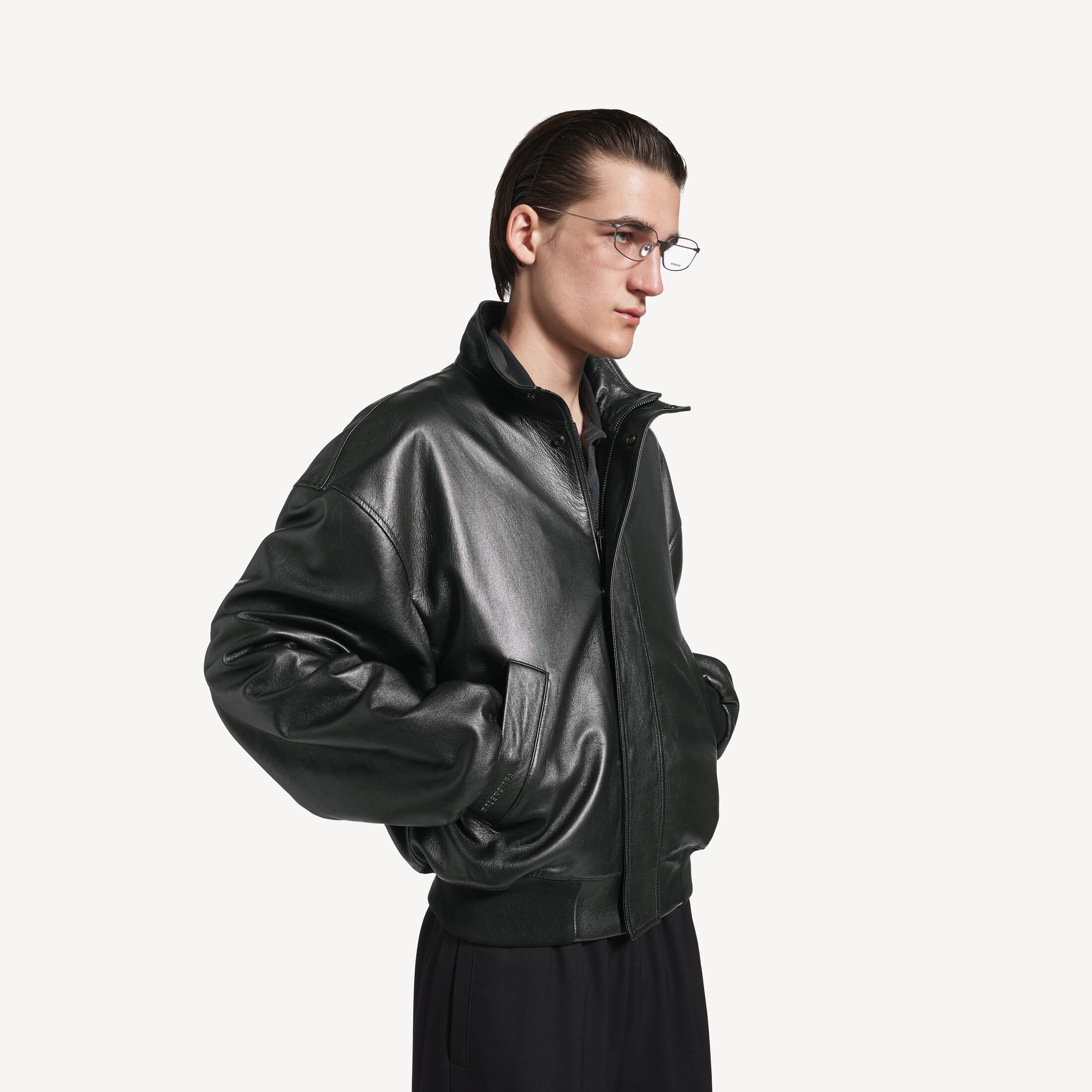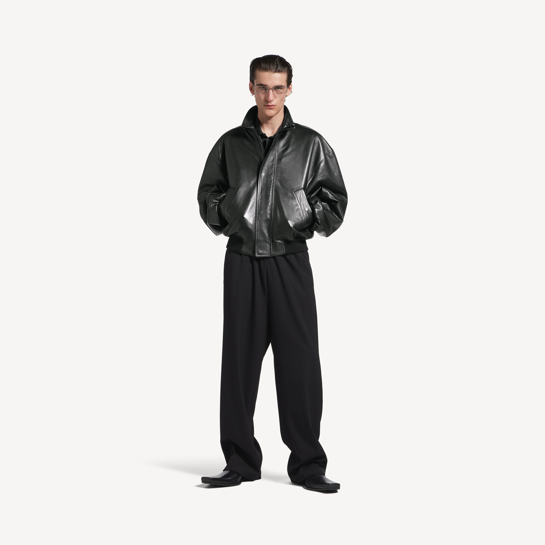 Blouson男士黑色光滑半闪亮粒面皮革夹克,亮相于Balenciaga 2025冬季系列Look 42。此商品支持花呗分期尺码 (法国)