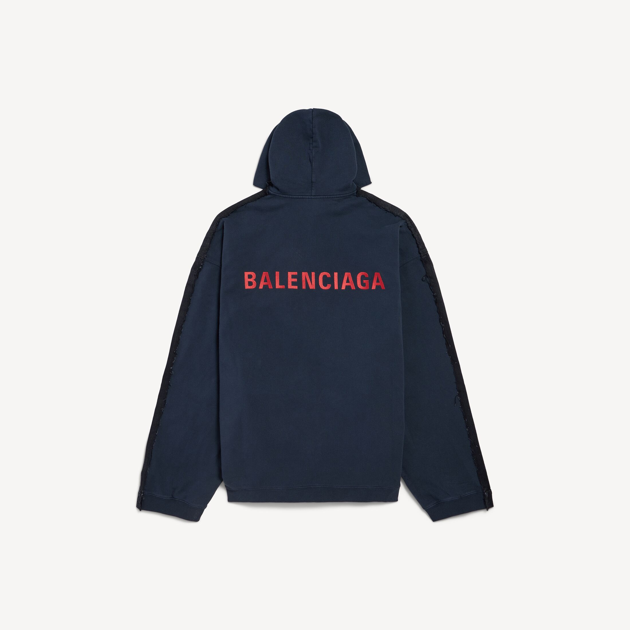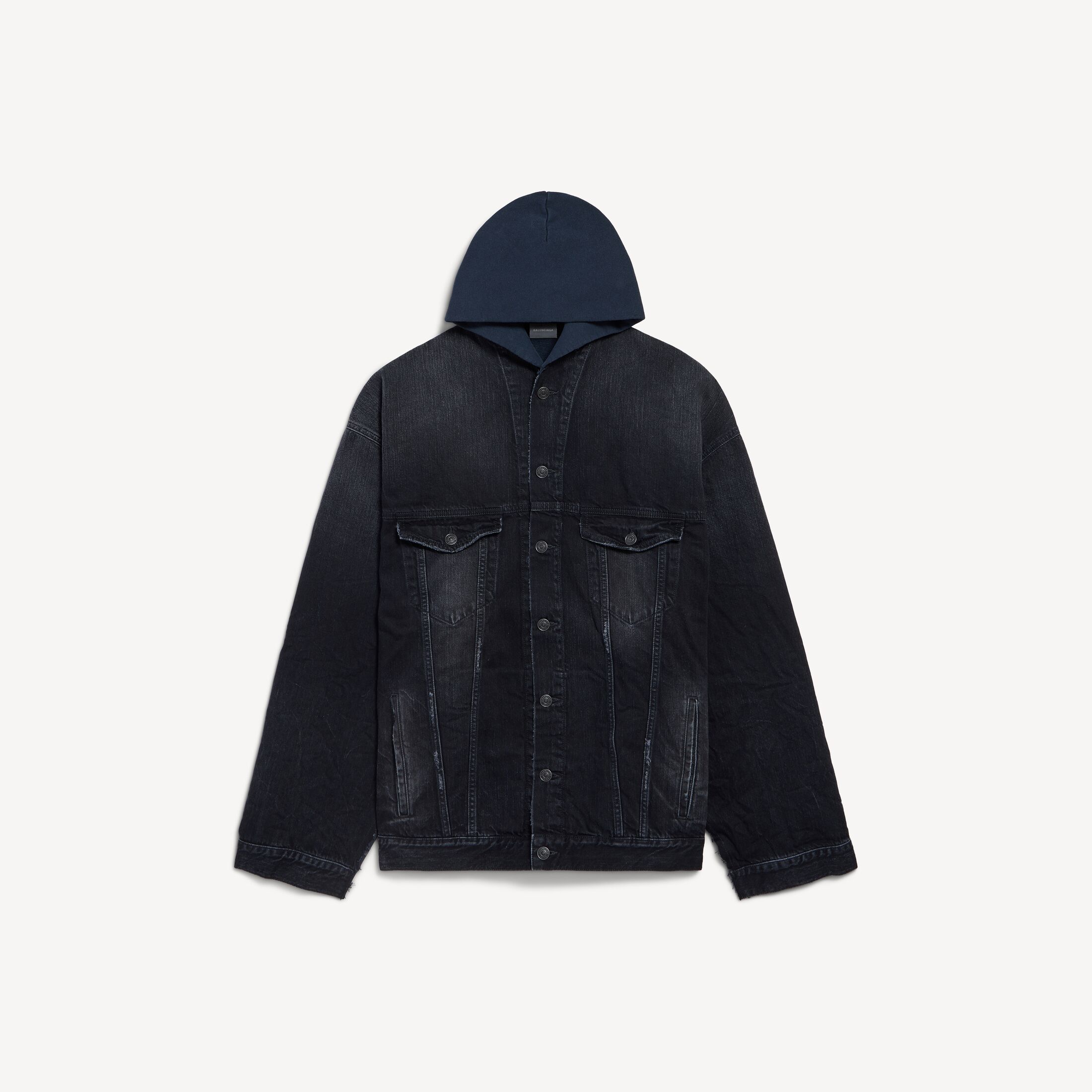 • 混合结构:正面牛仔夹克,背面连帽卫衣