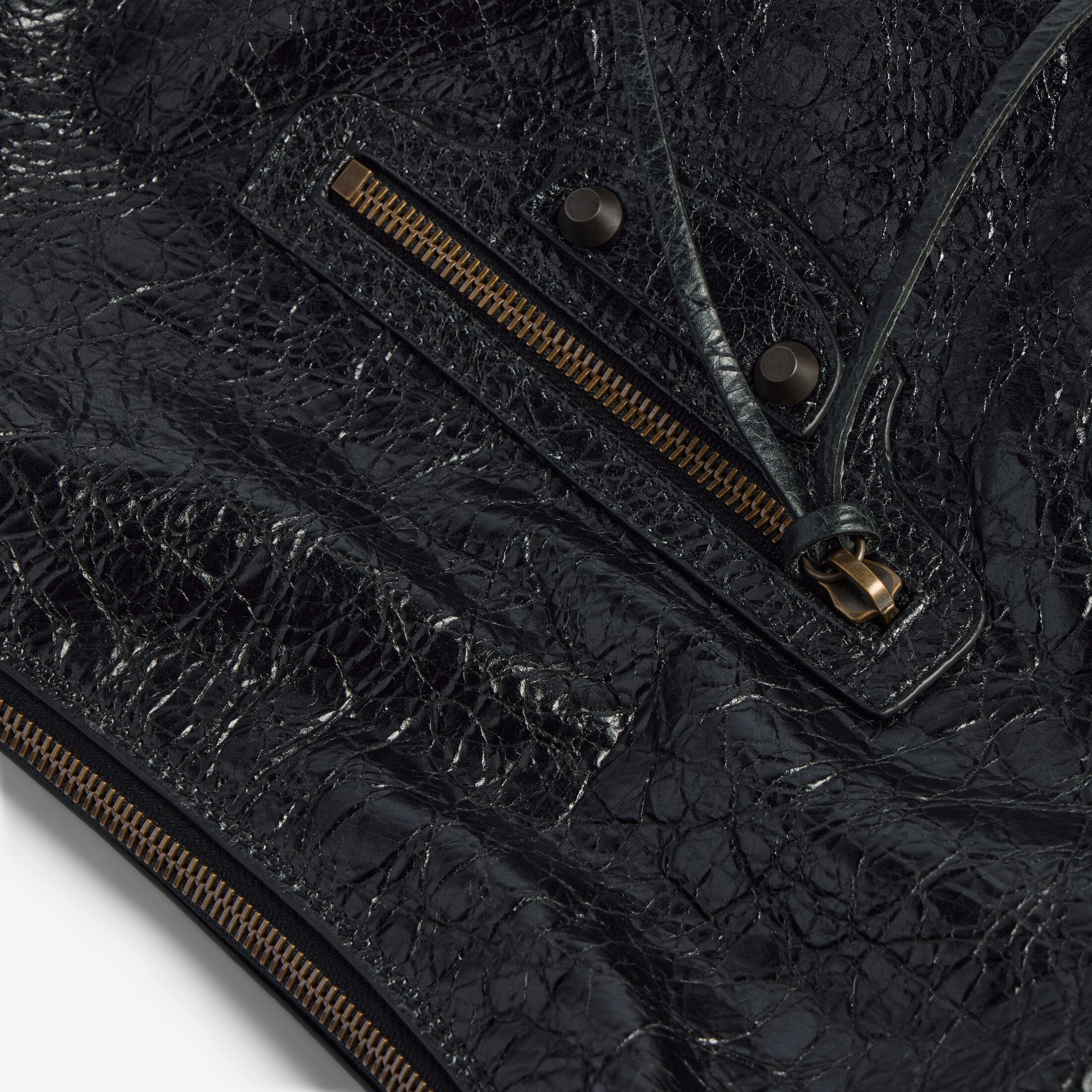 • 正面拉链口袋,配以系结皮革拉链头