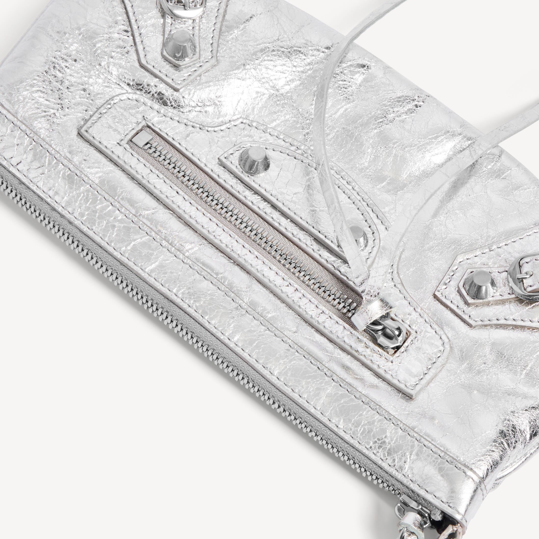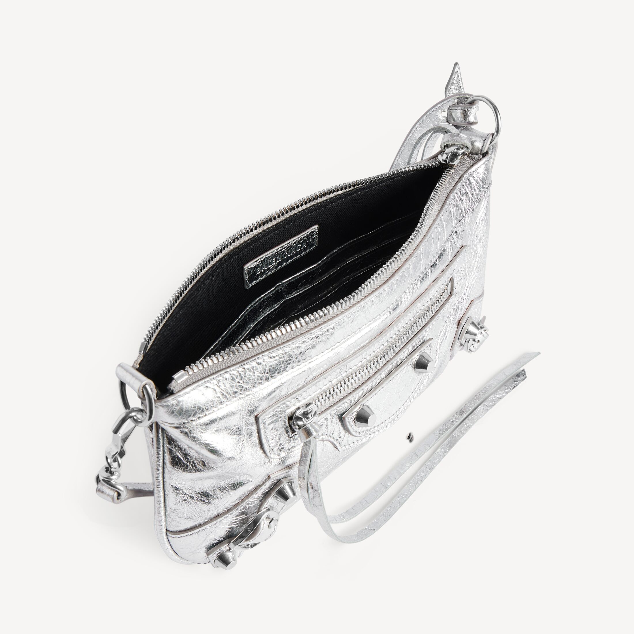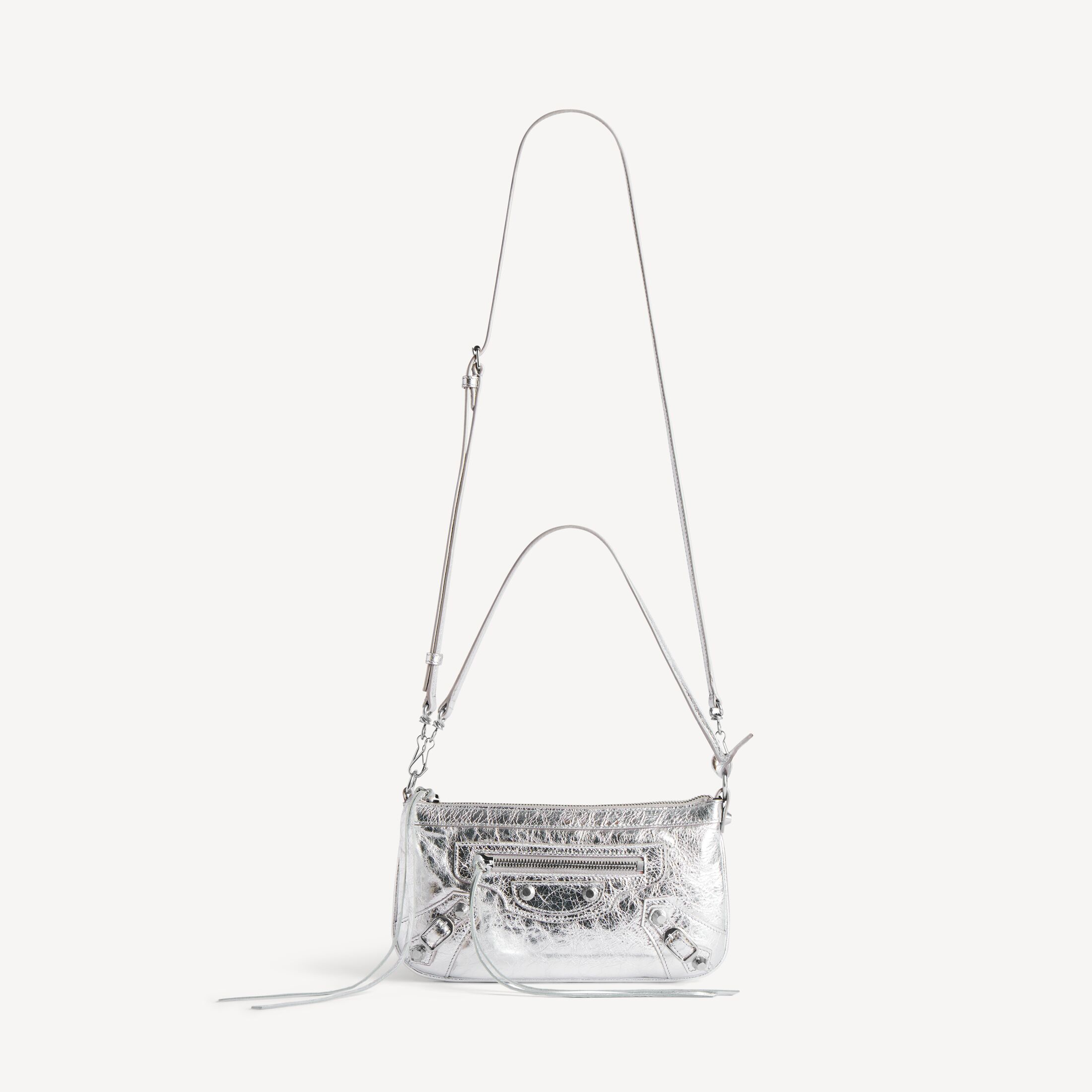Le City银色金属质感细纹羊皮革肩带手拿包,饰以闪亮银色金属配件此商品支持花呗分期产品细节