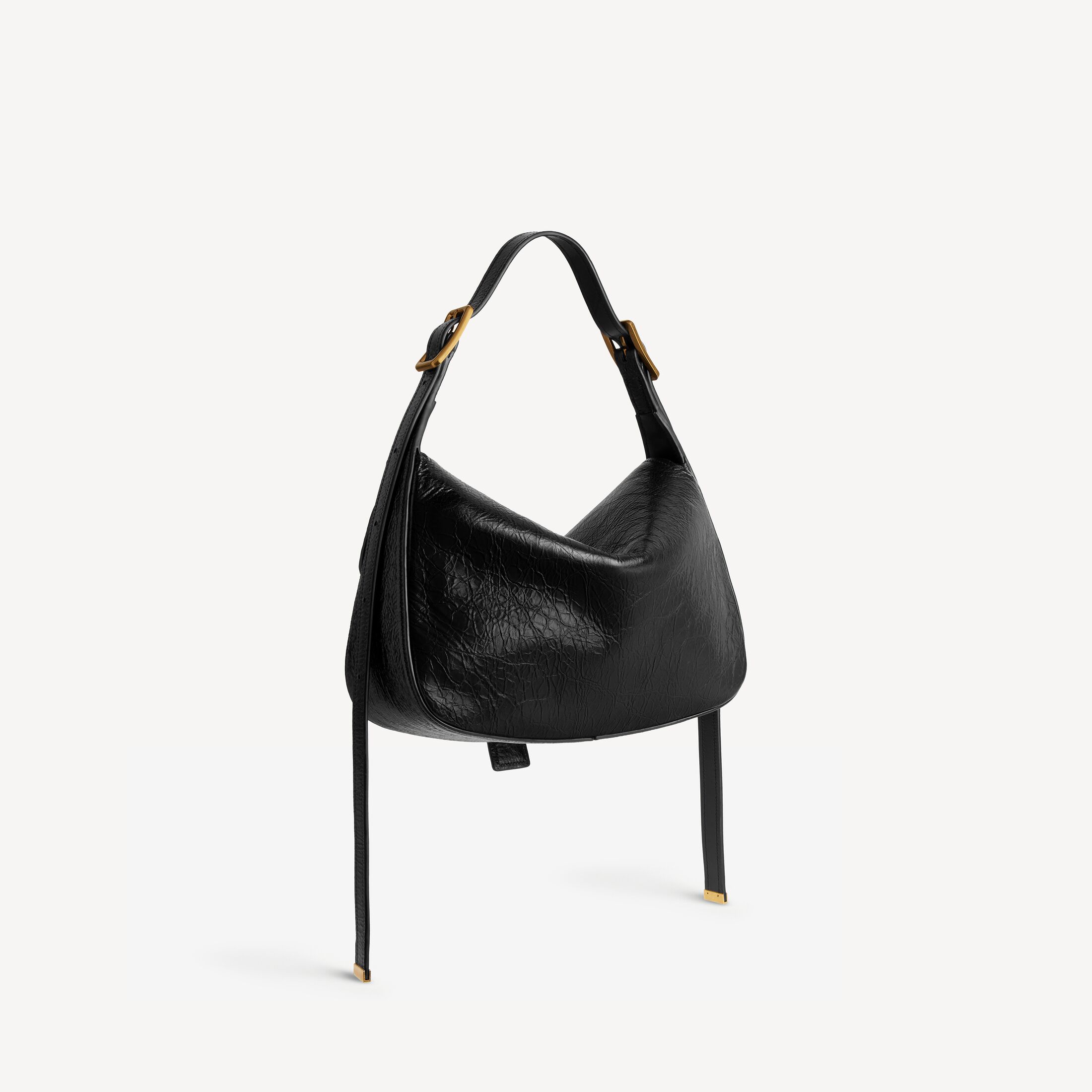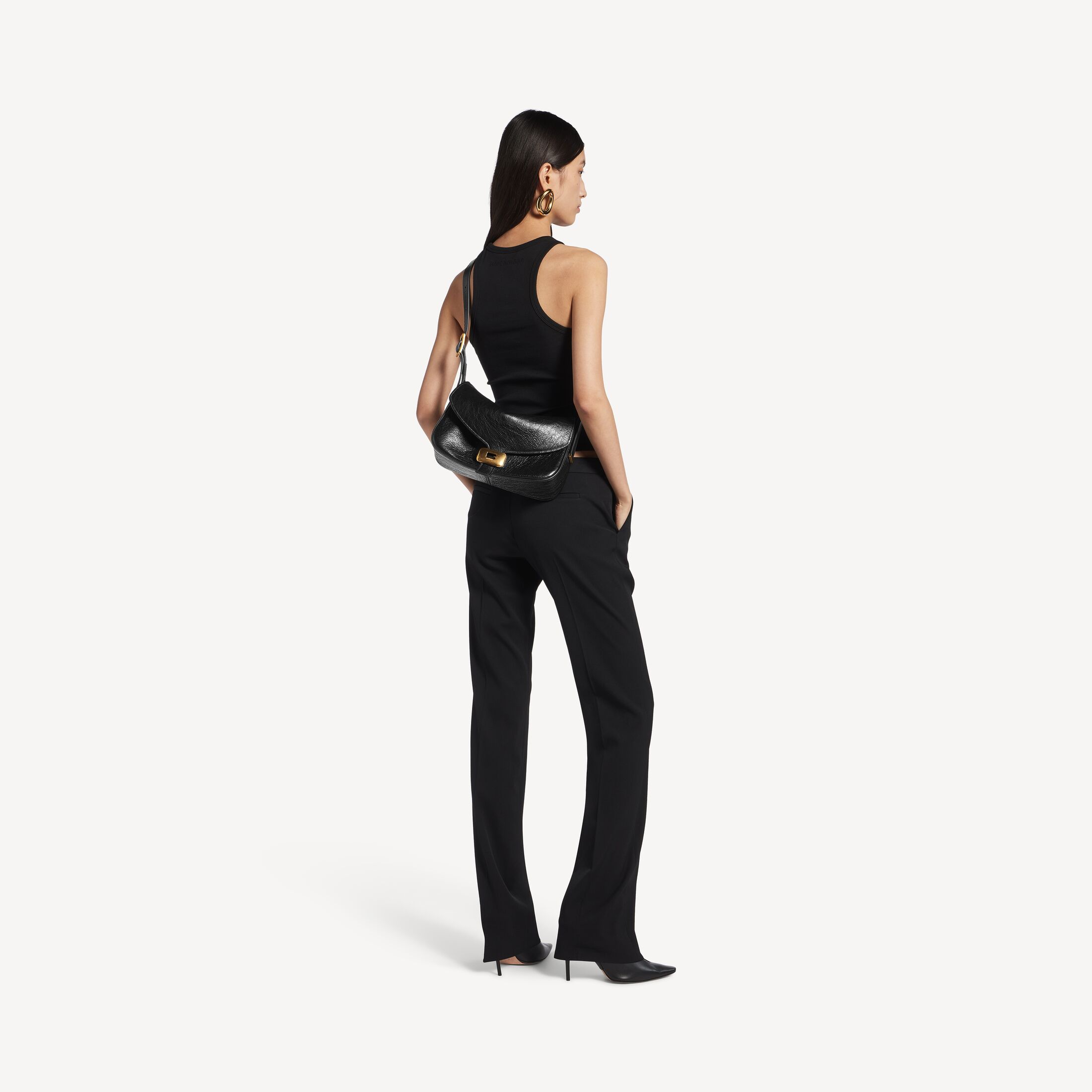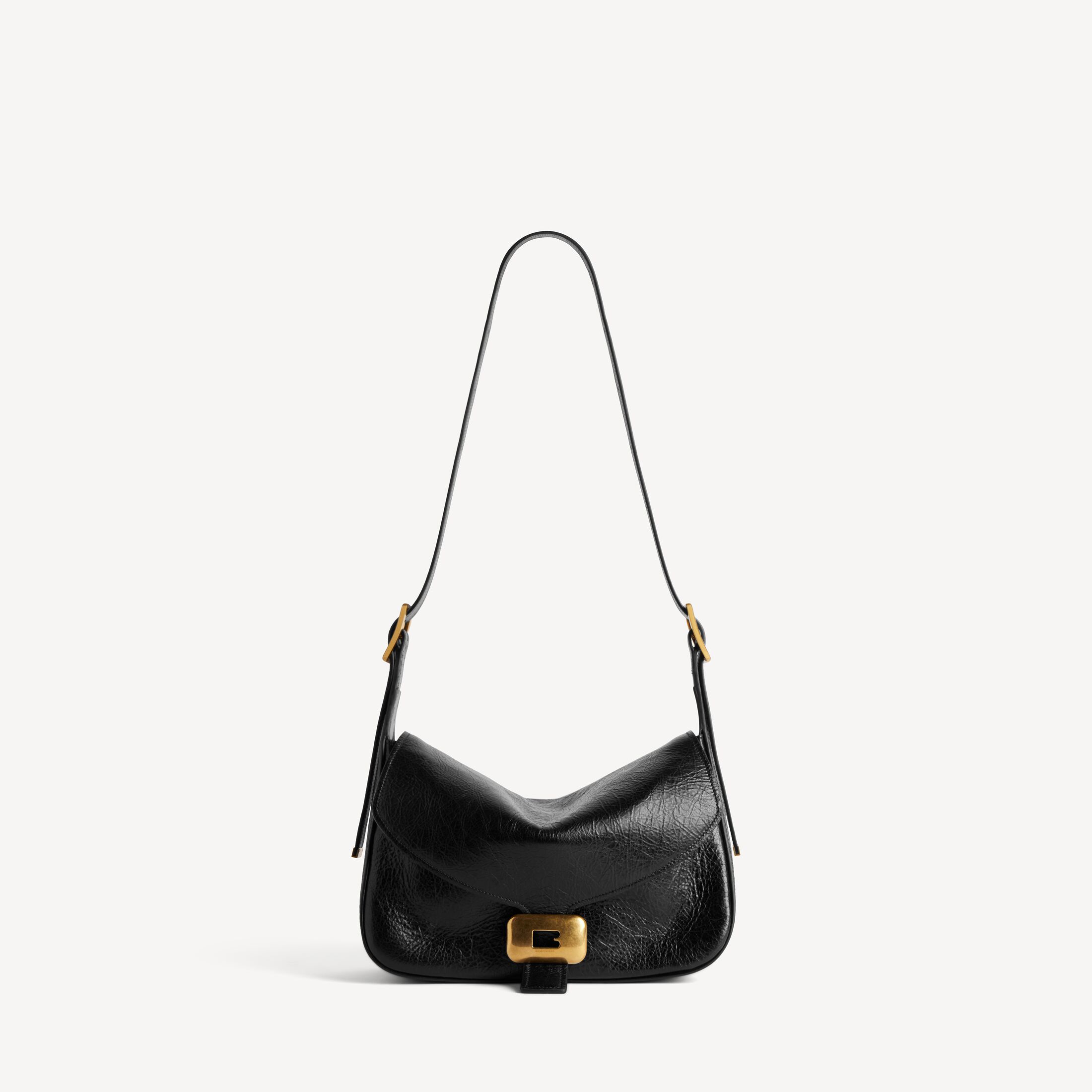 Clicca黑色细纹羊皮革中号单肩包,饰以做旧金色金属配件,亮相于Balenciaga 2026夏季系列Look 20。 此商品支持花呗分期产品细节