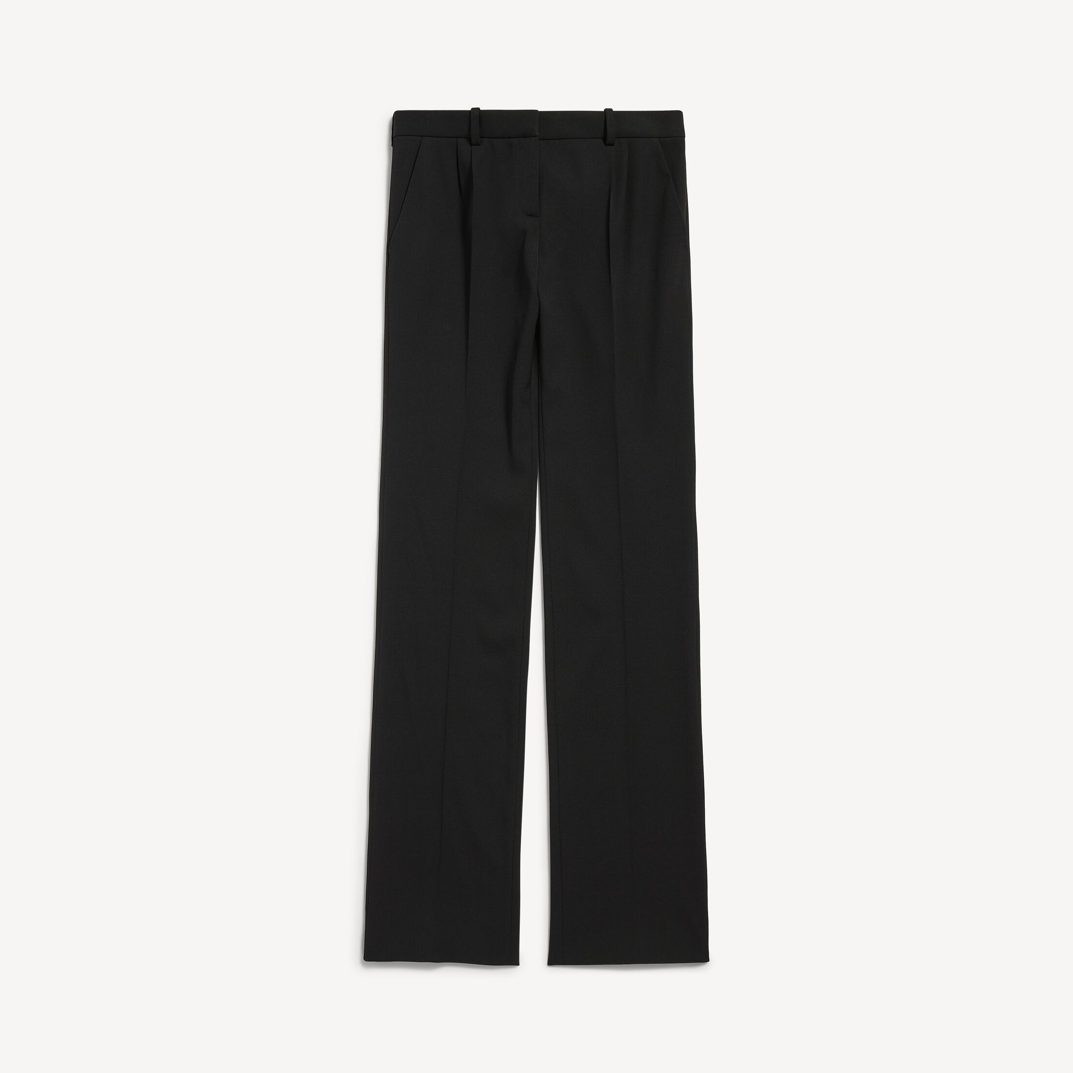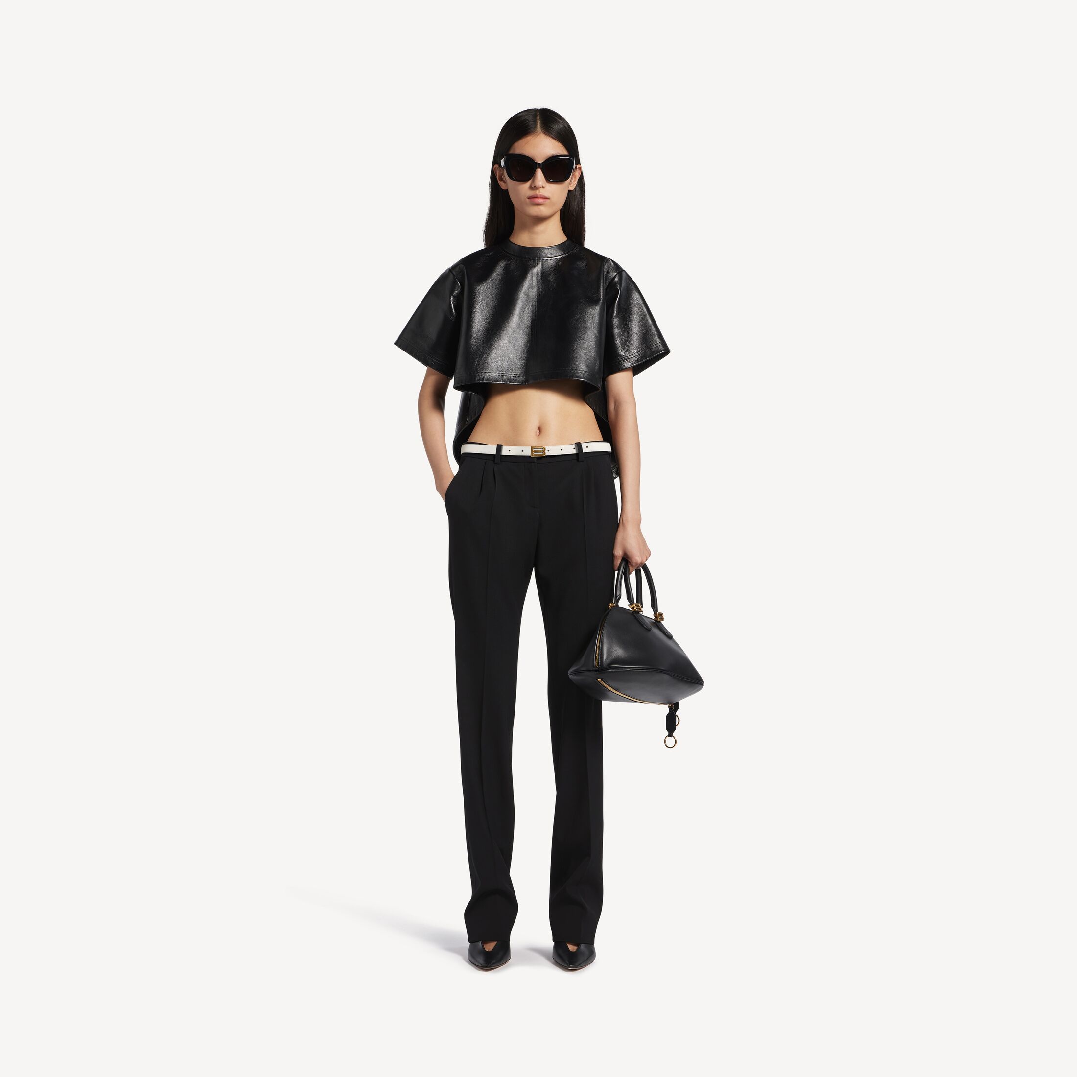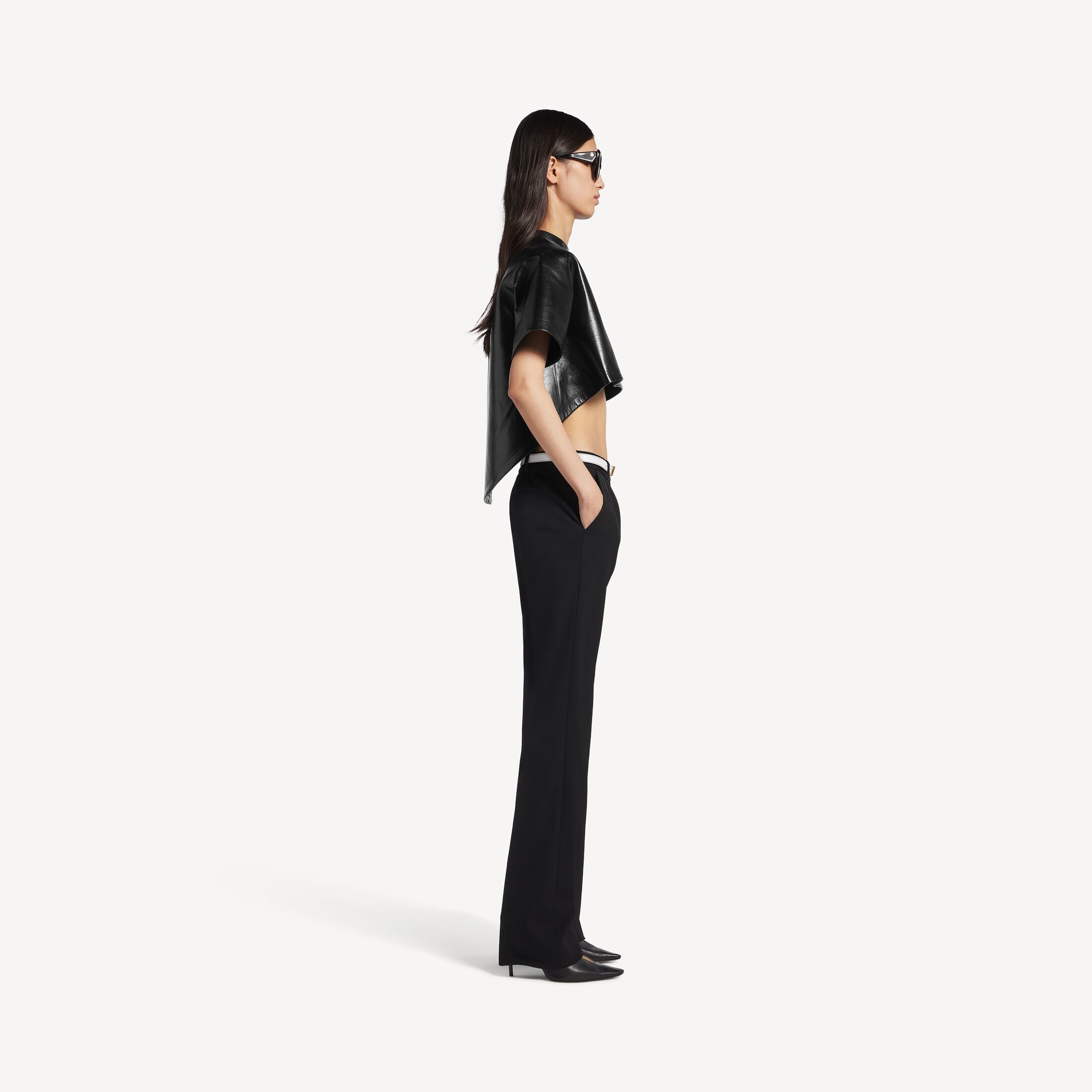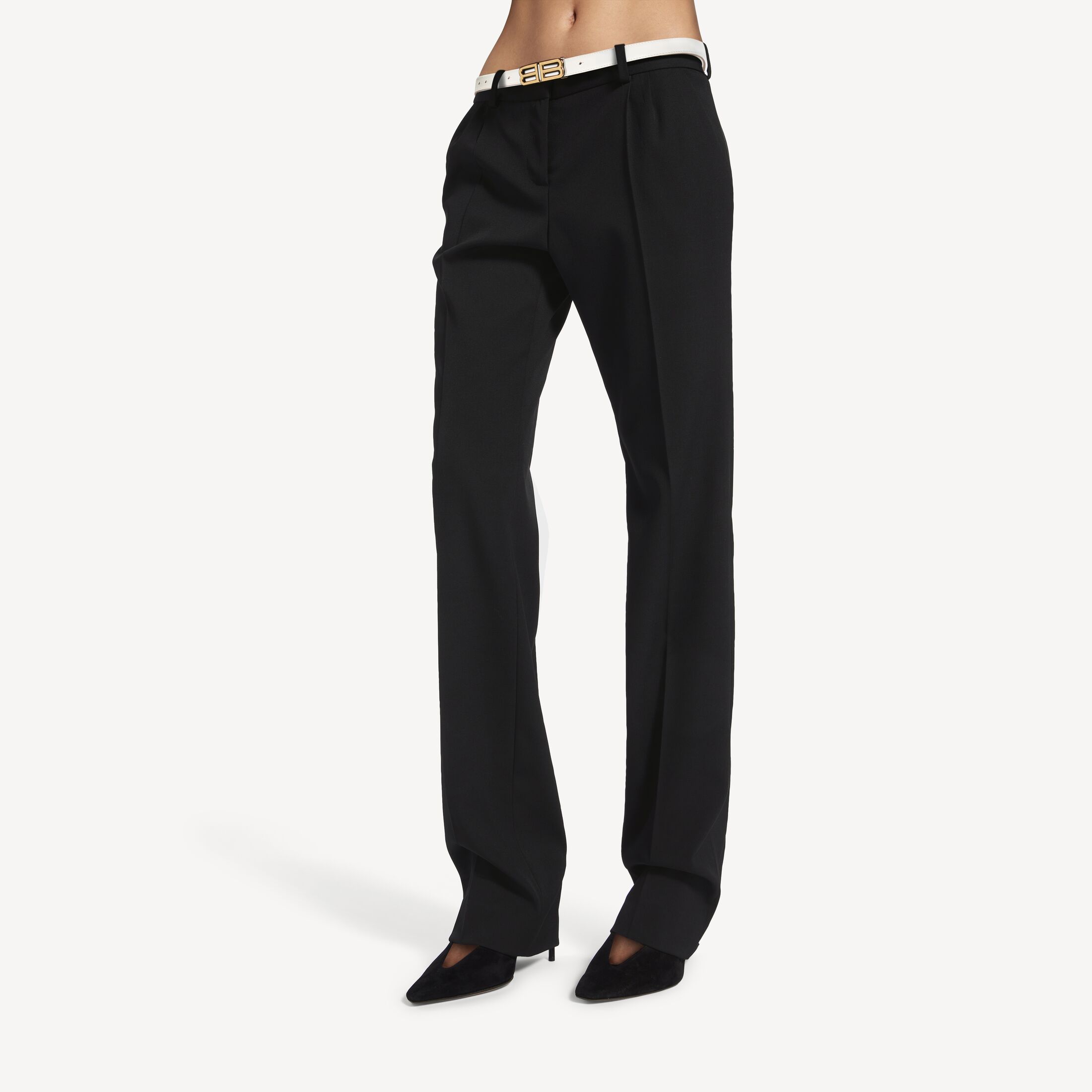 黑色弹力精裁斜纹面料修身长裤,亮相于Balenciaga 2026夏季系列多款造型中。此商品支持花呗分期尺码 (法国)
