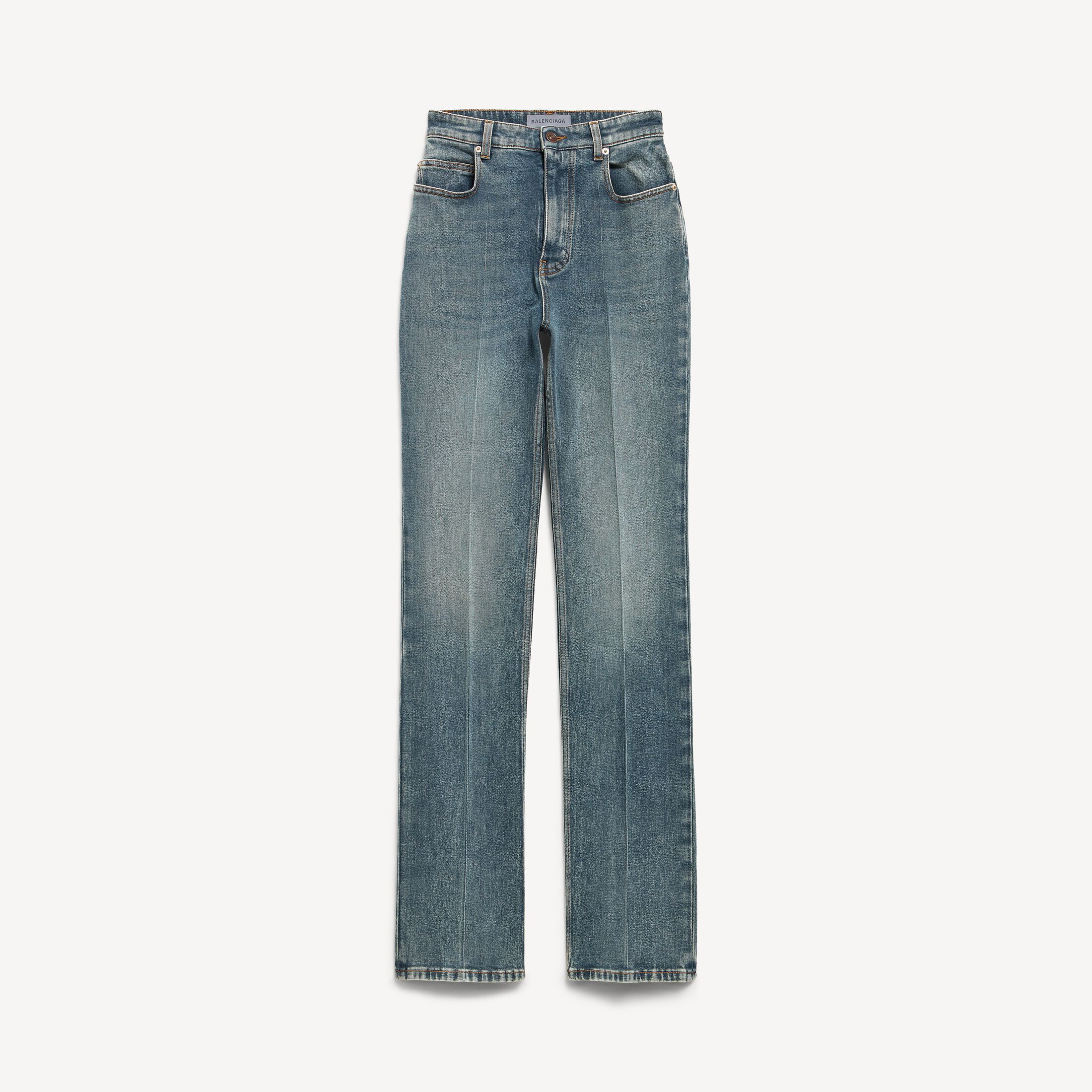 做旧复古蓝色弹力棉混纺高腰修身牛仔裤,亮相于Balenciaga 2026夏季系列Look 41。此商品支持花呗分期尺码 (法国)