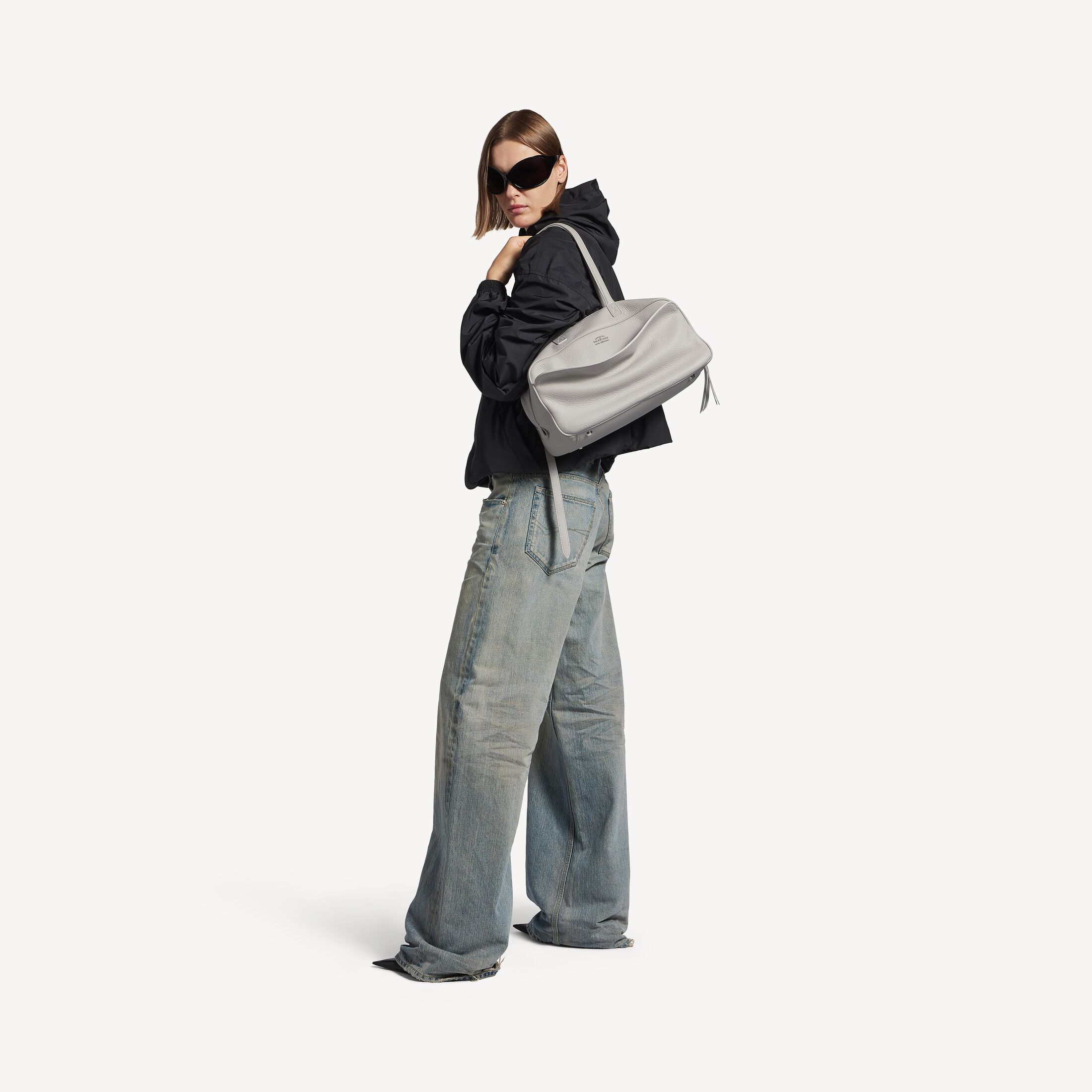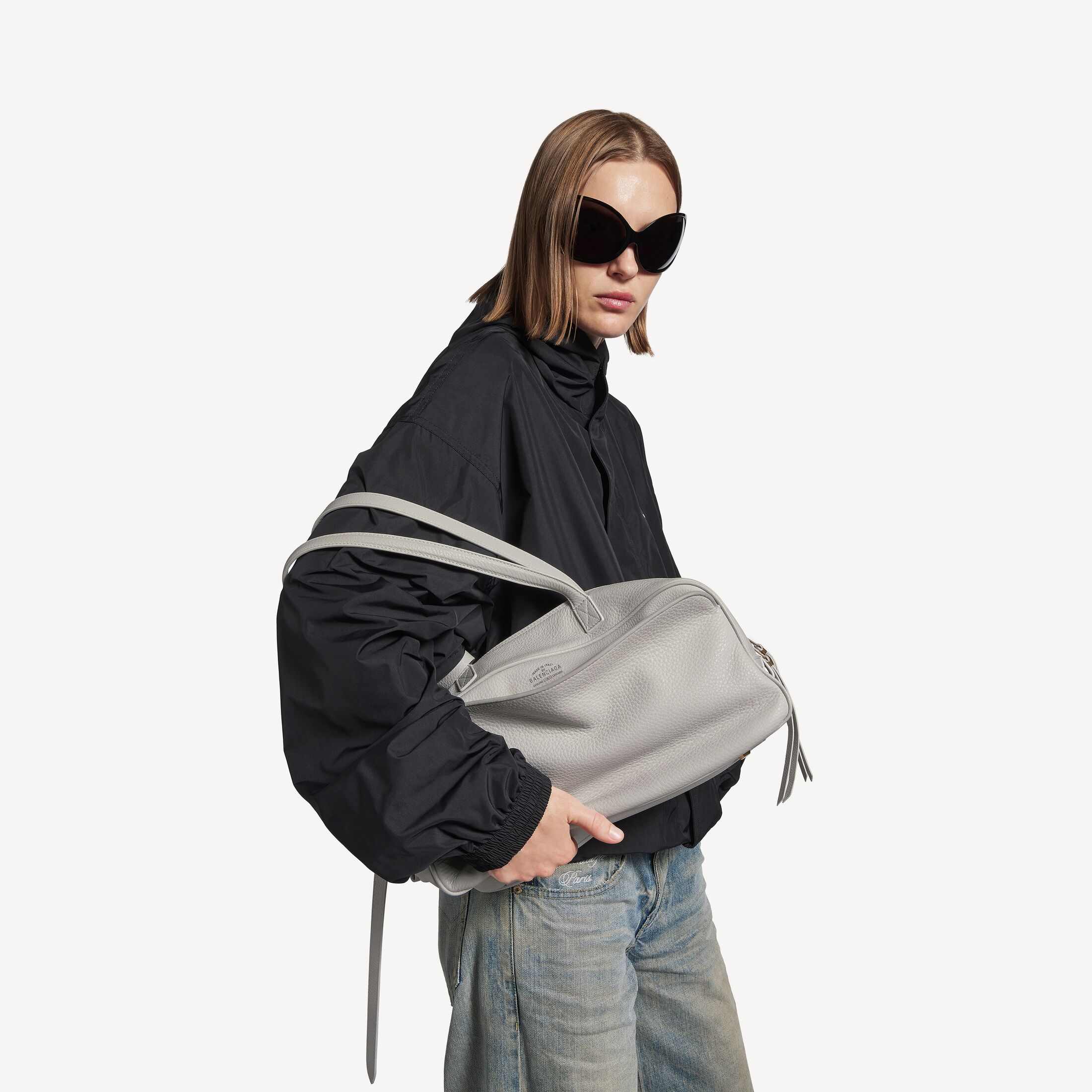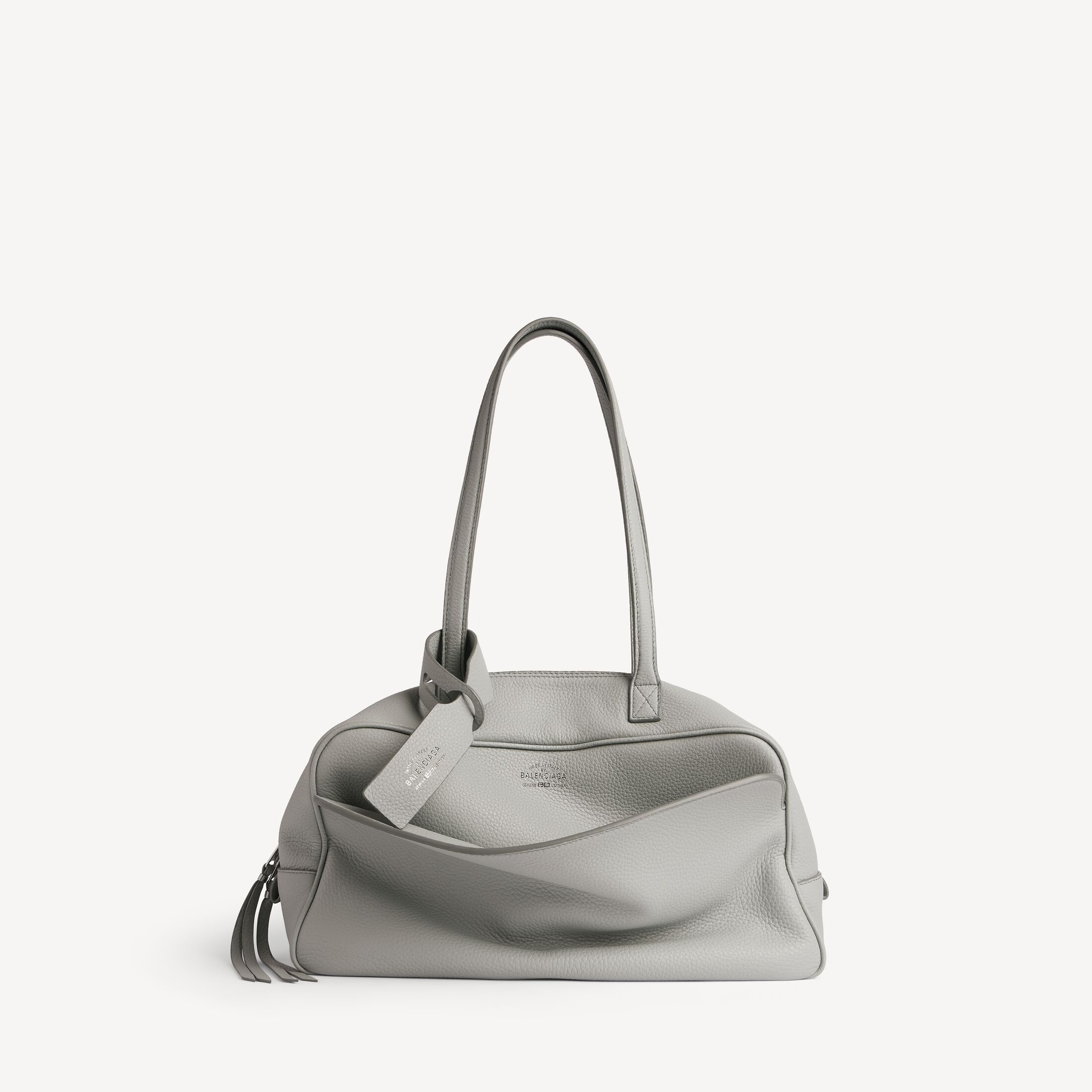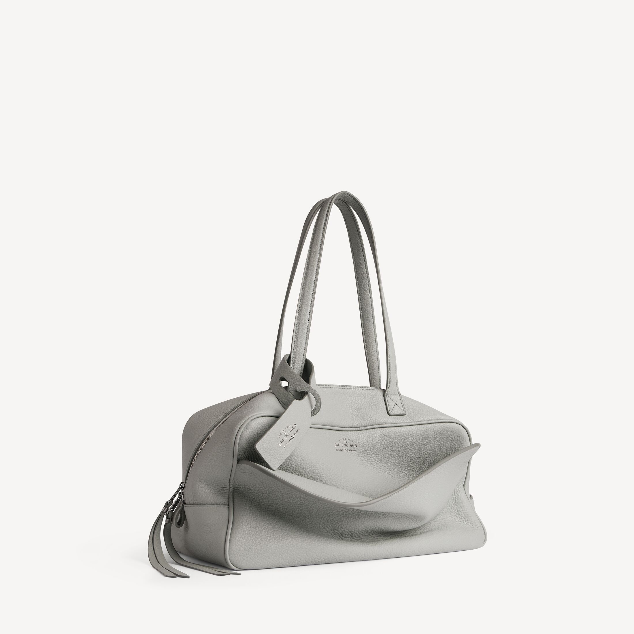 Carrie Balenciaga灰色粒面牛皮革中号保龄球包,饰以做旧银色金属配件此商品支持花呗分期产品细节