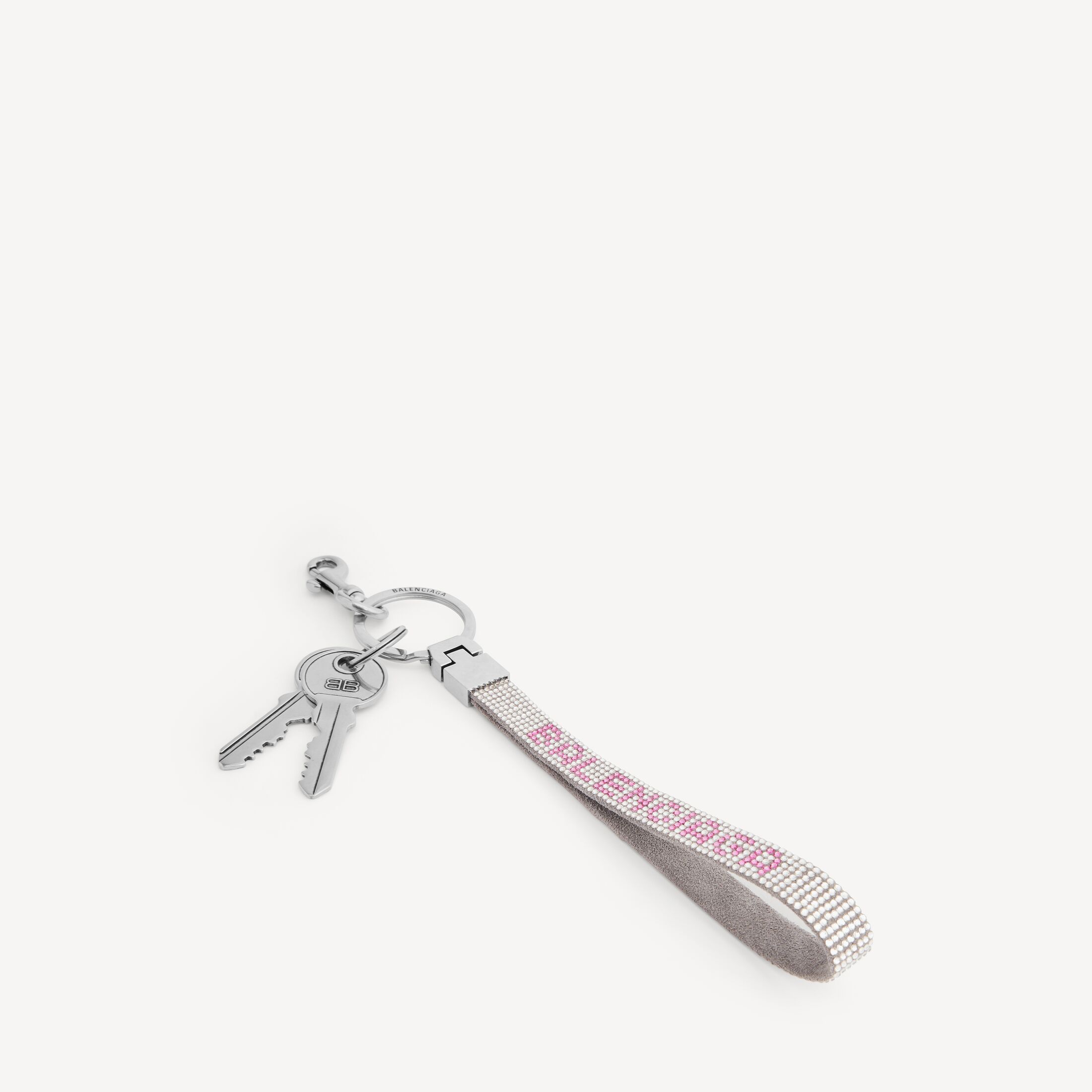 Balenciaga烟熏灰色和粉色绒面牛皮革水钻挂饰,饰以莱茵石和做旧银色金属配件此商品支持花呗分期• 尺寸:长3.5 x 高21.8 x 宽1.5厘米