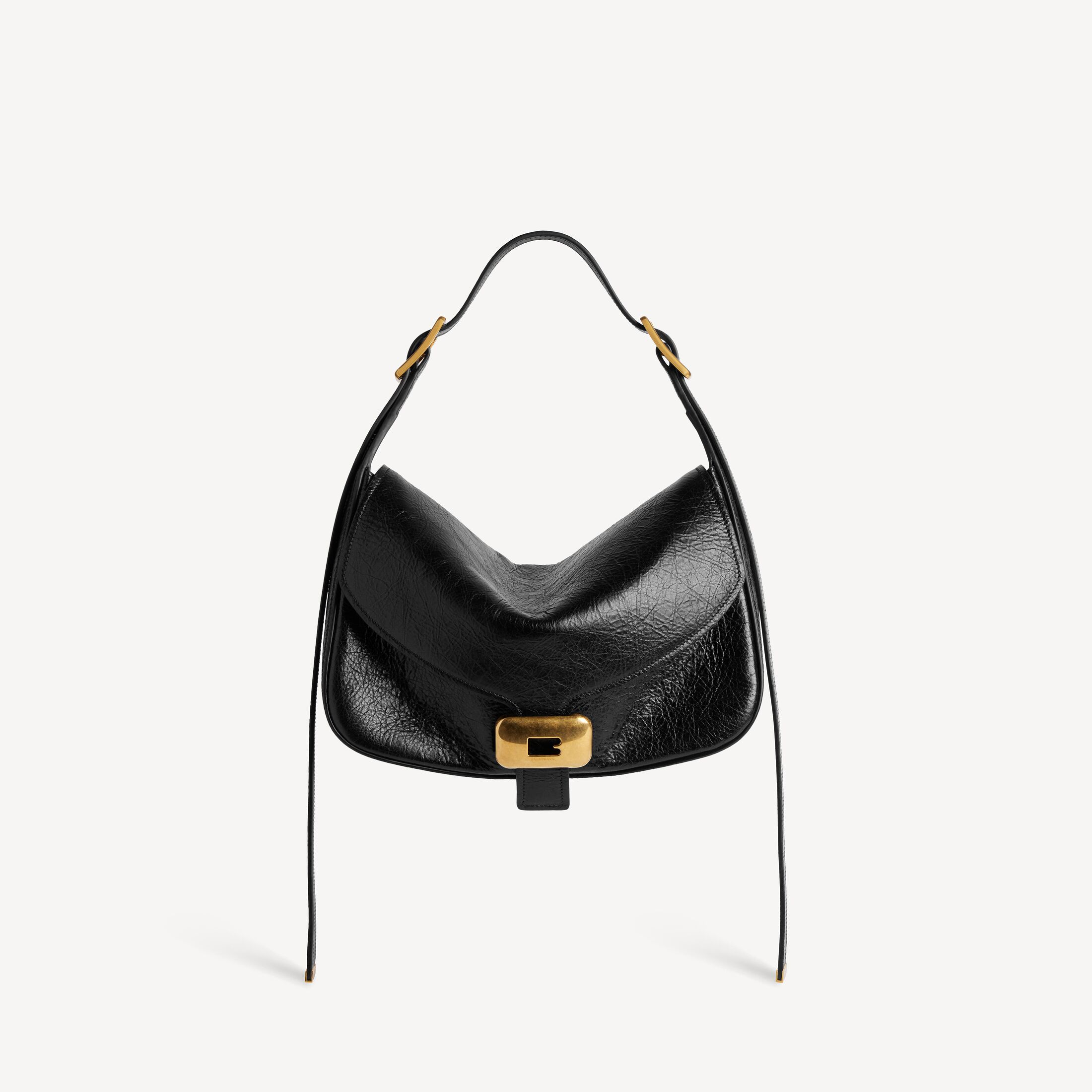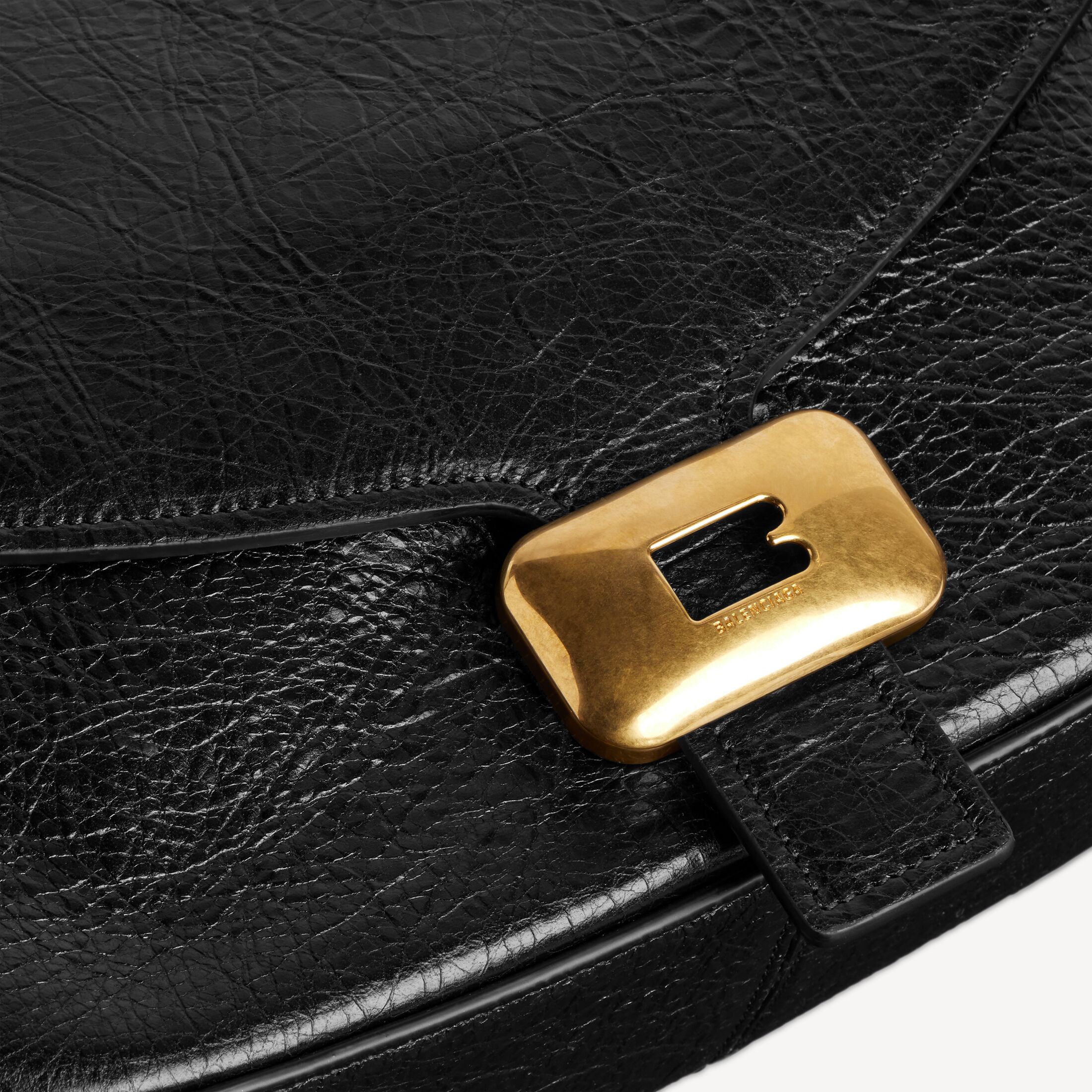 Clicca黑色细纹羊皮革中号单肩包,饰以做旧金色金属配件,亮相于Balenciaga 2026夏季系列Look 20。 此商品支持花呗分期产品细节