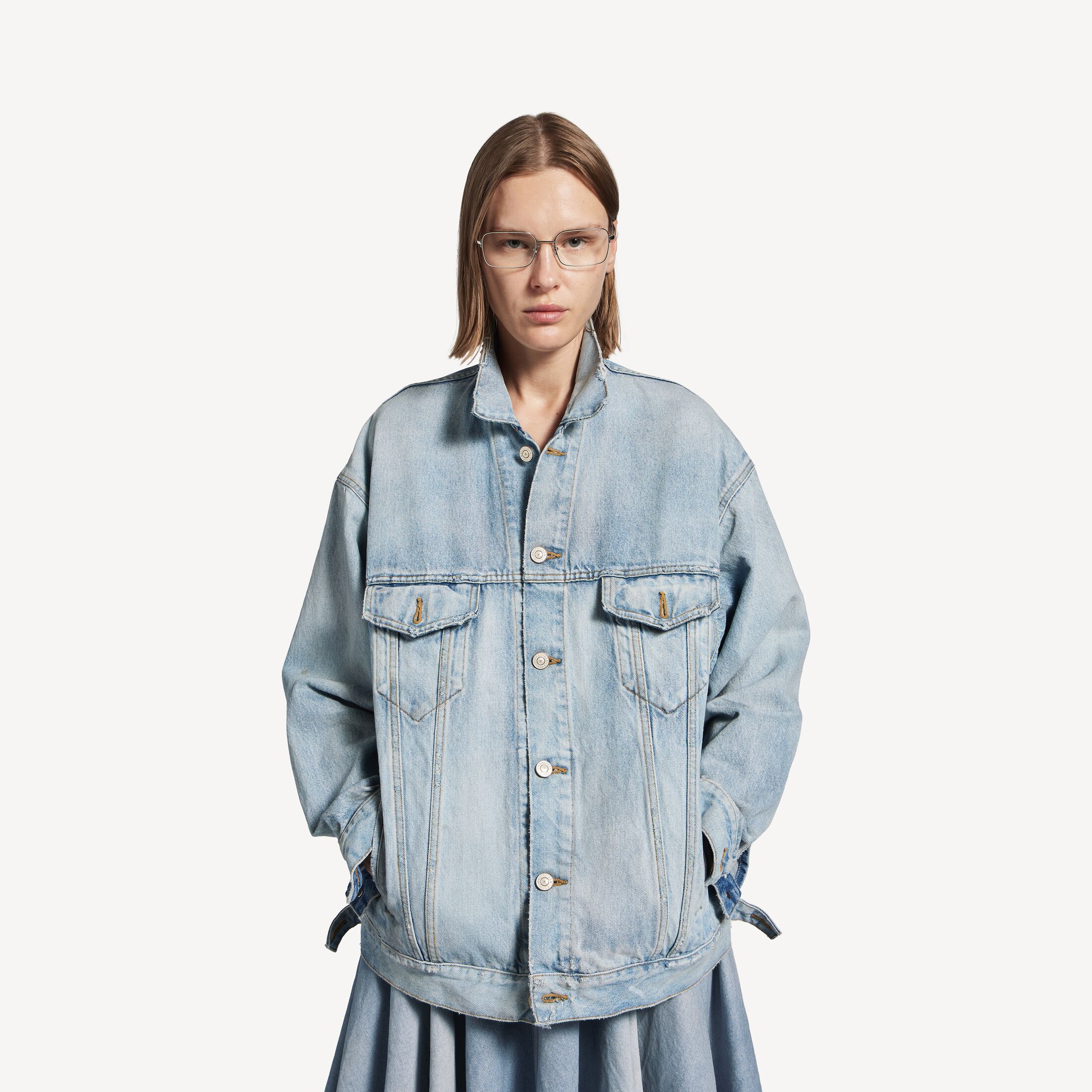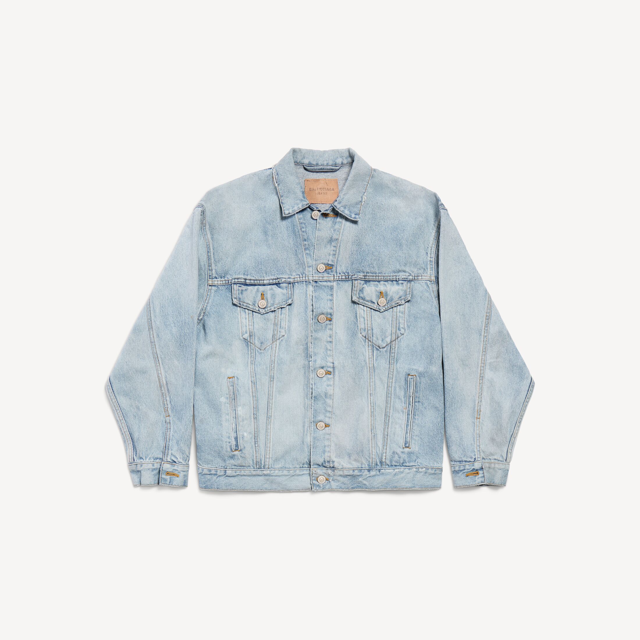 做旧浅蓝色棉质常规版型牛仔夹克,亮相于Balenciaga 2026春季系列Look 13。此商品支持花呗分期尺码 (法国)