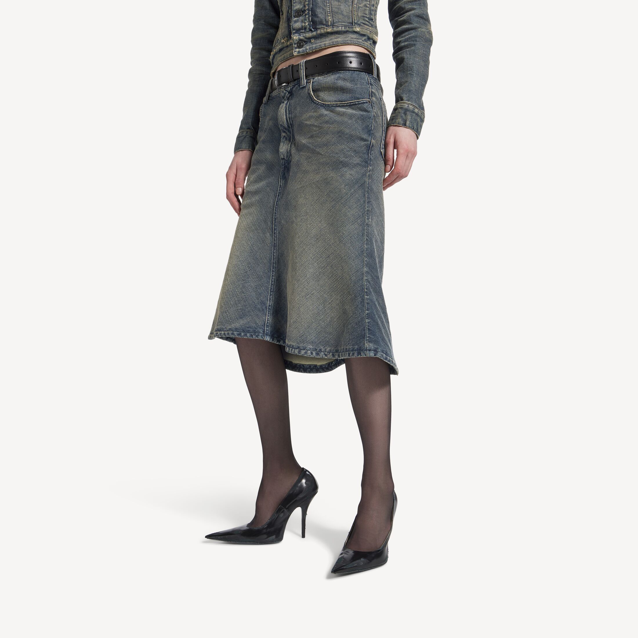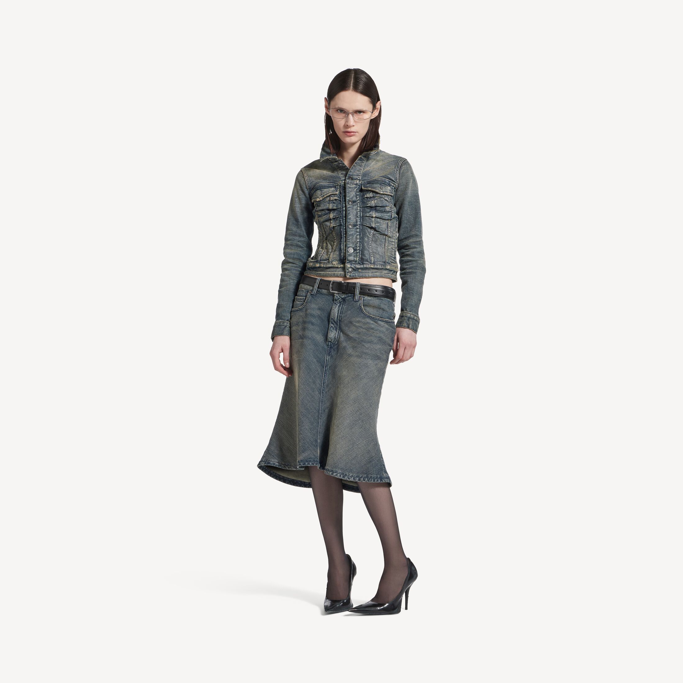 Godet女士蓝色棉质牛仔中长半身裙,亮相于Balenciaga 2025冬季系列Look 14。此商品支持花呗分期