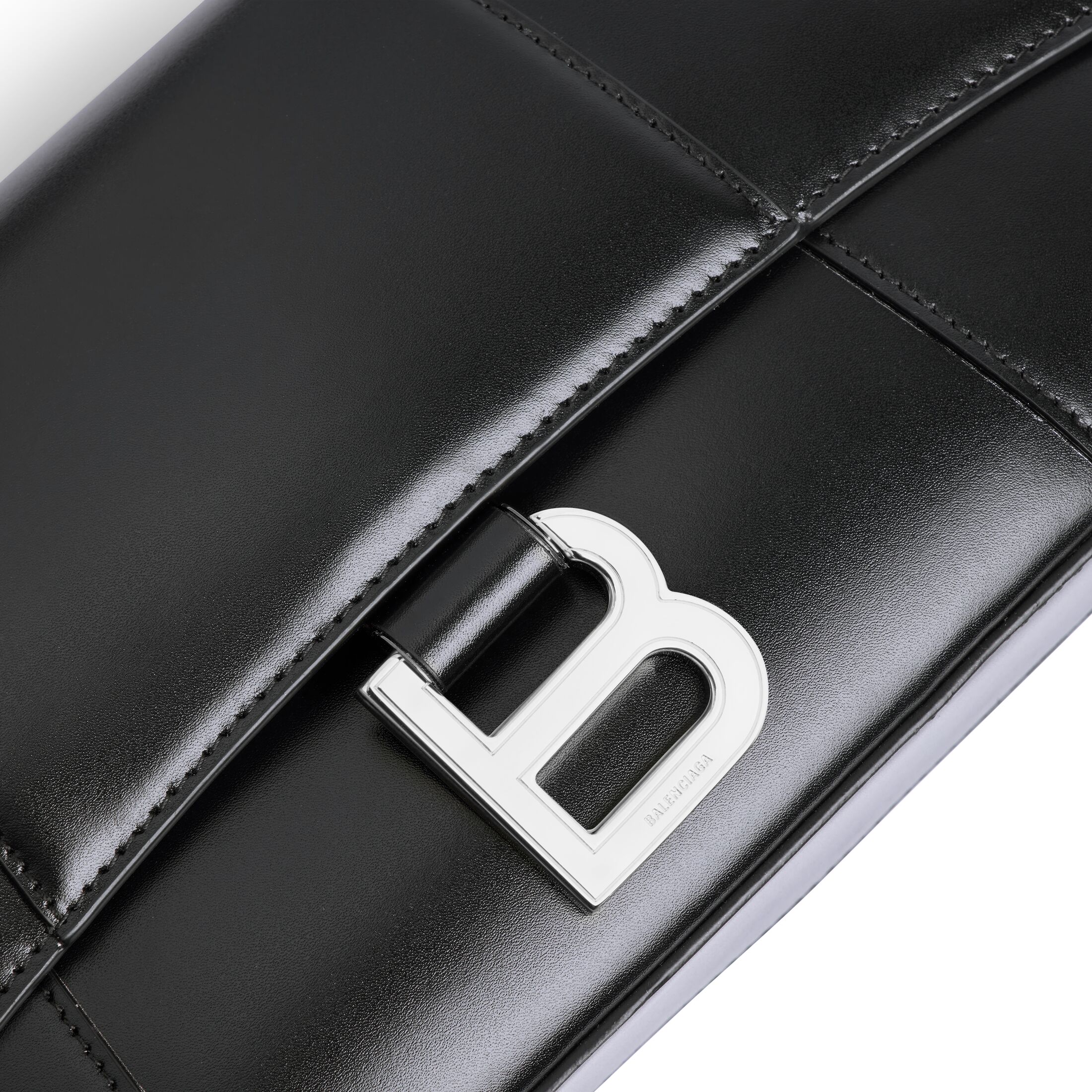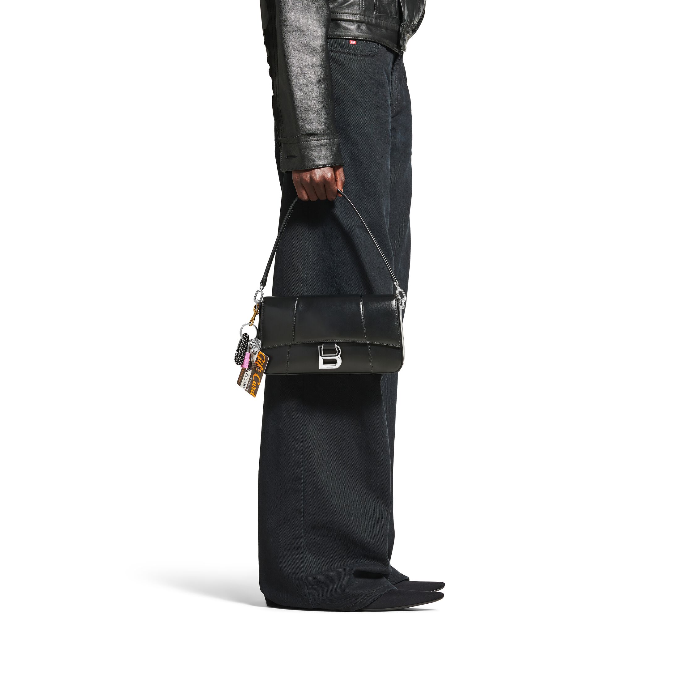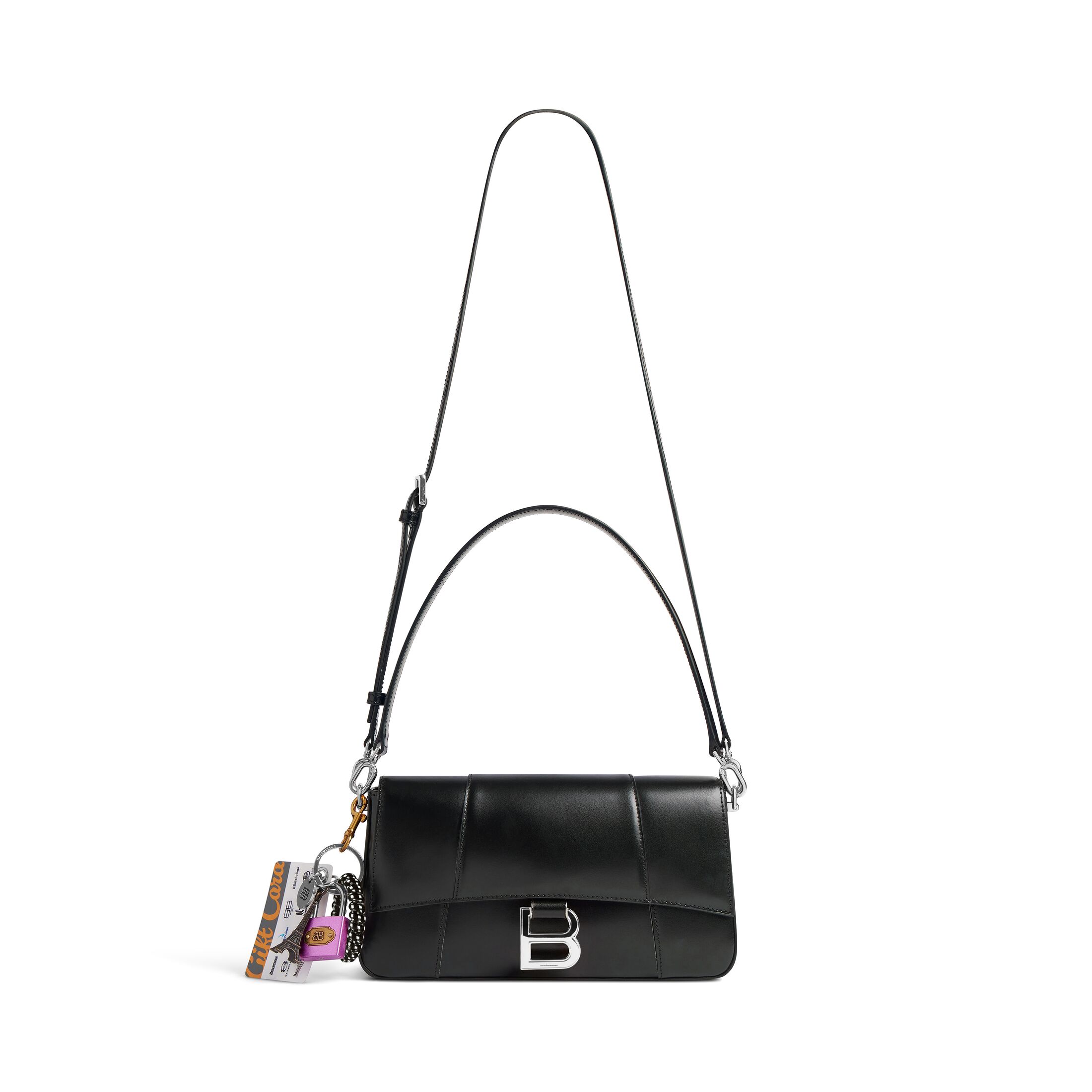 Hourglass黑色亮面box牛皮革中号单肩包,饰以挂饰和半闪光钯色金属配件此商品支持花呗分期• 尺寸:长26.9 x 高14.9 x 宽5.8厘米