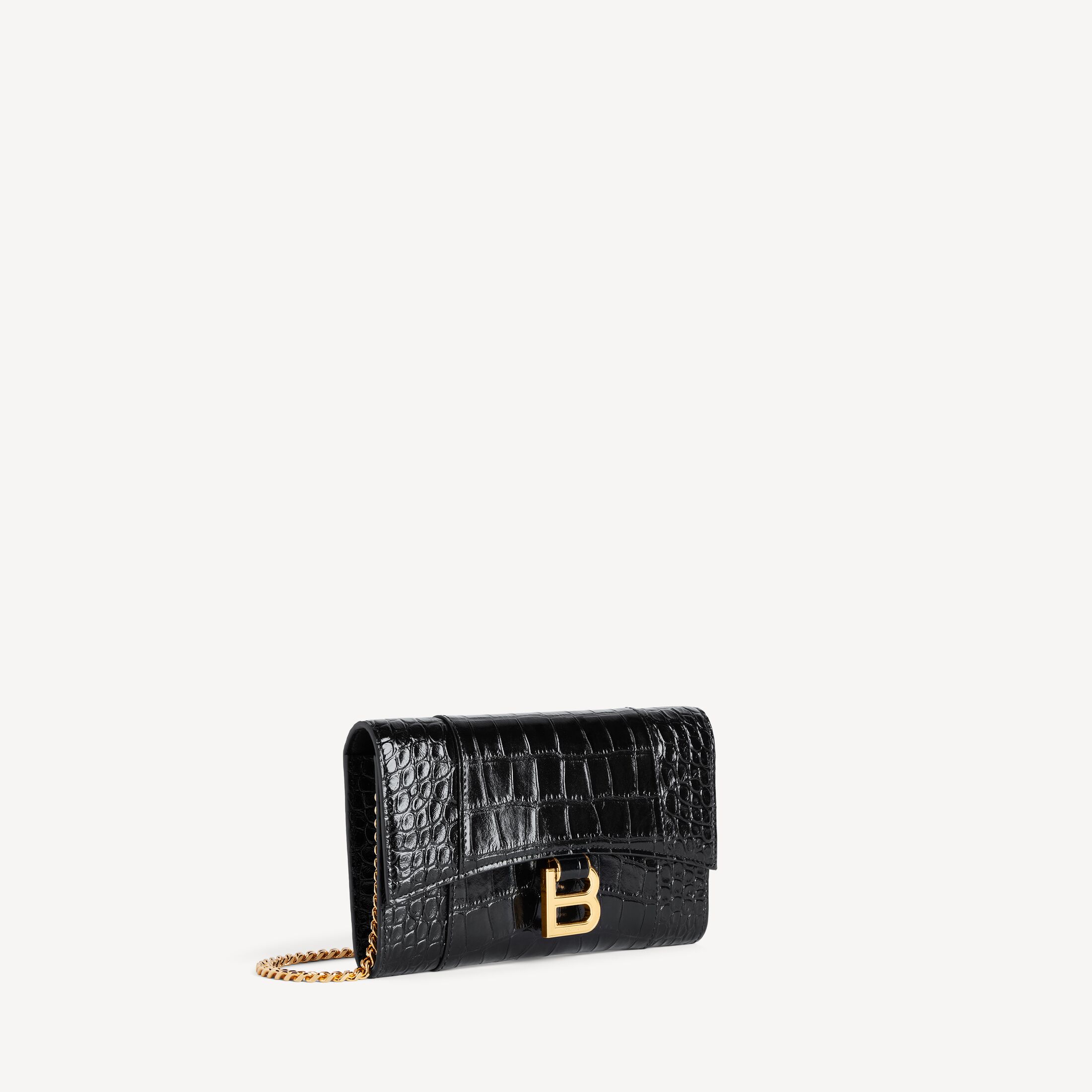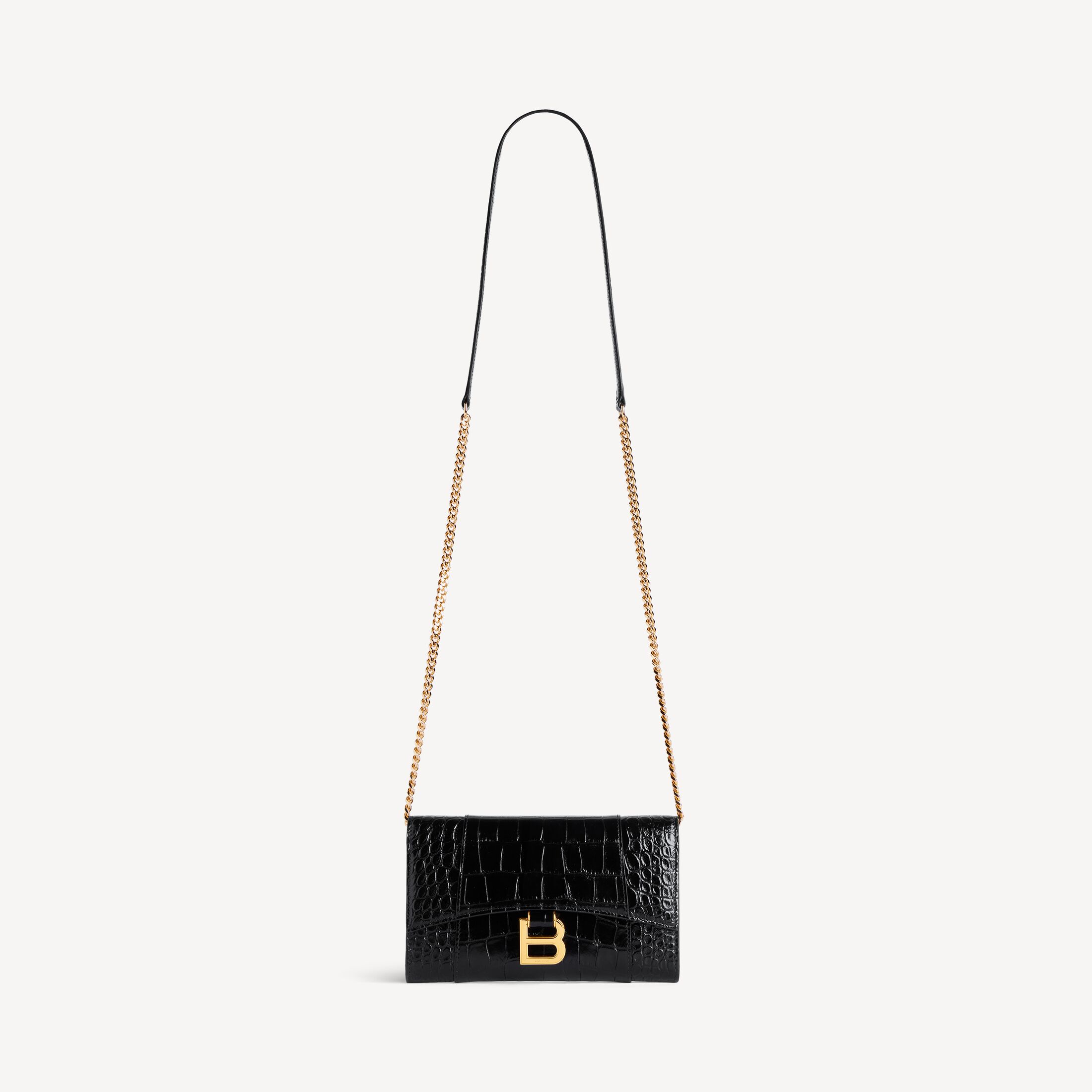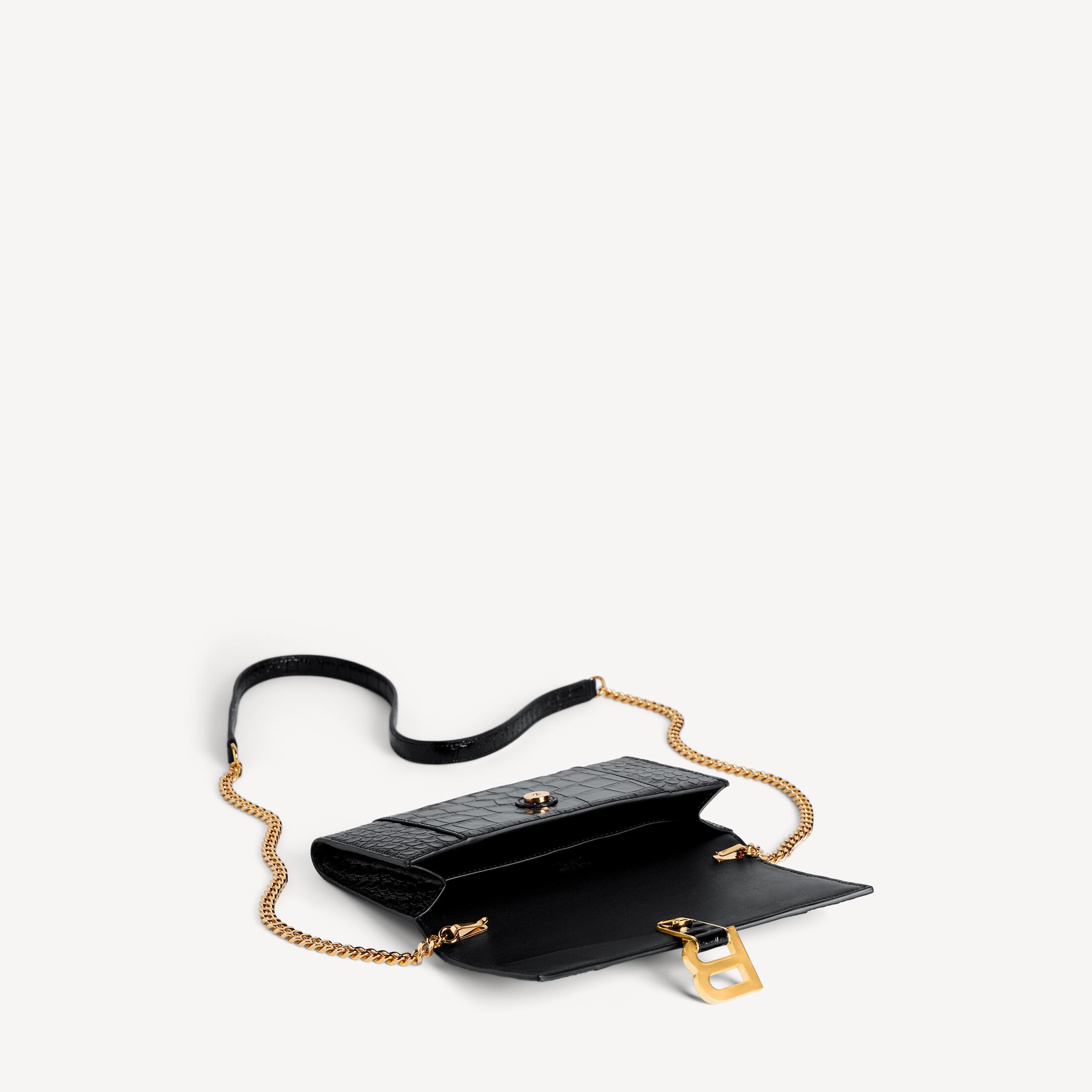 Hourglass黑色柔软鳄鱼纹压纹牛皮革链带钱包,饰以闪亮金色金属配件此商品支持花呗分期• 柔软鳄鱼纹压纹牛皮革