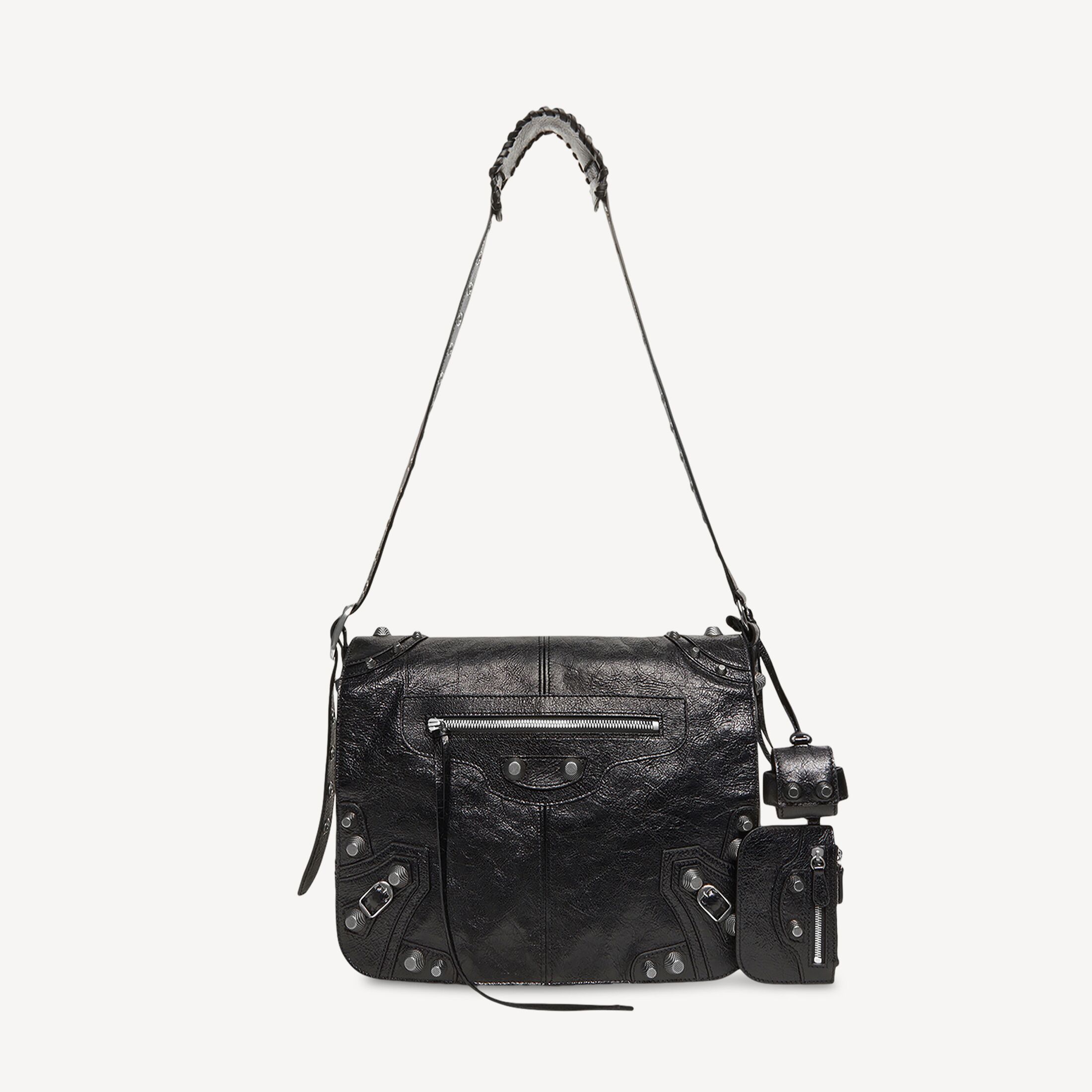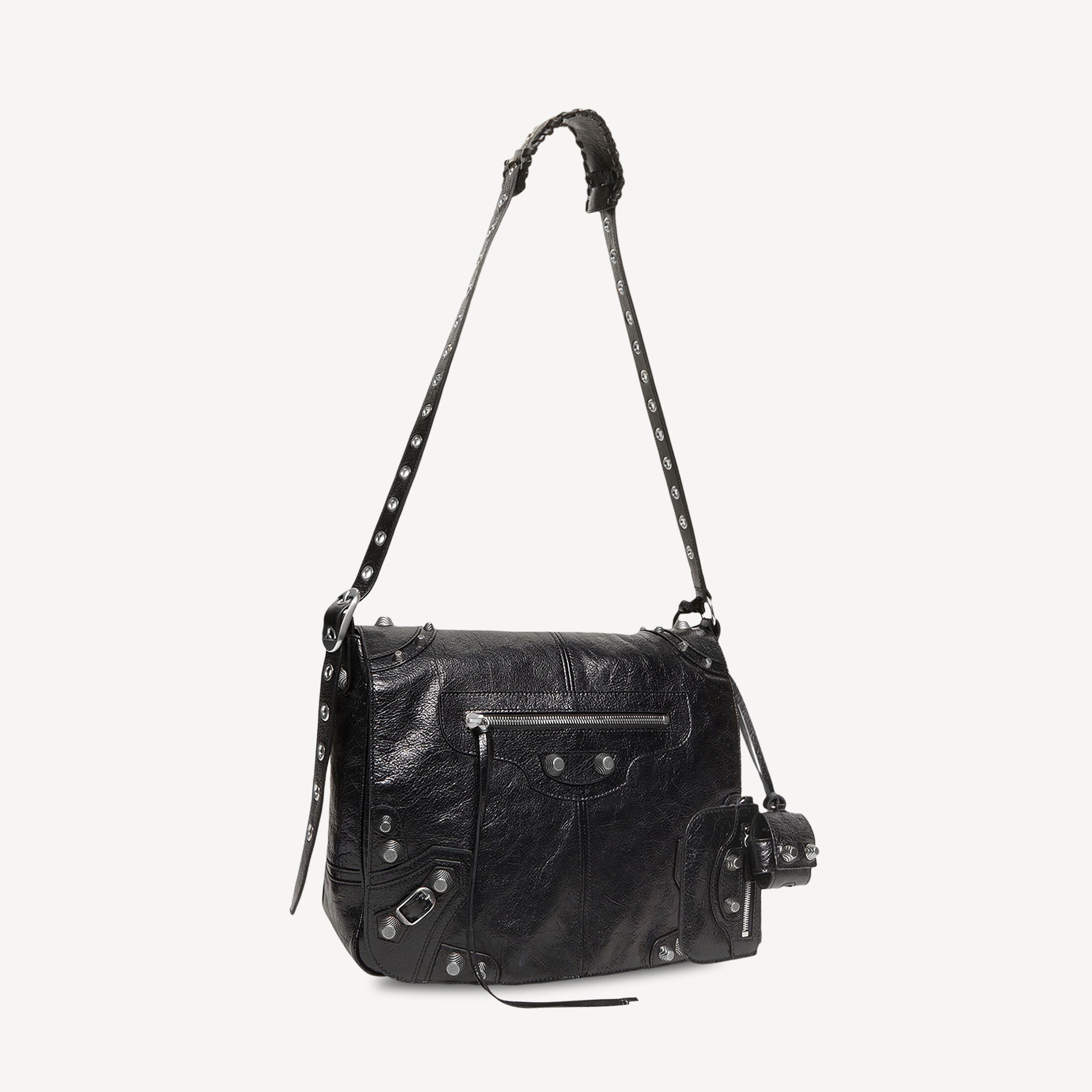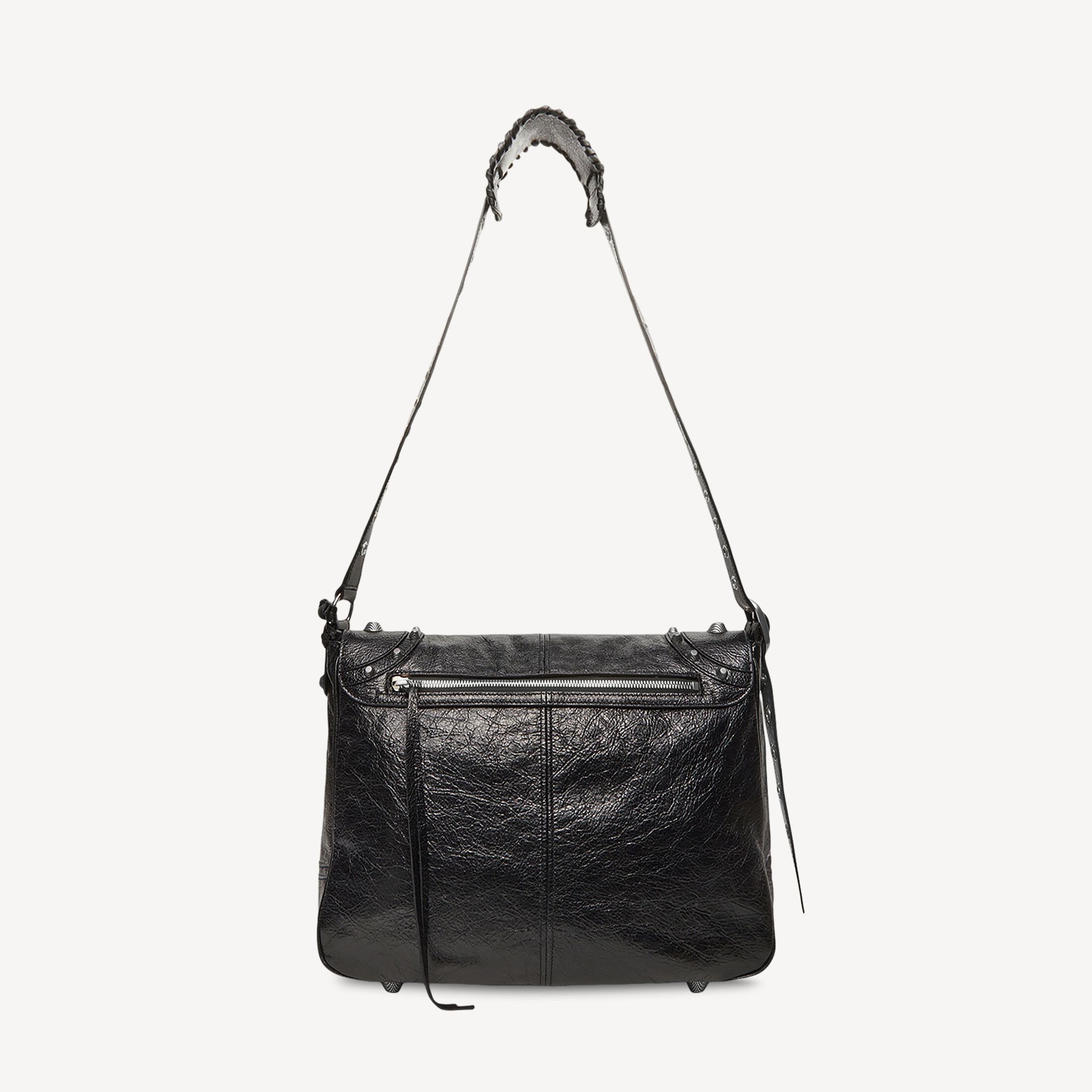 Le Cagole 黑色细纹羊皮革中号邮差包,做旧银色金属配件此商品支持花呗分期• 尺寸:长32 x 高25 x 宽11厘米