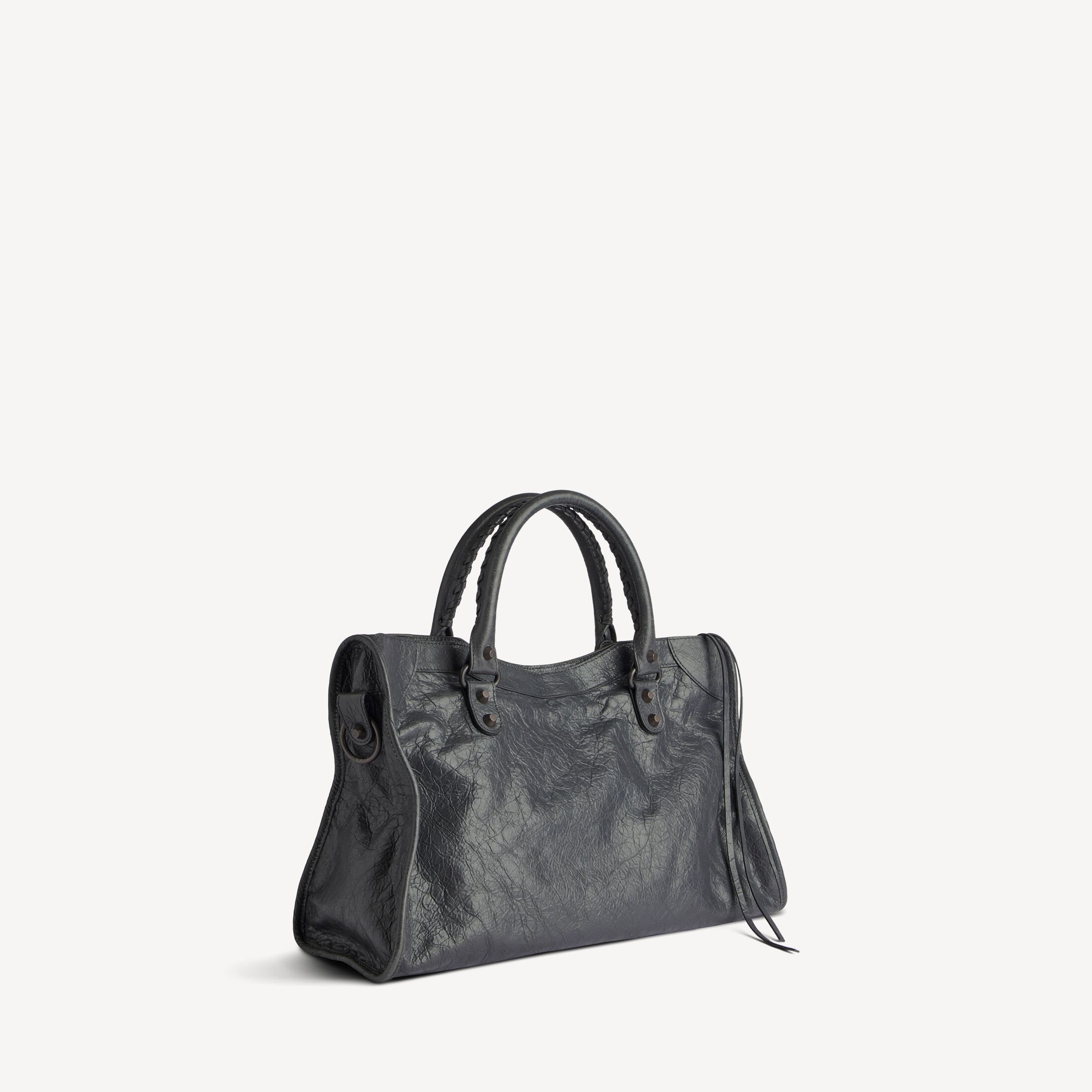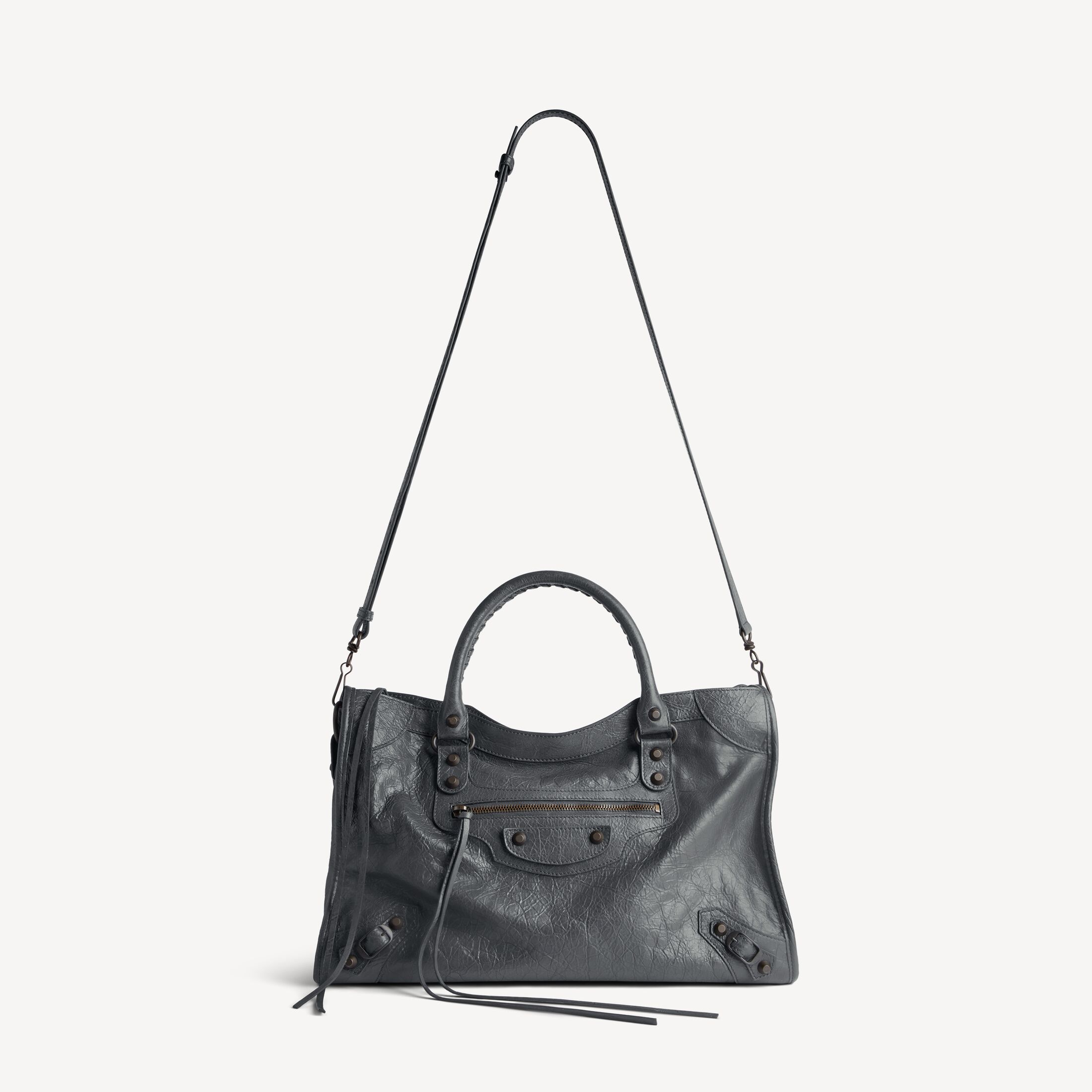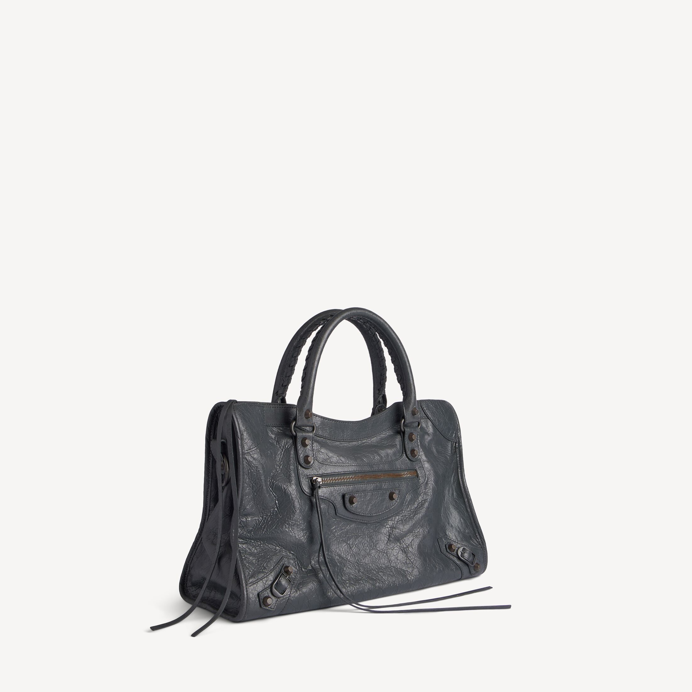 Le City火山岩色细纹羊皮革中号手袋,饰以黄铜金属配件此商品支持花呗分期产品细节
