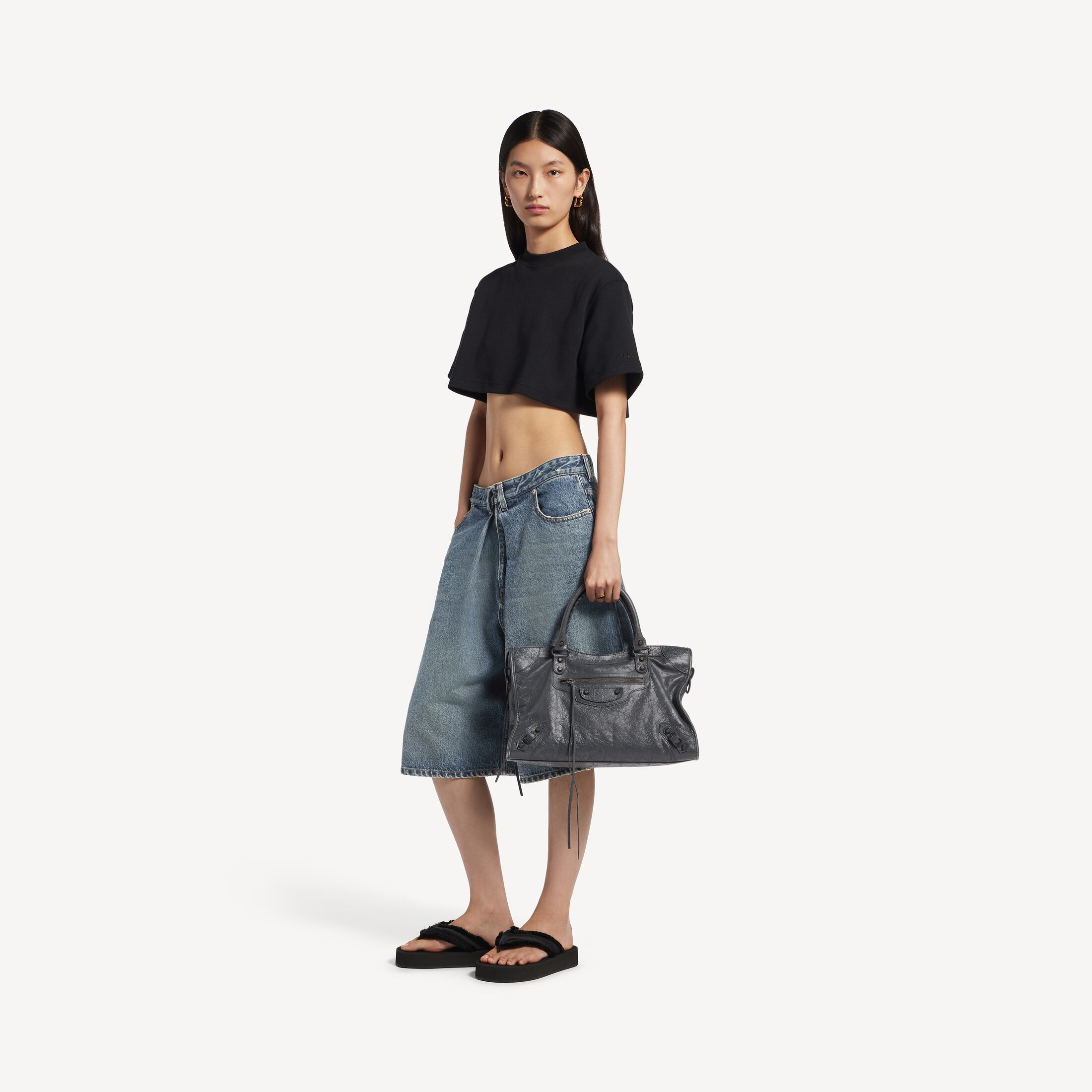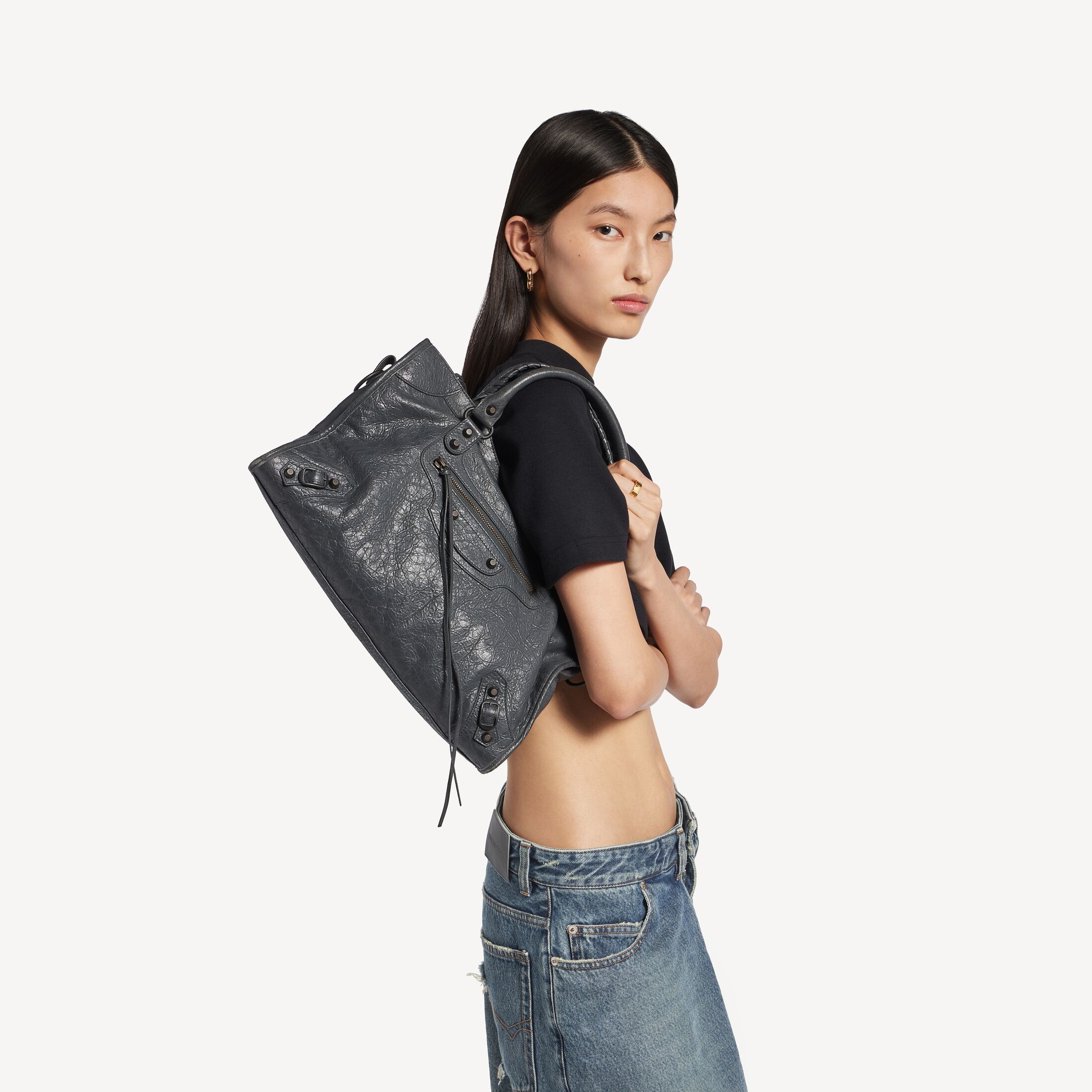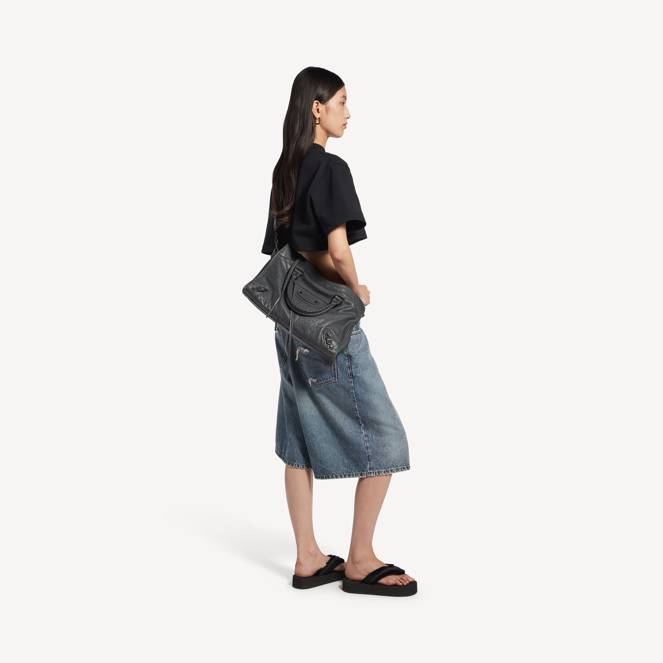 Le City火山岩色细纹羊皮革中号手袋,饰以黄铜金属配件此商品支持花呗分期产品细节
