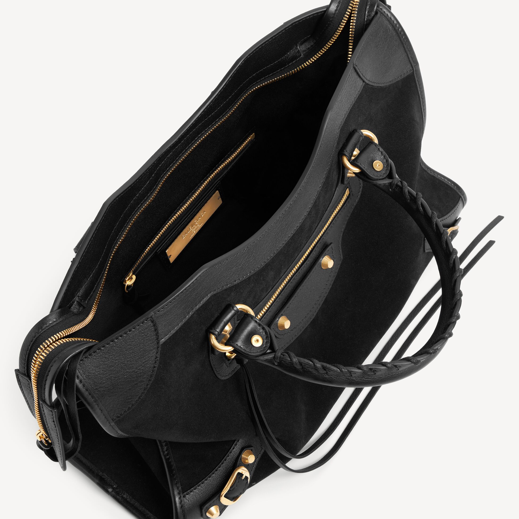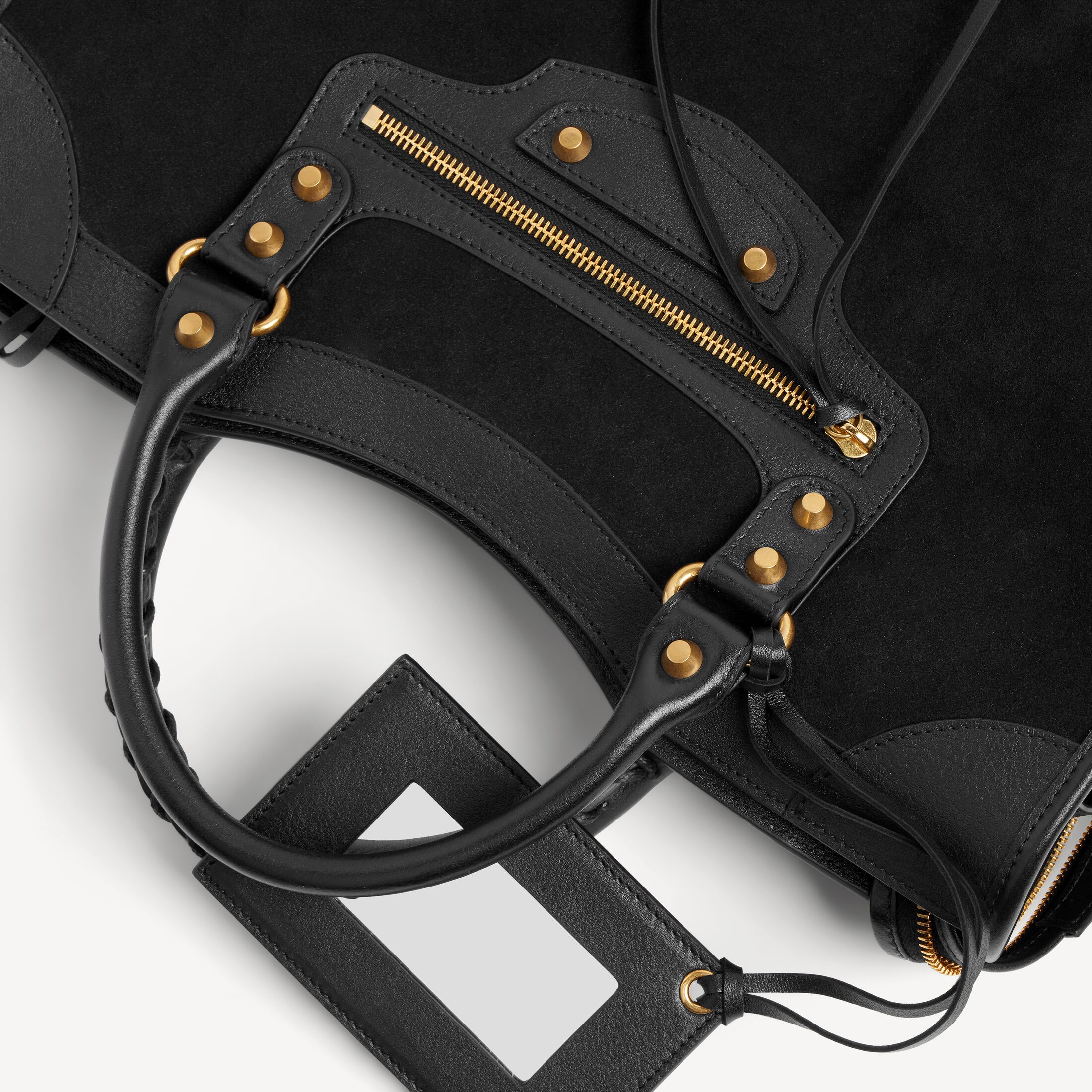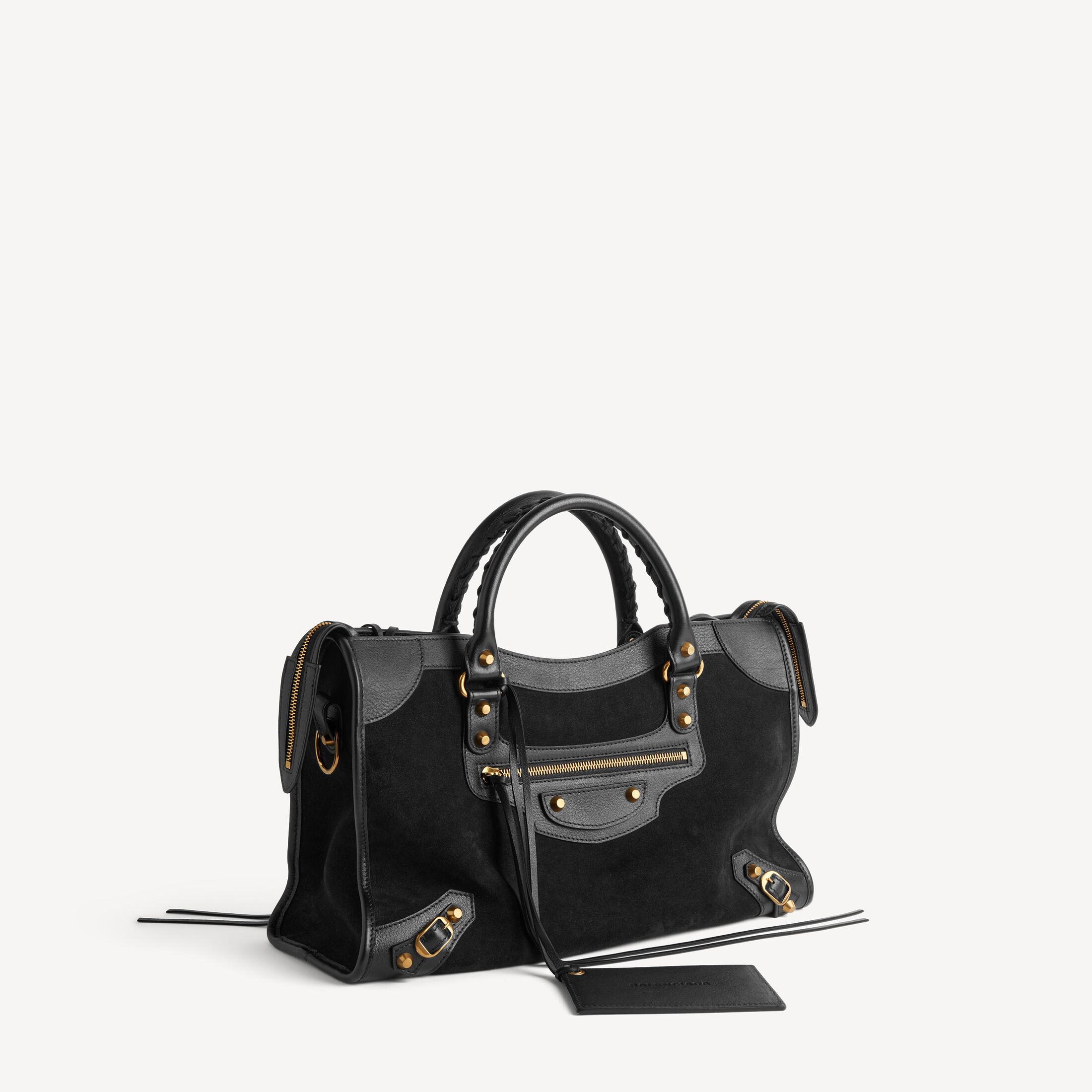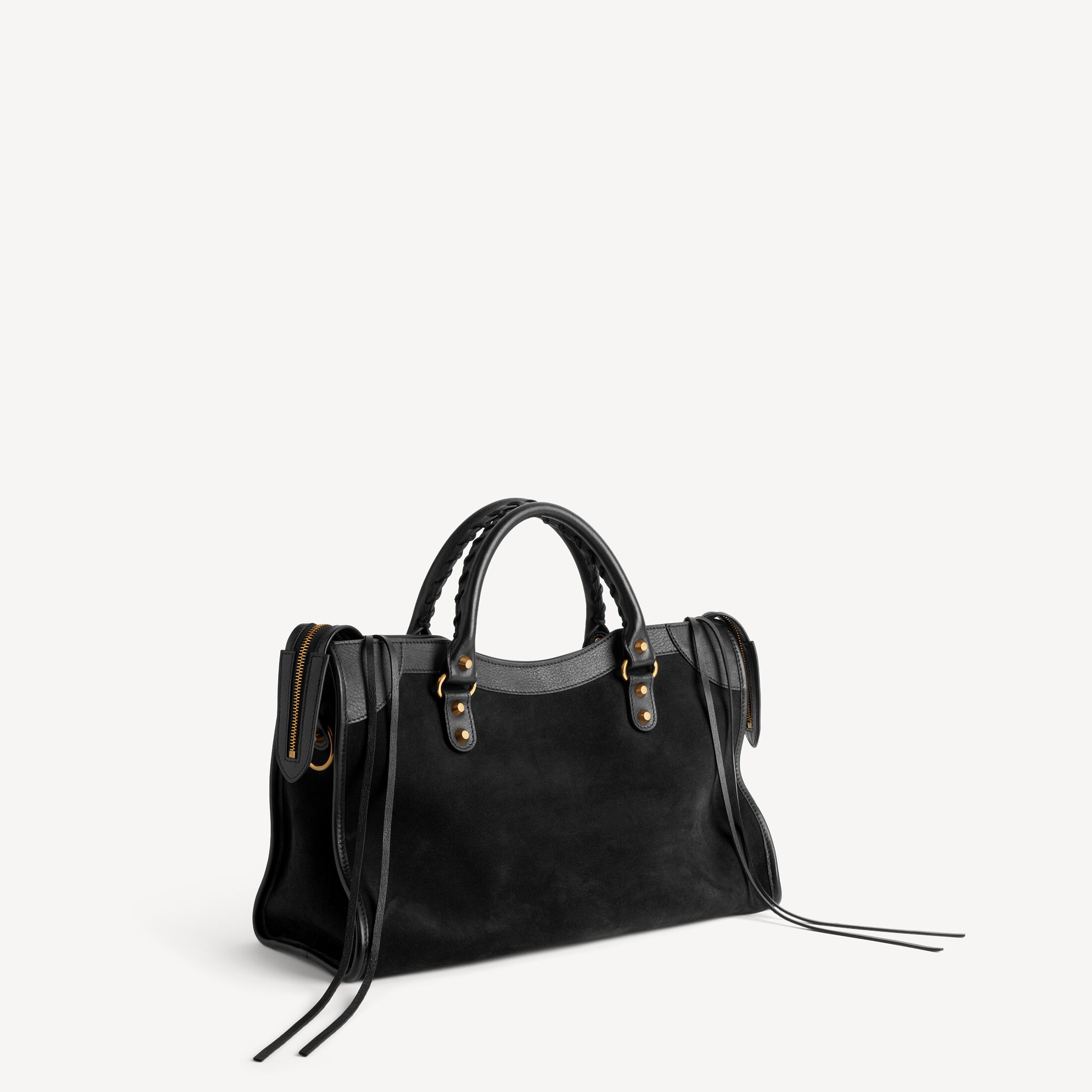 Le City黑色绒面牛皮革和光滑牛皮革中号手袋,饰以做旧金色金属配件,亮相于Balenciaga 2026夏季系列Look 18。此商品支持花呗分期产品细节