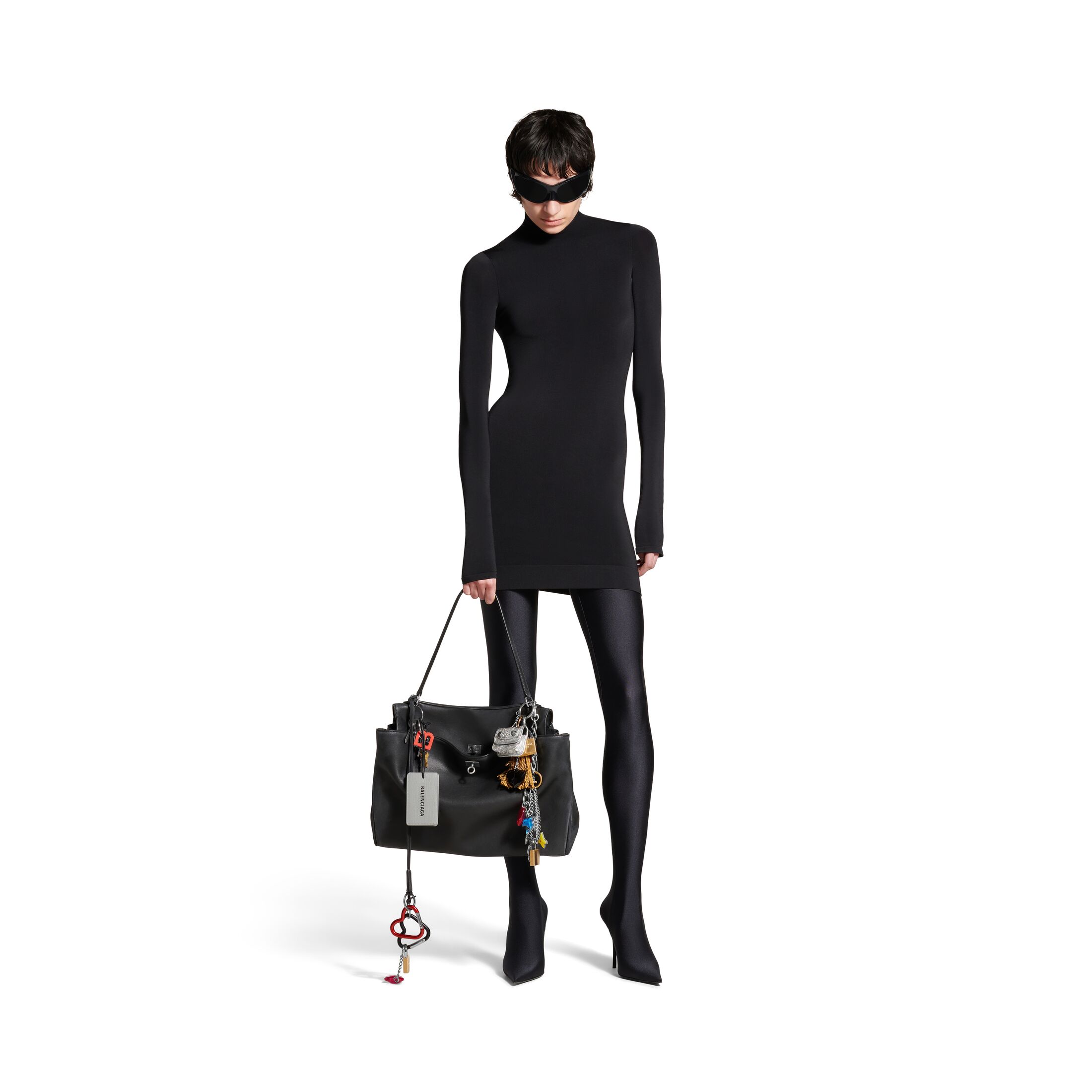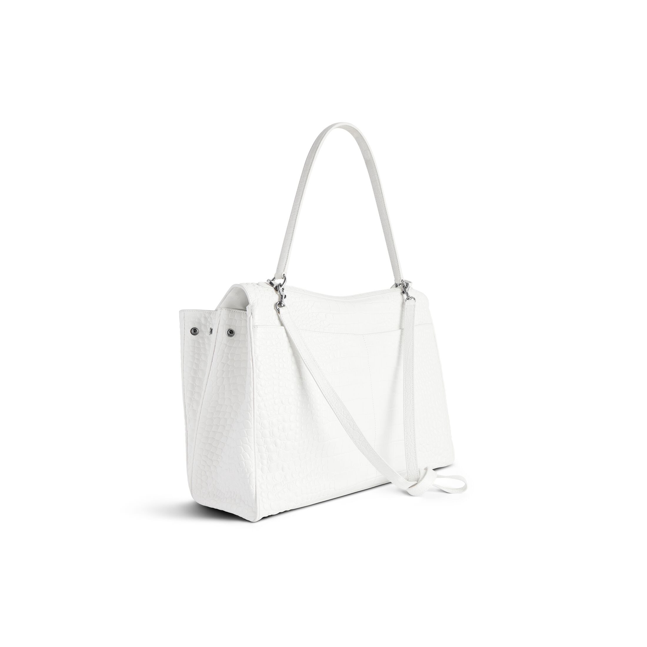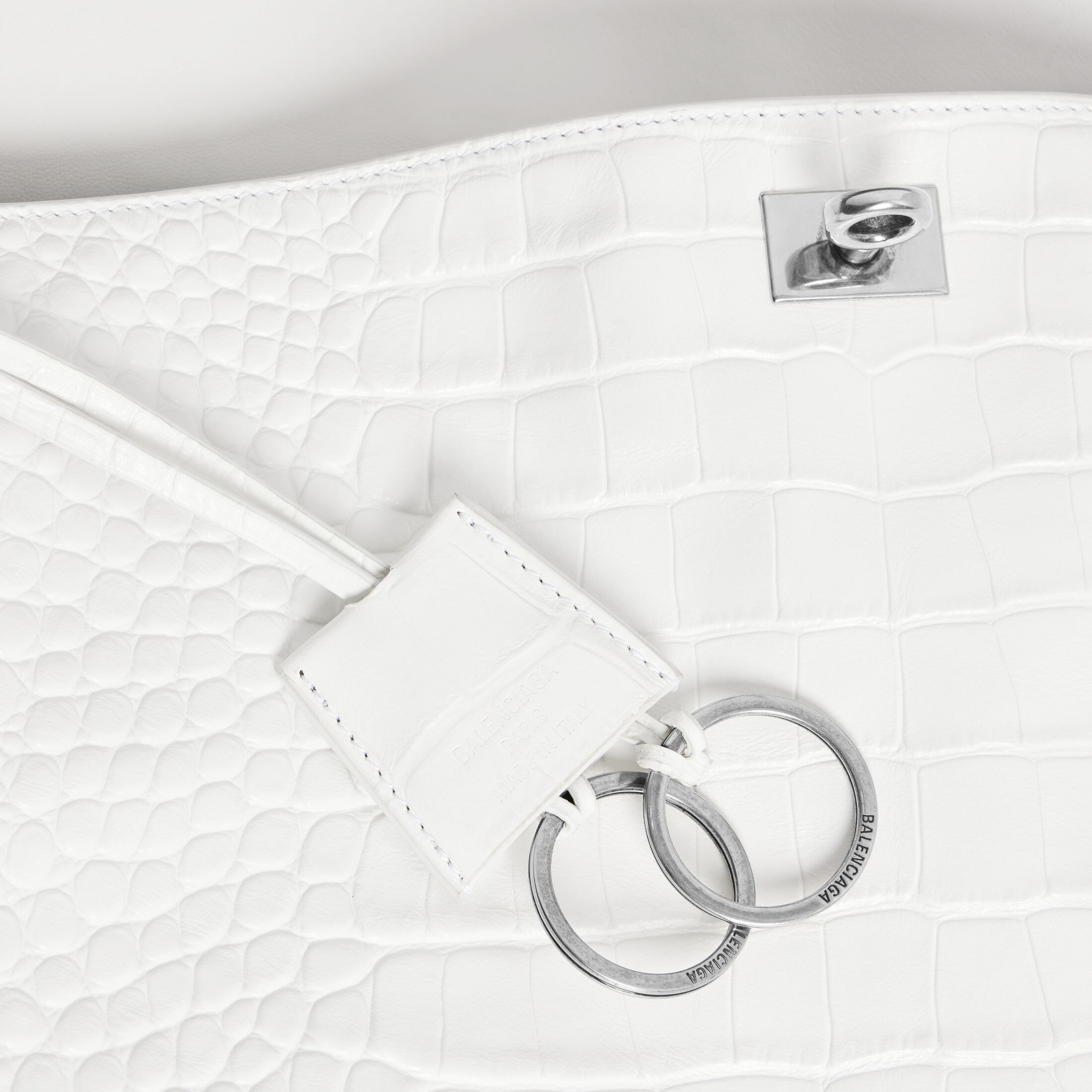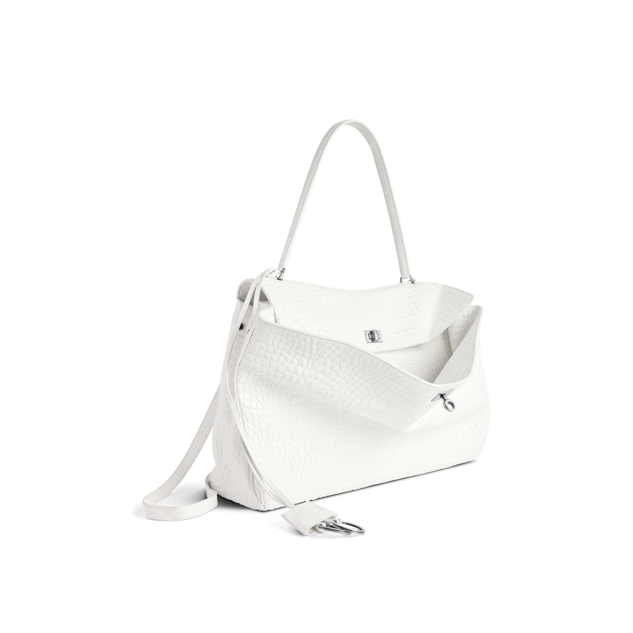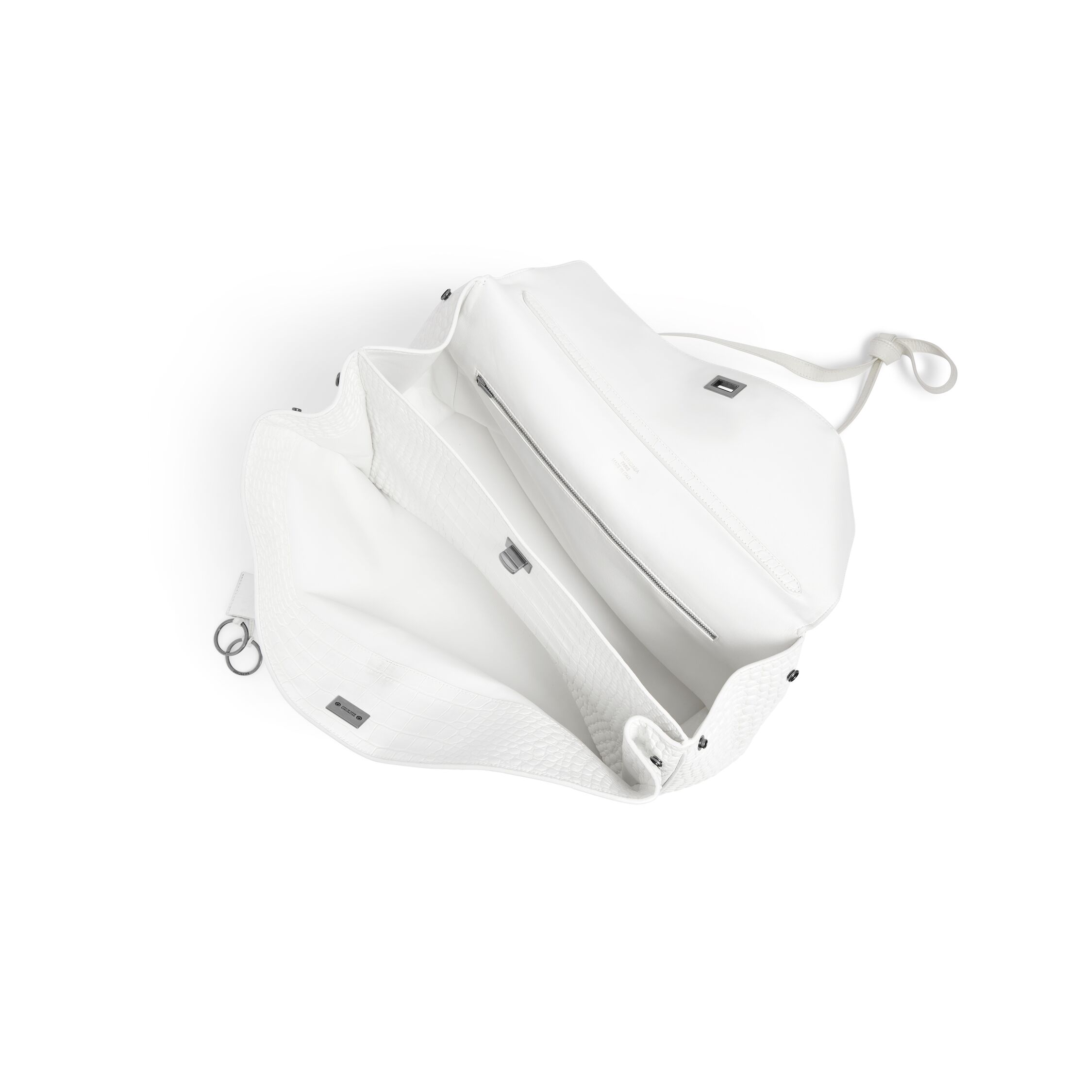 Rodeo白色柔软鳄鱼纹压纹牛皮革大号手提包,饰以做旧银色金属配件,亮相于Balenciaga 2024秋季系列Look 43。 此商品支持花呗分期• 柔软鳄鱼纹压纹牛皮革