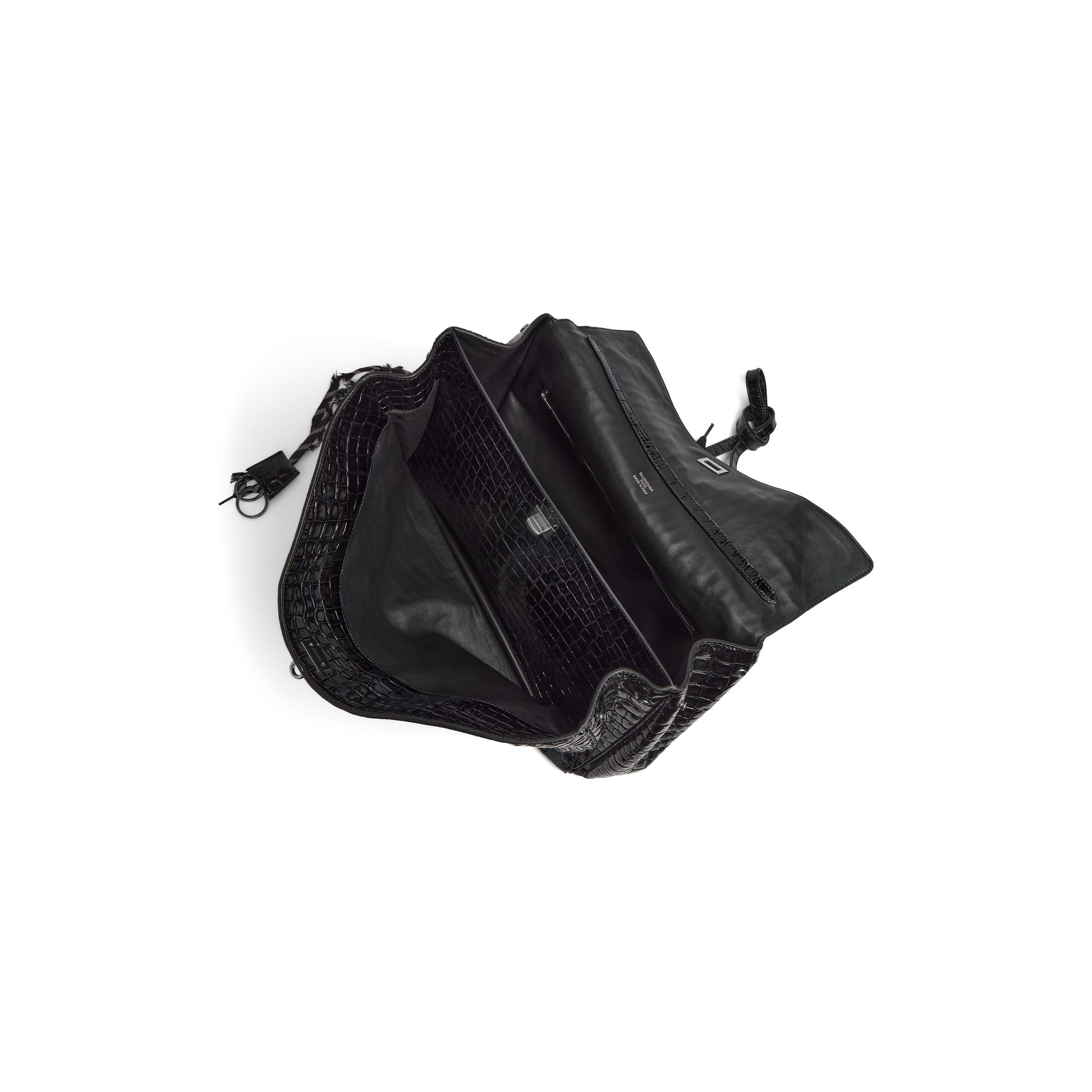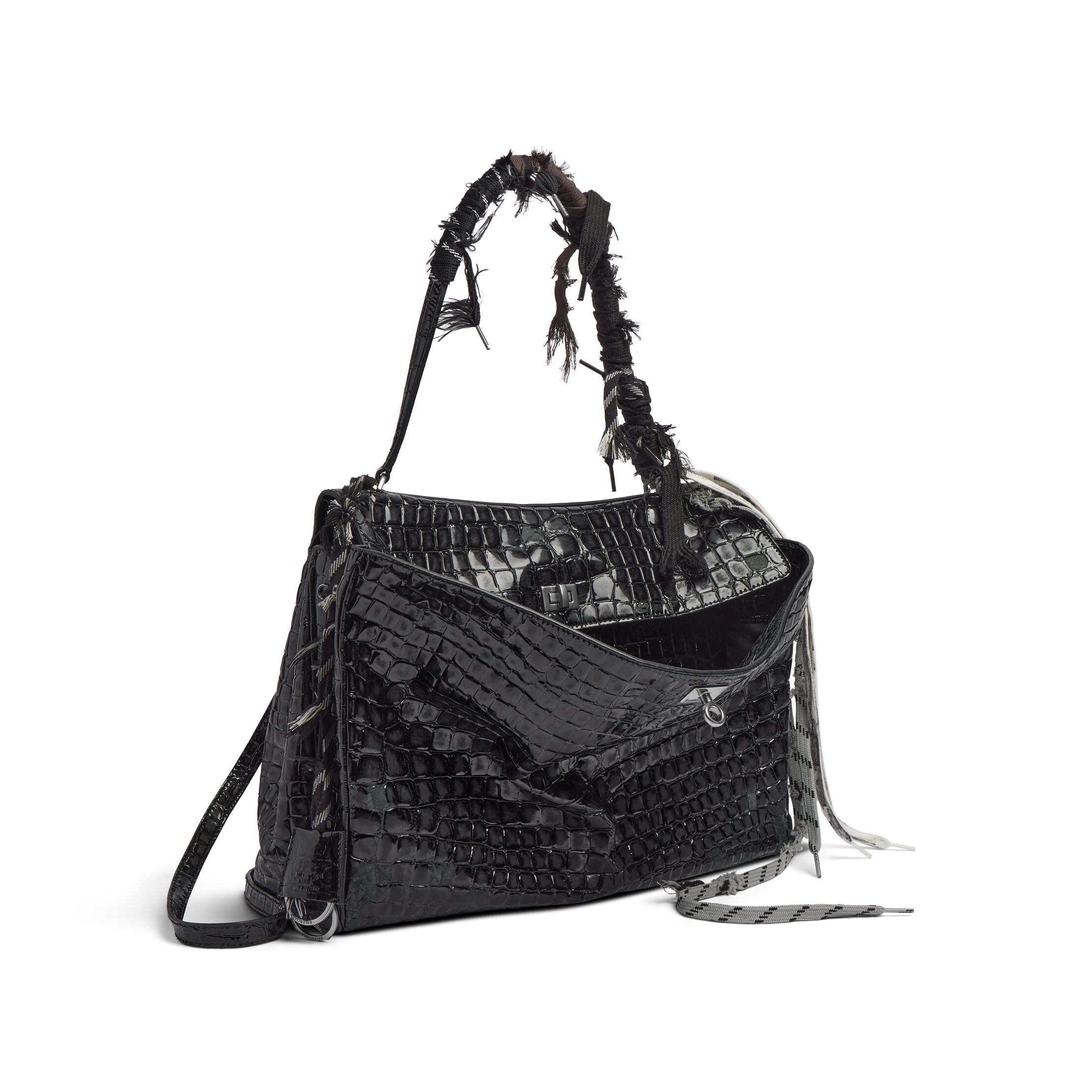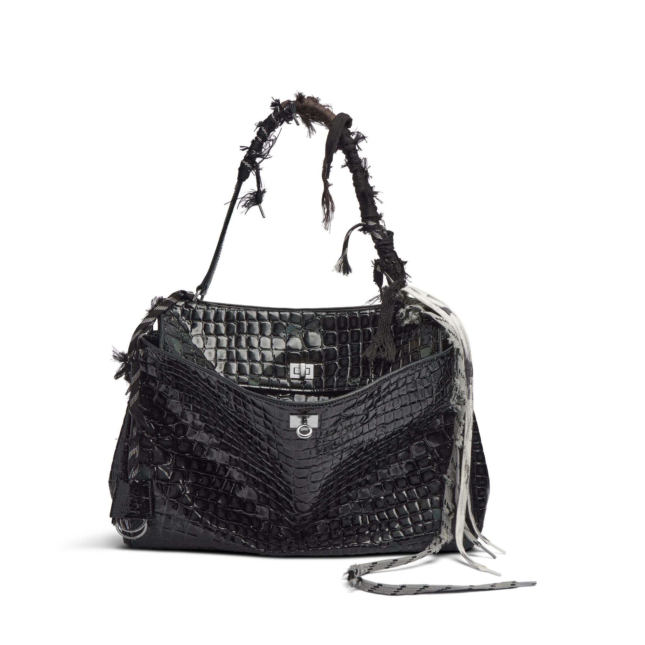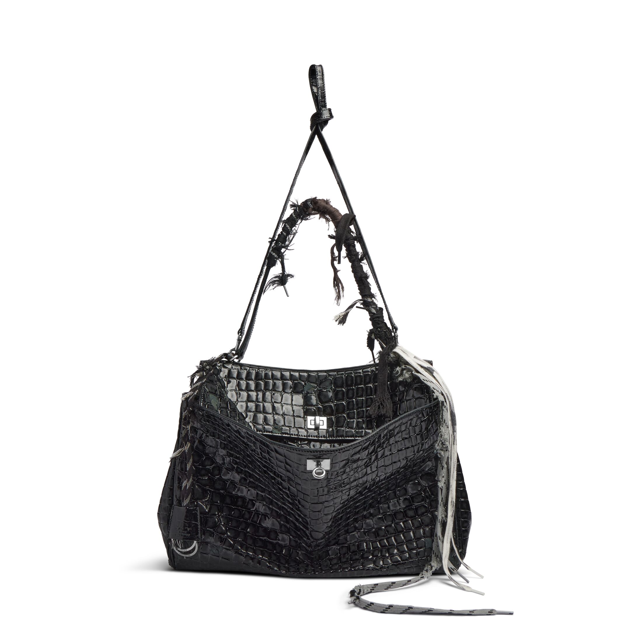 Rodeo黑色做旧亮面鱼纹压纹牛皮革大号手提包,配以破坏款鞋带和做旧银色金属配件,亮相于Balenciaga 2025春季系列Look 30。此商品支持花呗分期
