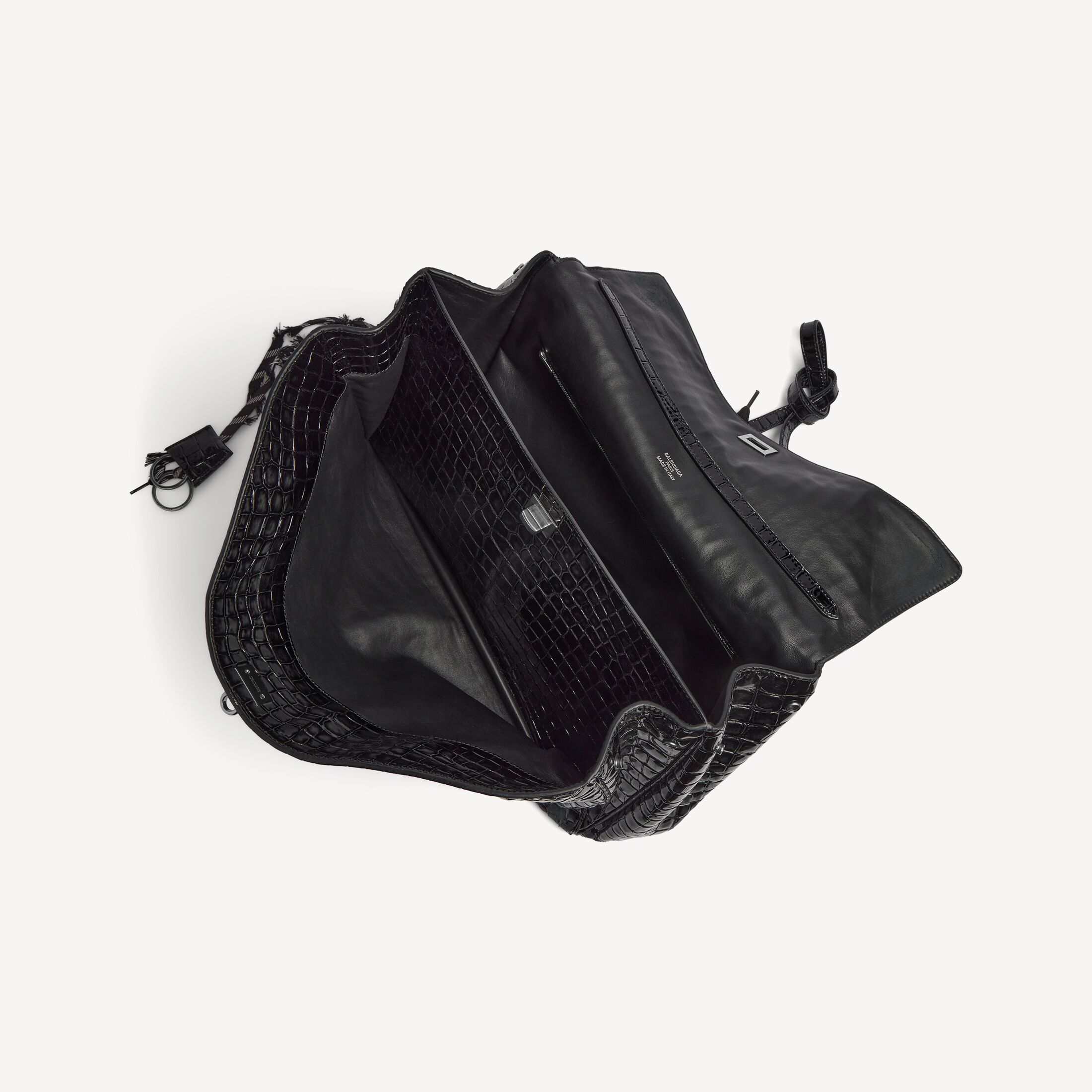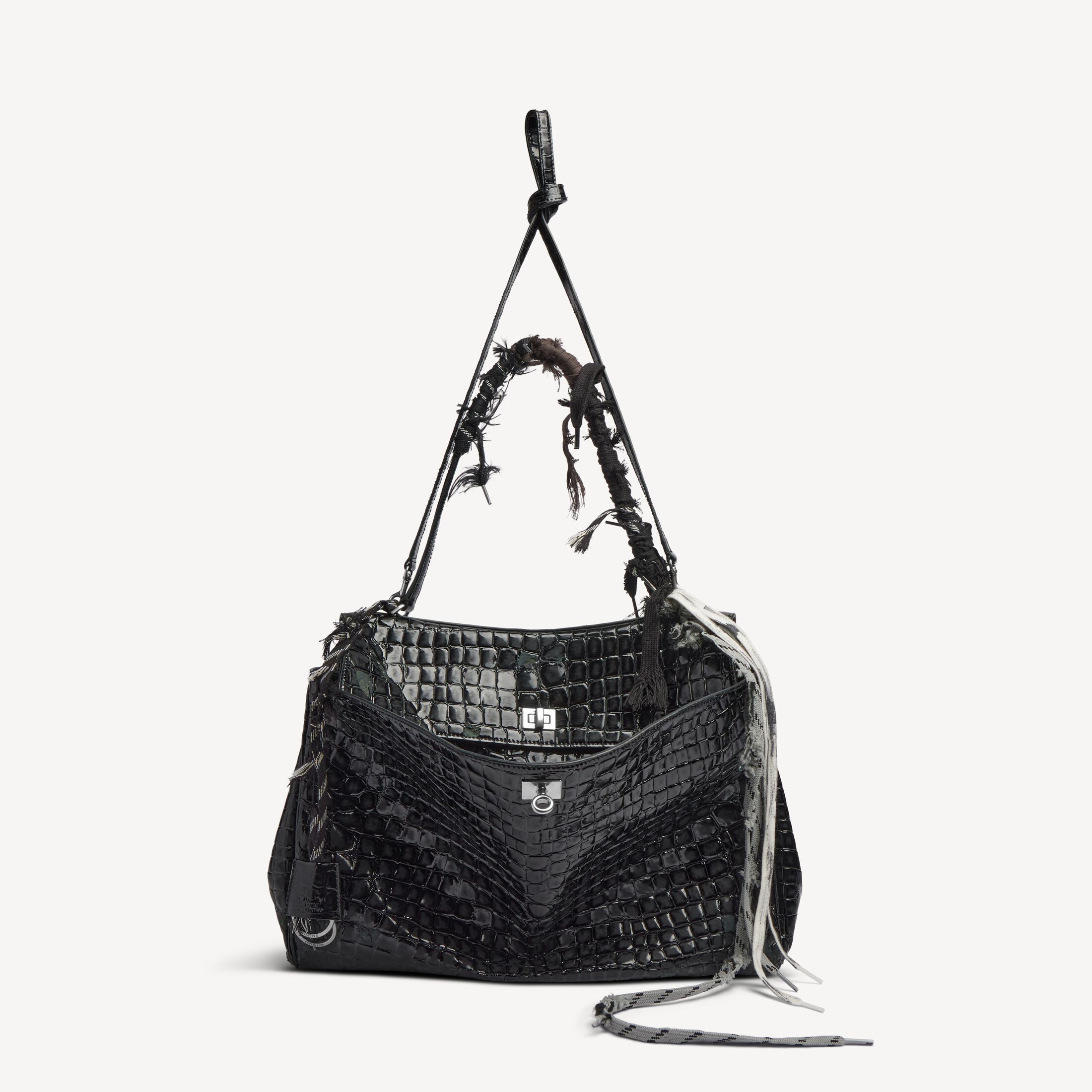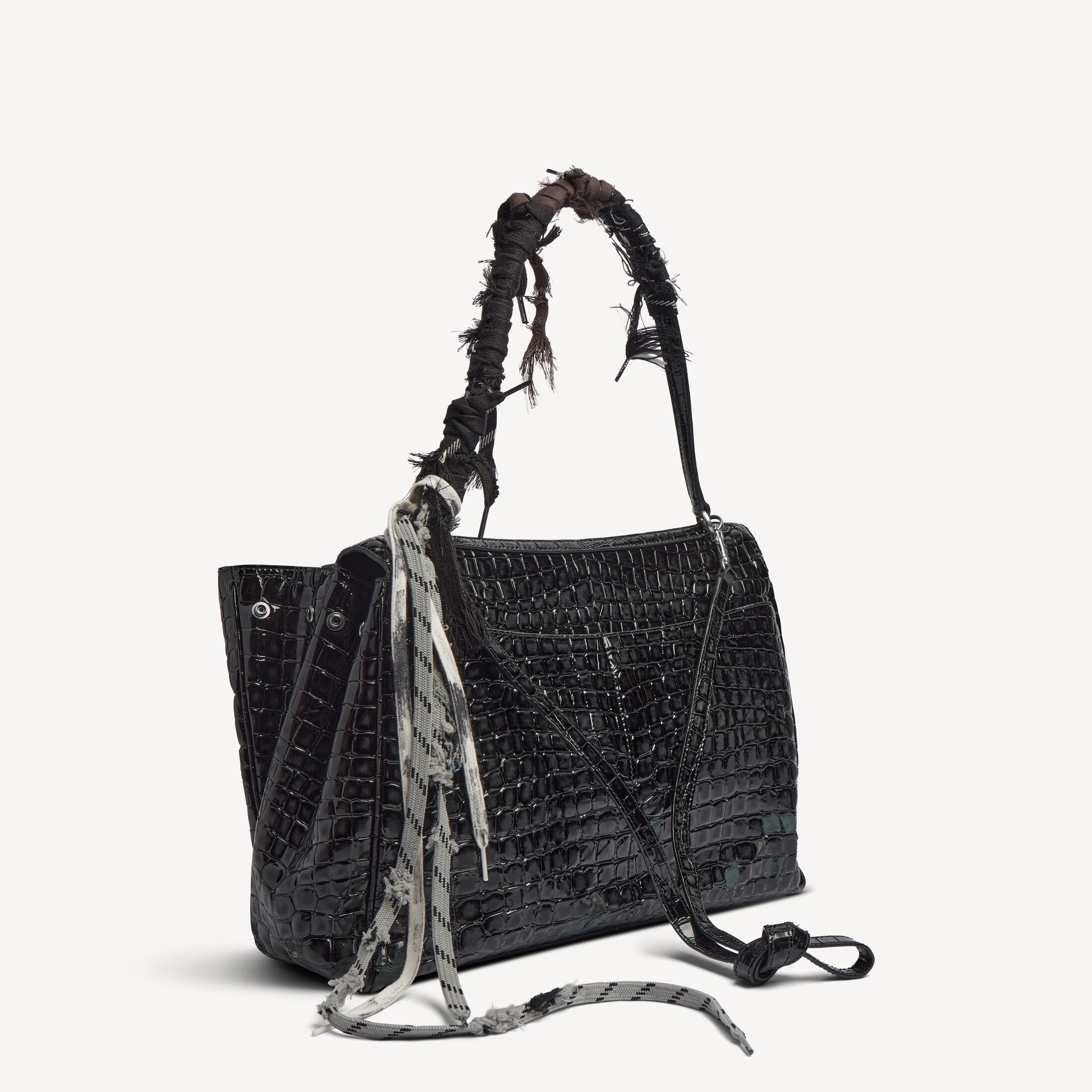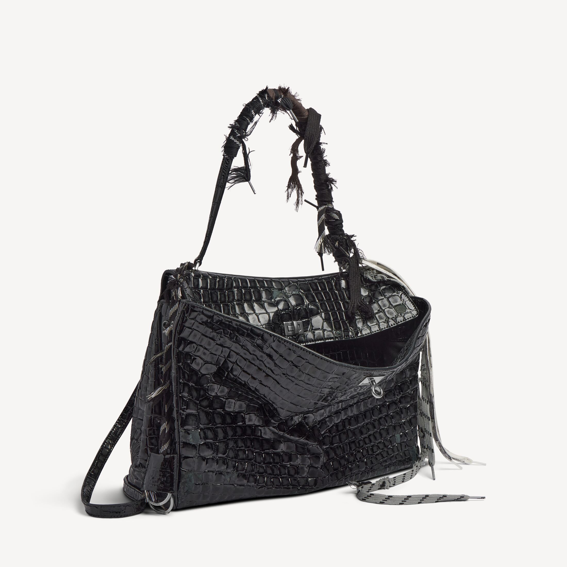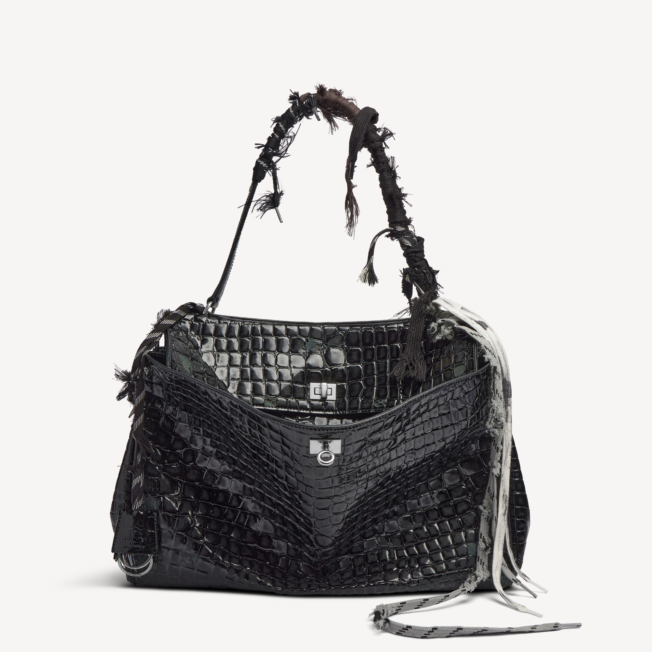 Rodeo黑色做旧亮面鱼纹压纹牛皮革大号手提包,配以破坏款鞋带和做旧银色金属配件,亮相于Balenciaga 2025春季系列Look 30。此商品支持花呗分期产品细节