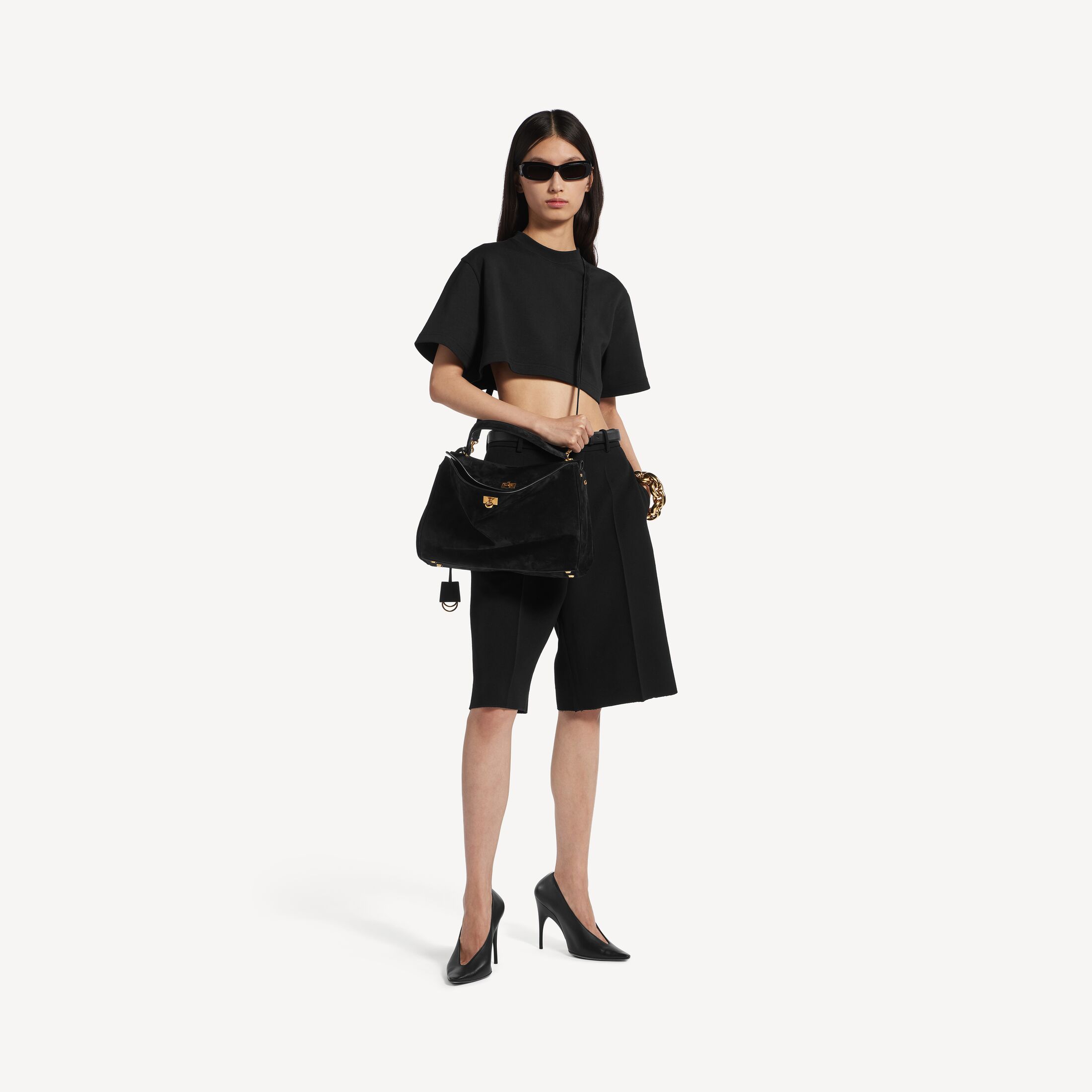 Rodeo黑色绒面牛皮革和光滑牛皮革中号手提包,饰以做旧金色金属配件此商品支持花呗分期产品细节