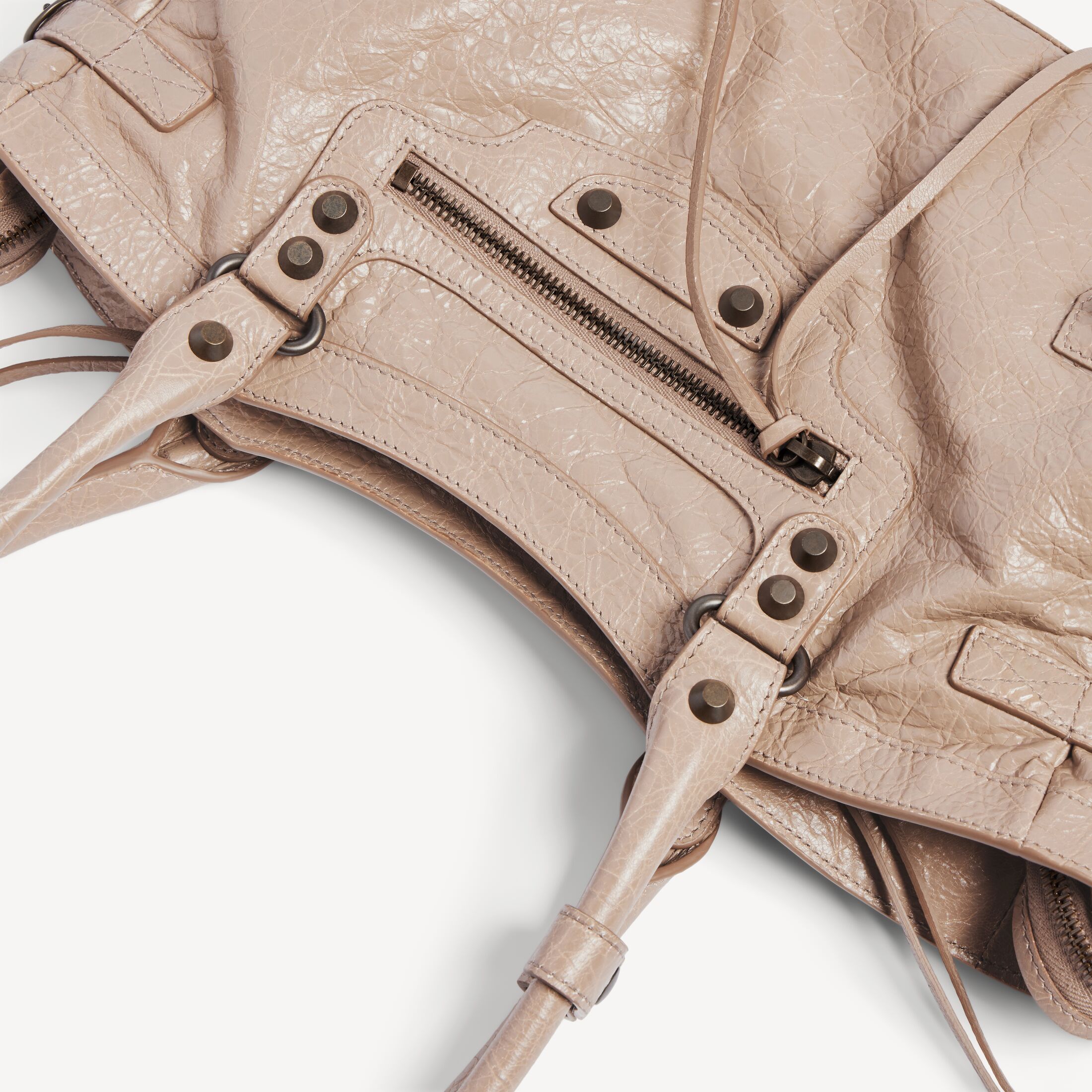 • 拉链开合,配以系结皮革拉链头